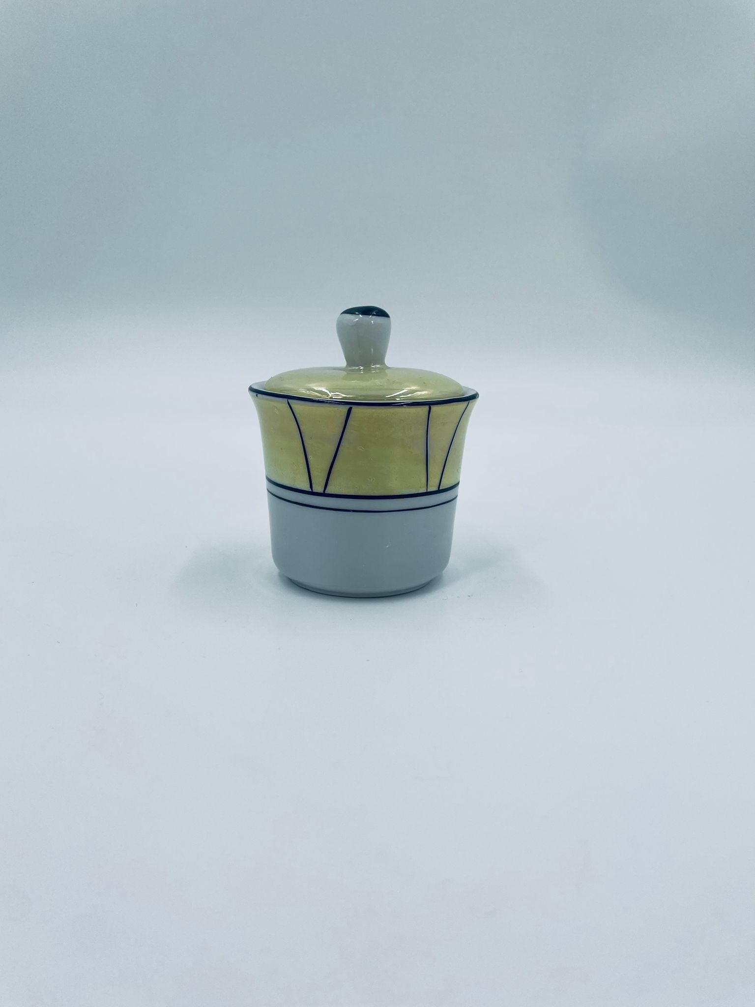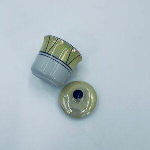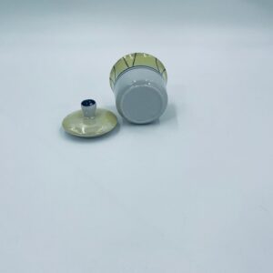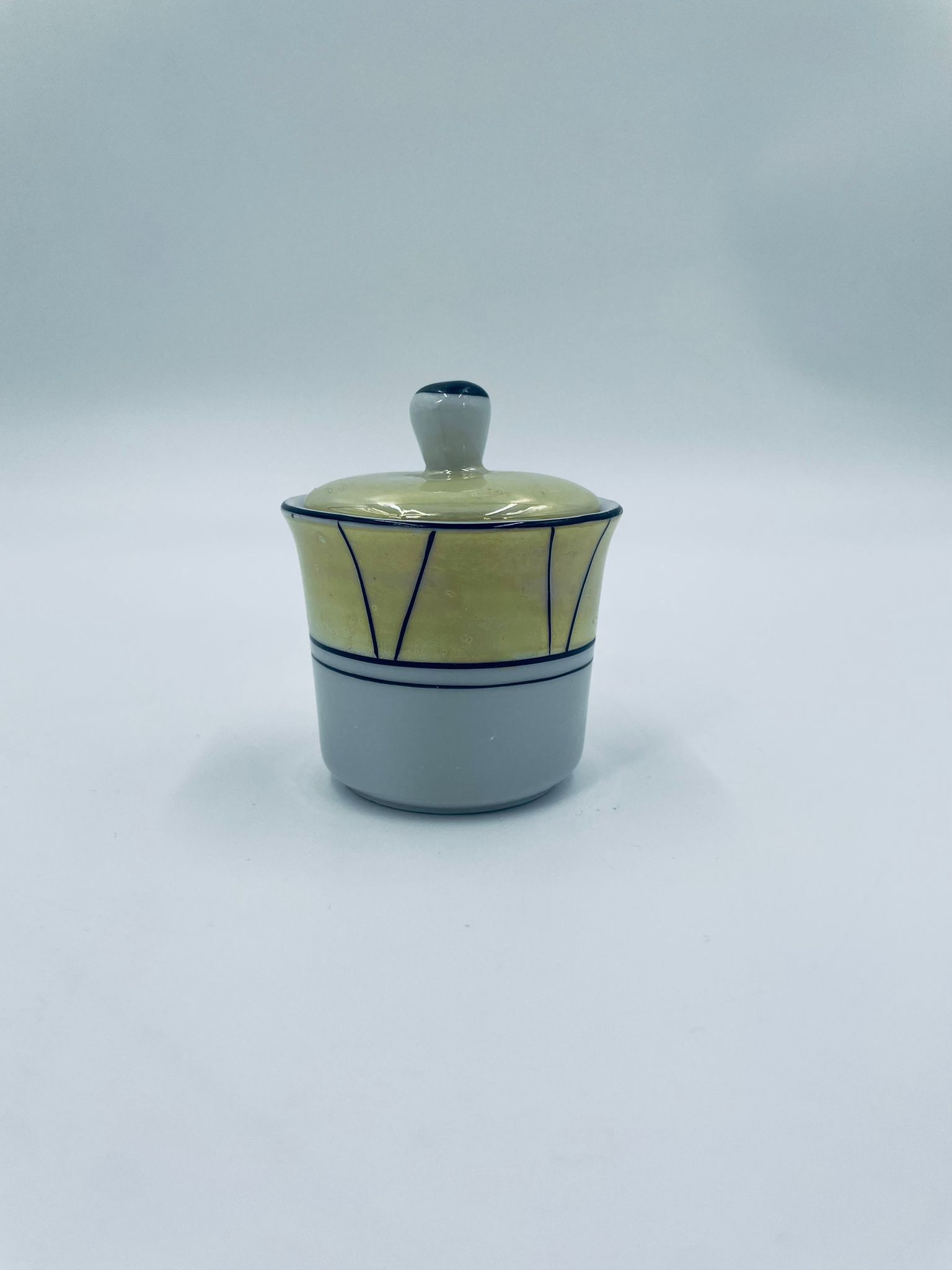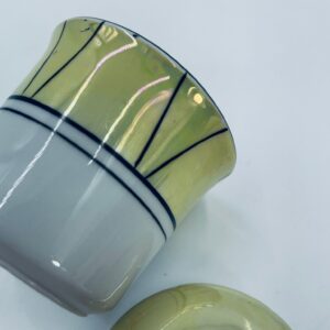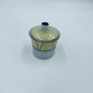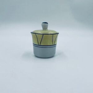 Cukiernica w stylu Vintage, wykonana z wysokiej jakości białej porcelany. Cukiernica z przykryciem, ozdobiona geometrycznym wzorem z żółtym, perłowym połyskiem. Posiada przetarcie.