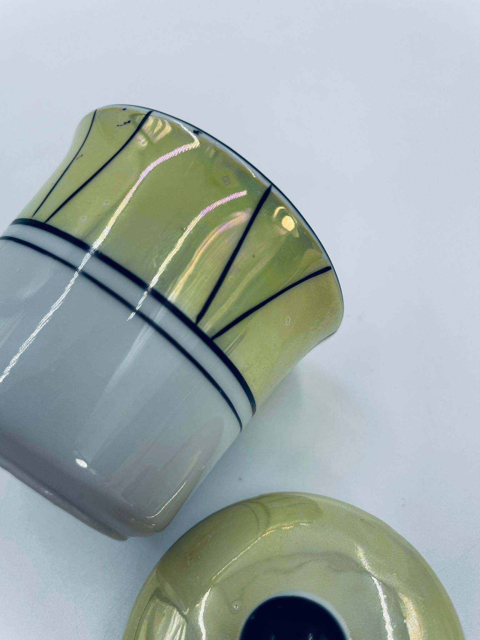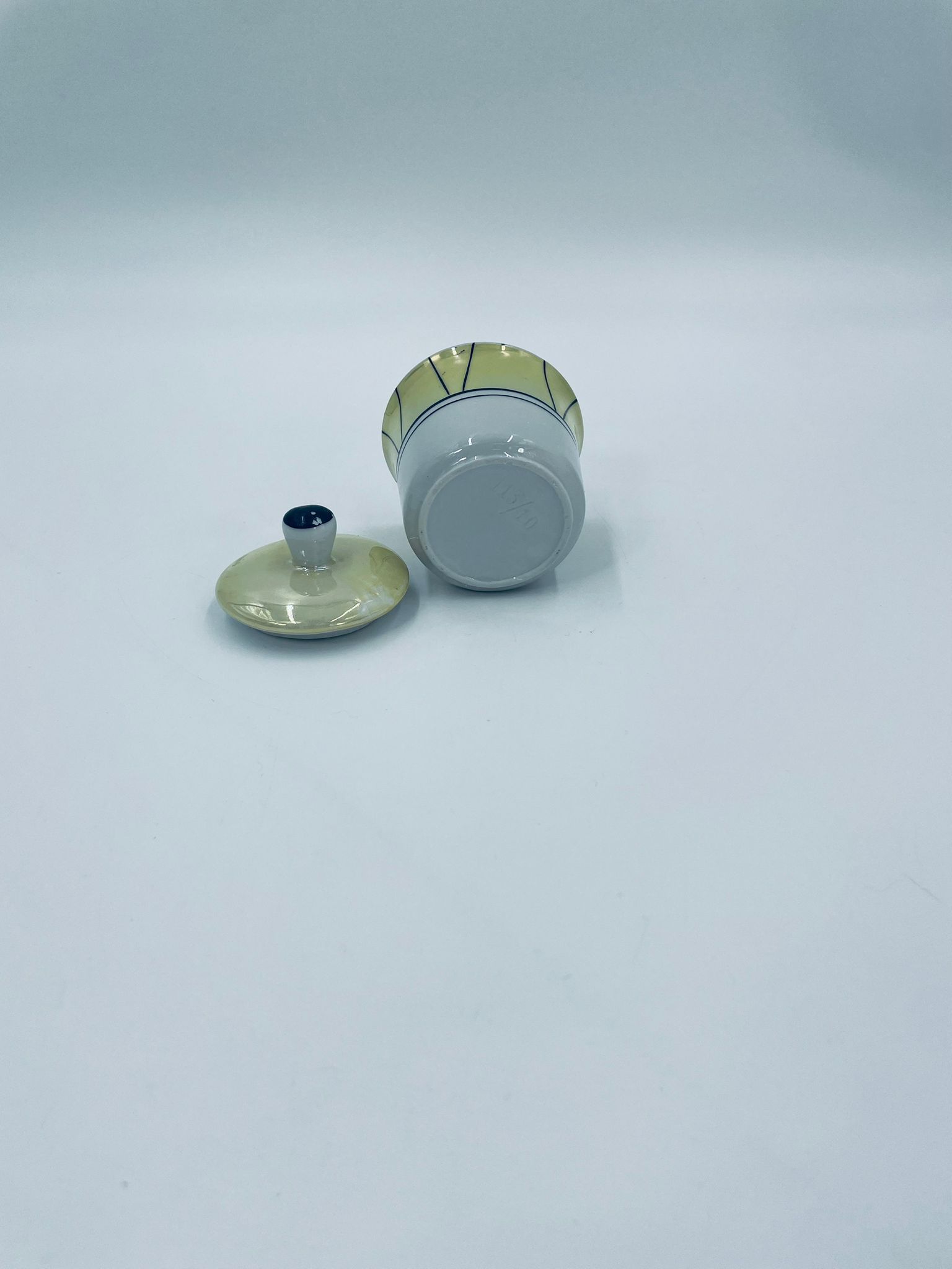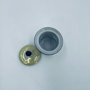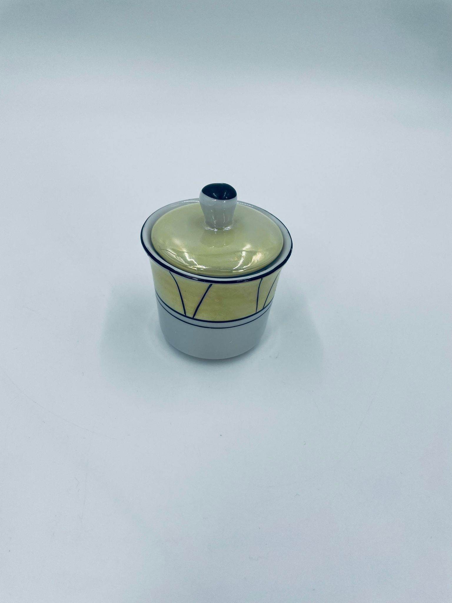 Cukiernica w stylu Vintage, wykonana z wysokiej jakości białej porcelany. Cukiernica z przykryciem, ozdobiona geometrycznym wzorem z żółtym, perłowym połyskiem. Posiada przetarcie.