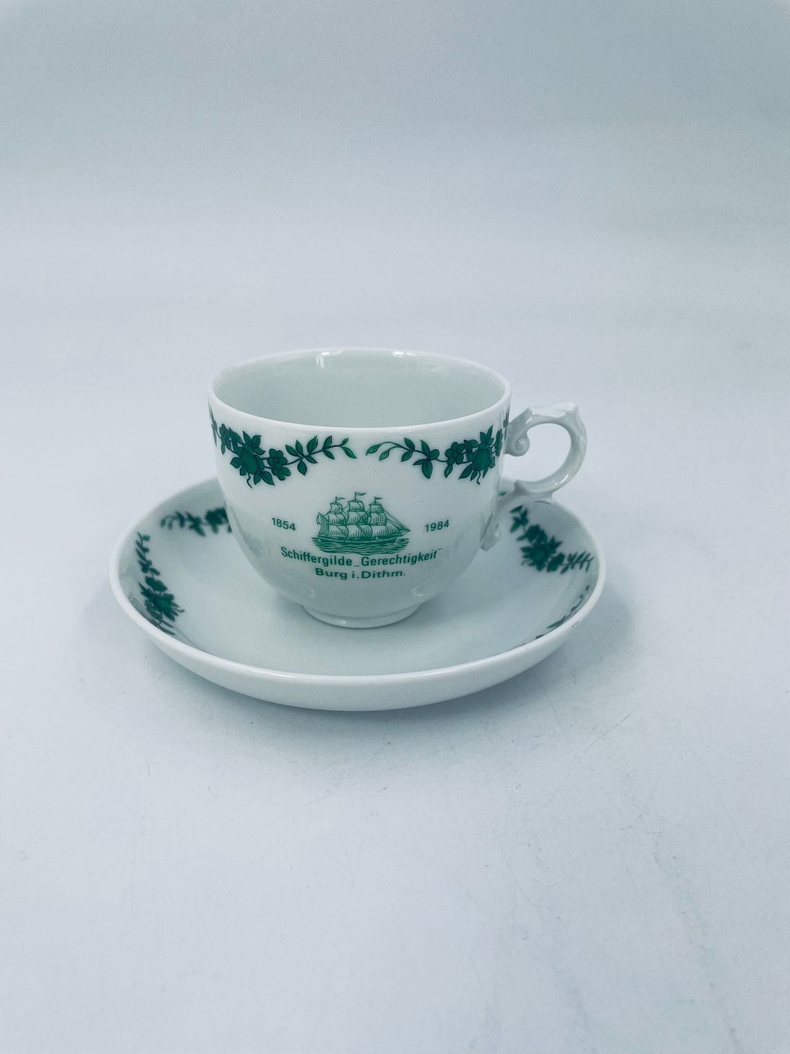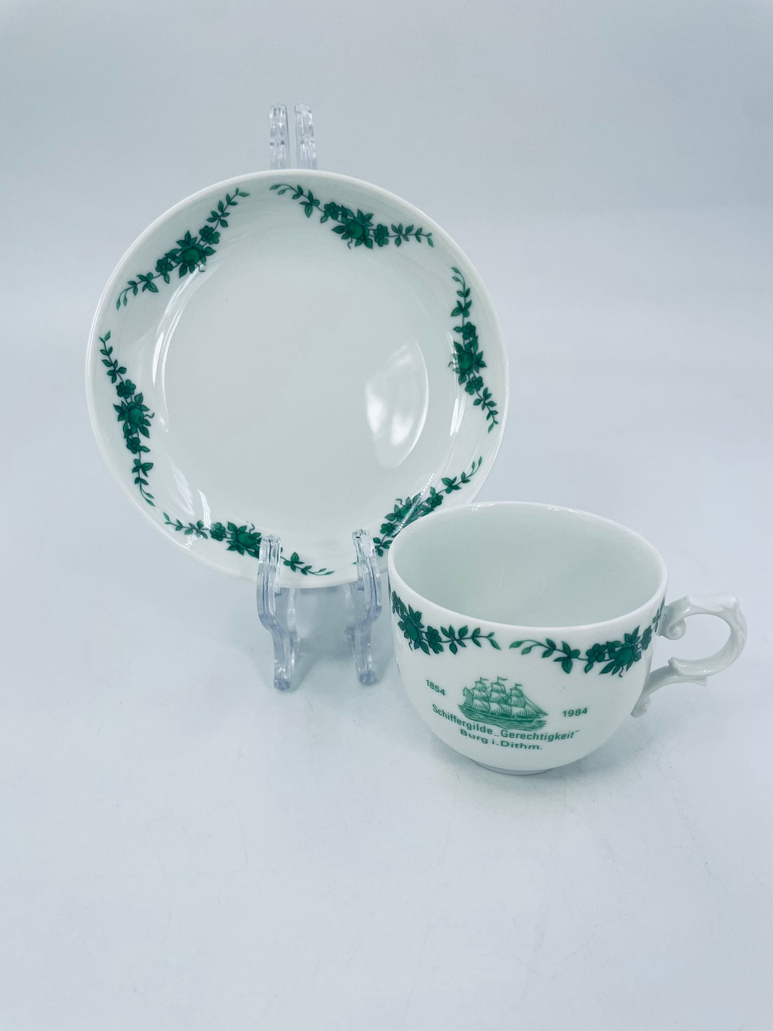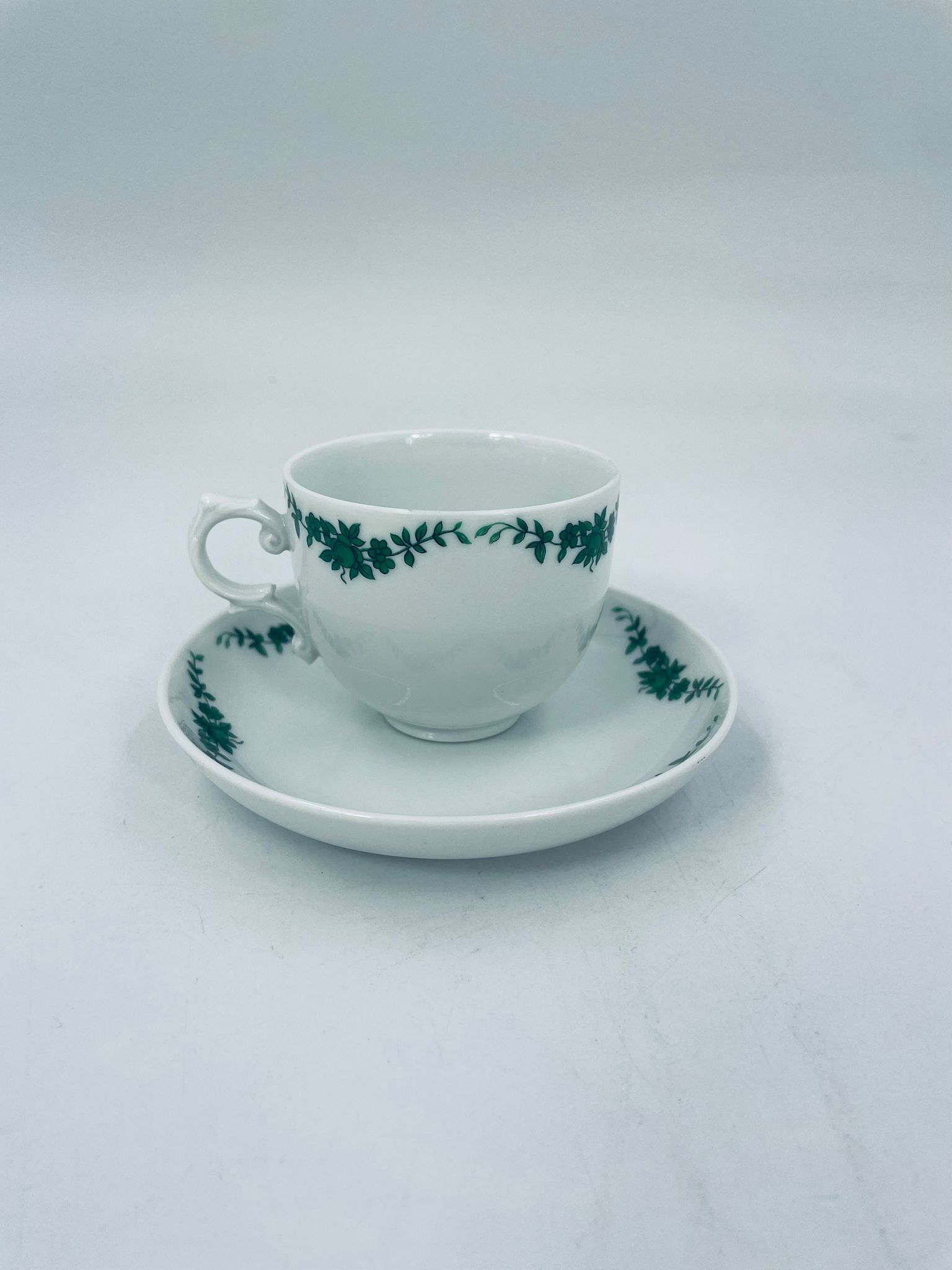 Fustenberg breakfast set. The cup and saucer are made of high-quality porcelain in white with a green flower motif. There is a ship motif on the cup.