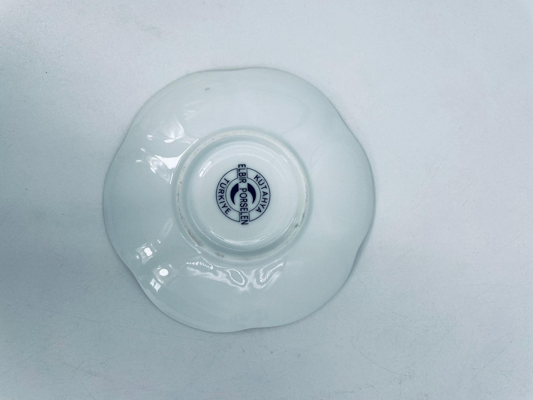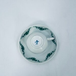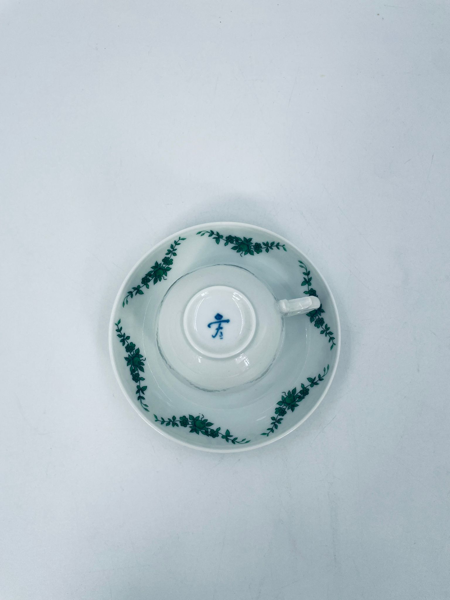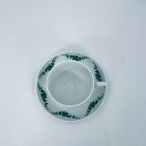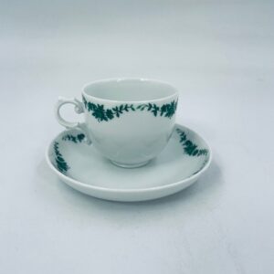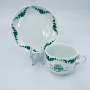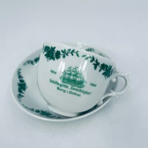 Fustenberg breakfast set. The cup and saucer are made of high-quality porcelain in white with a green flower motif. There is a ship motif on the cup.