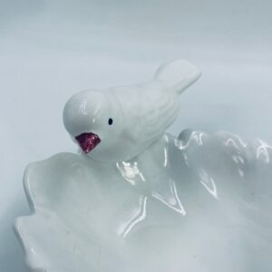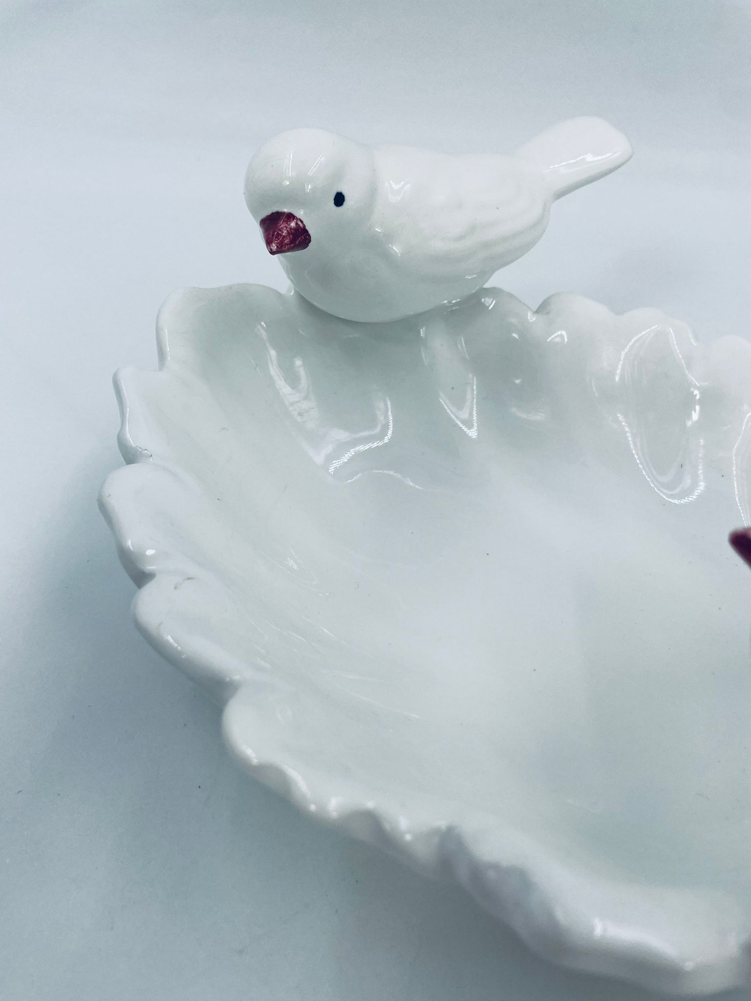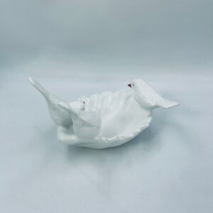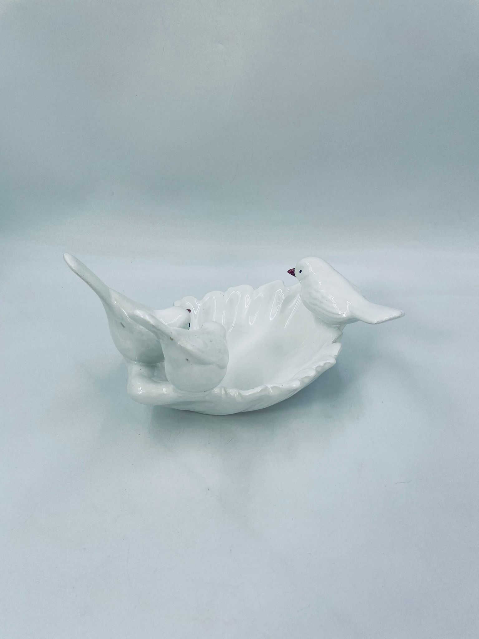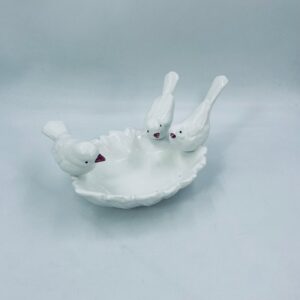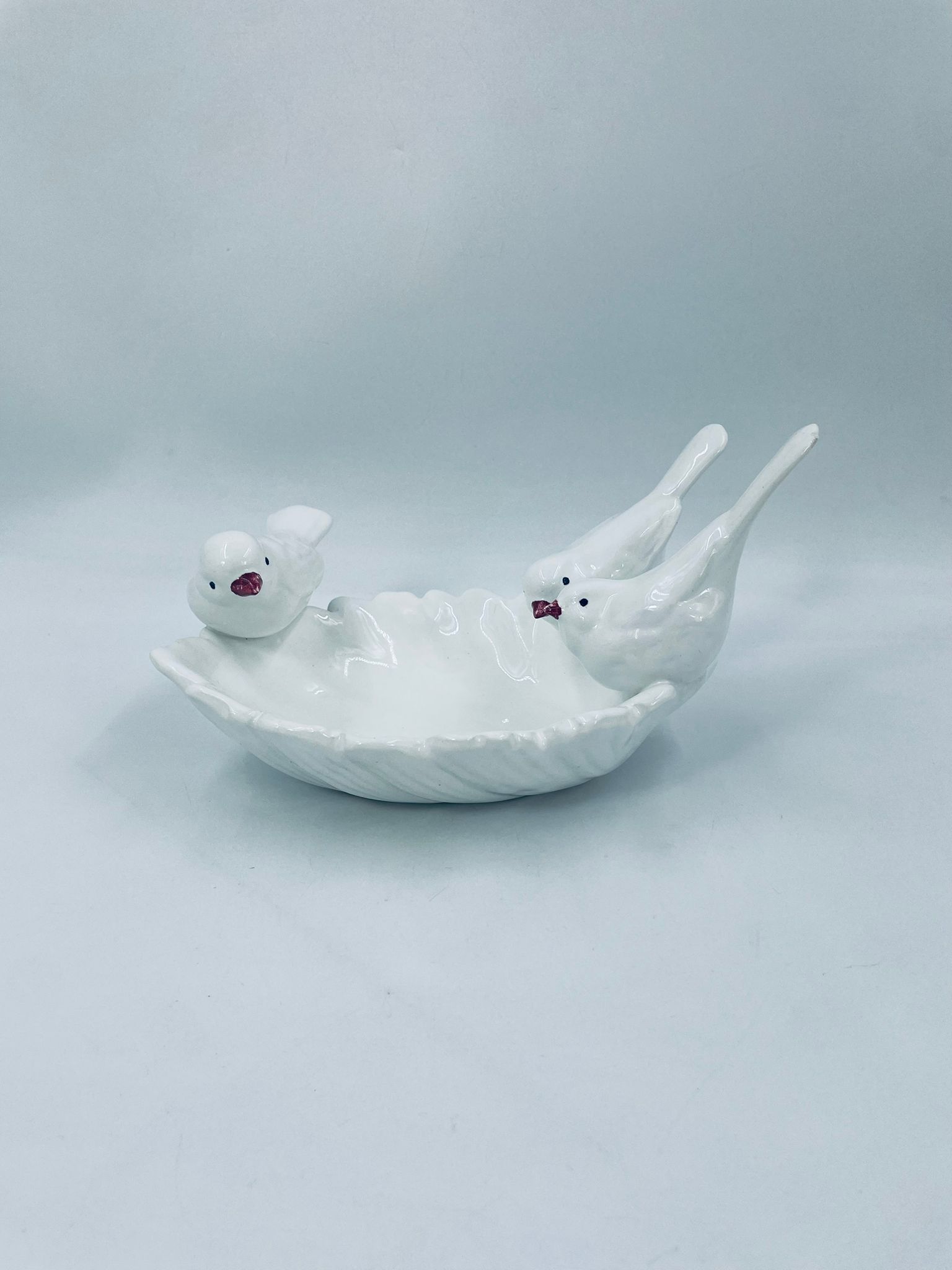 A decorative bowl in vintage style, made of white ceramic. The bowl is shaped like a leaf with three bird figurines placed on it. The bowl can be used to store jewellery, keys, sweets or other small items. It has a chip on the bird's tail.