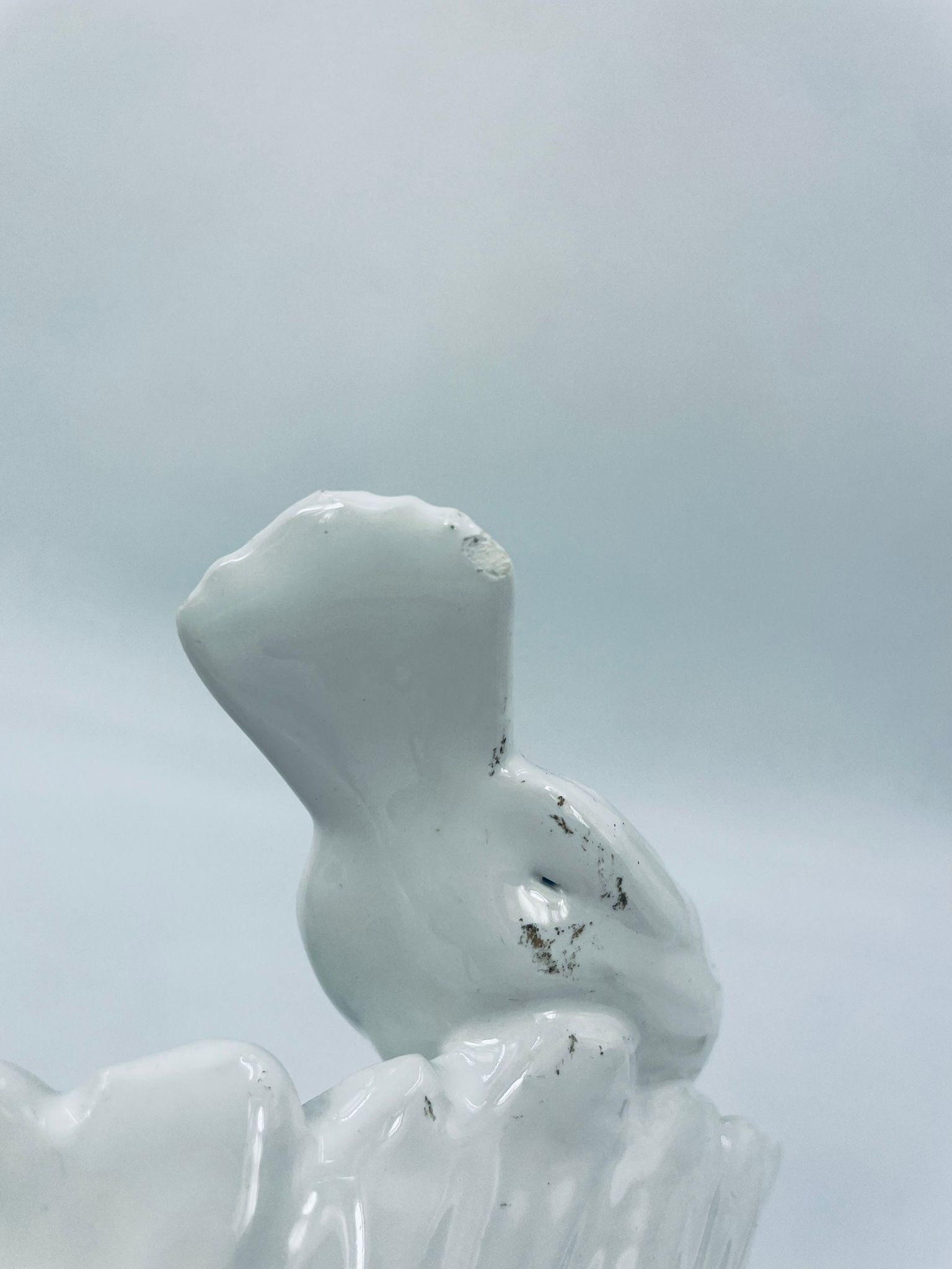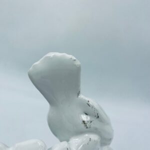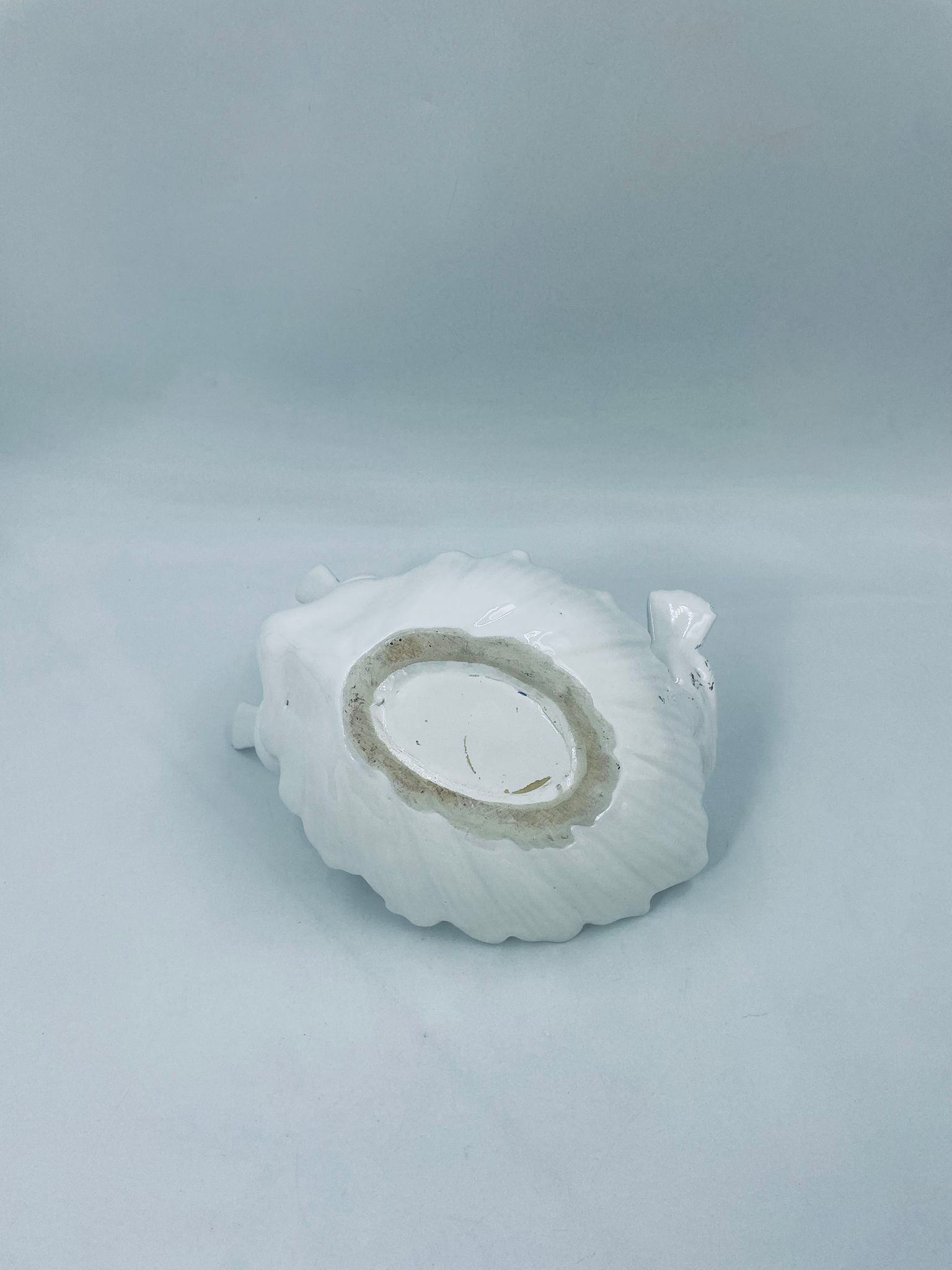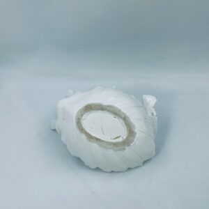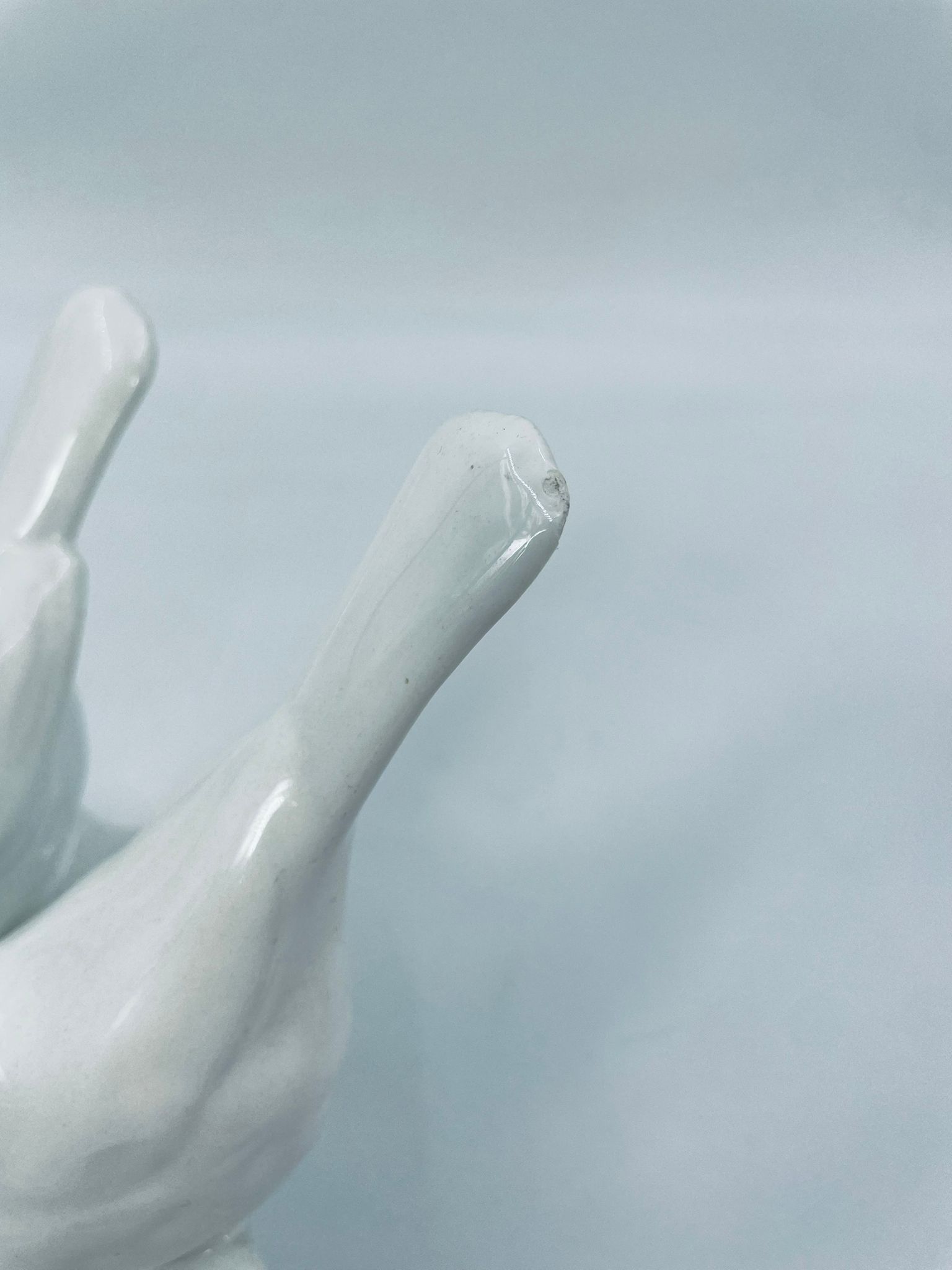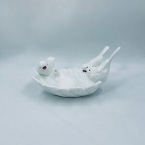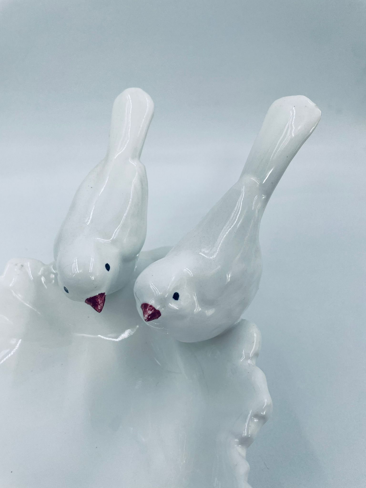 A decorative bowl in vintage style, made of white ceramic. The bowl is shaped like a leaf with three bird figurines placed on it. The bowl can be used to store jewellery, keys, sweets or other small items. It has a chip on the bird's tail.