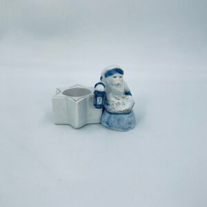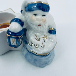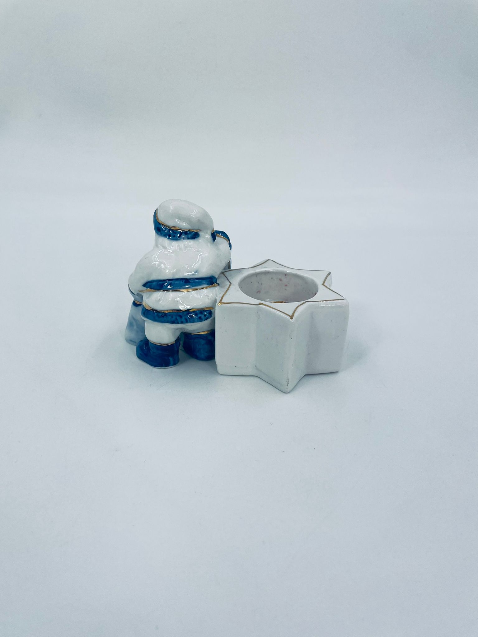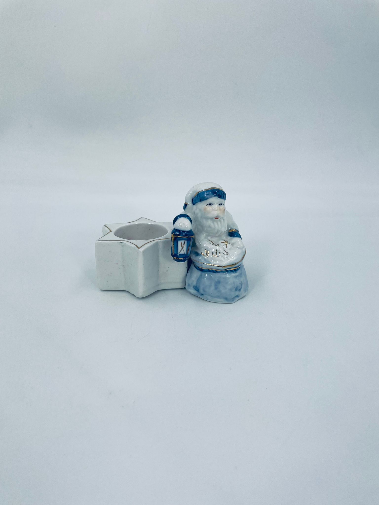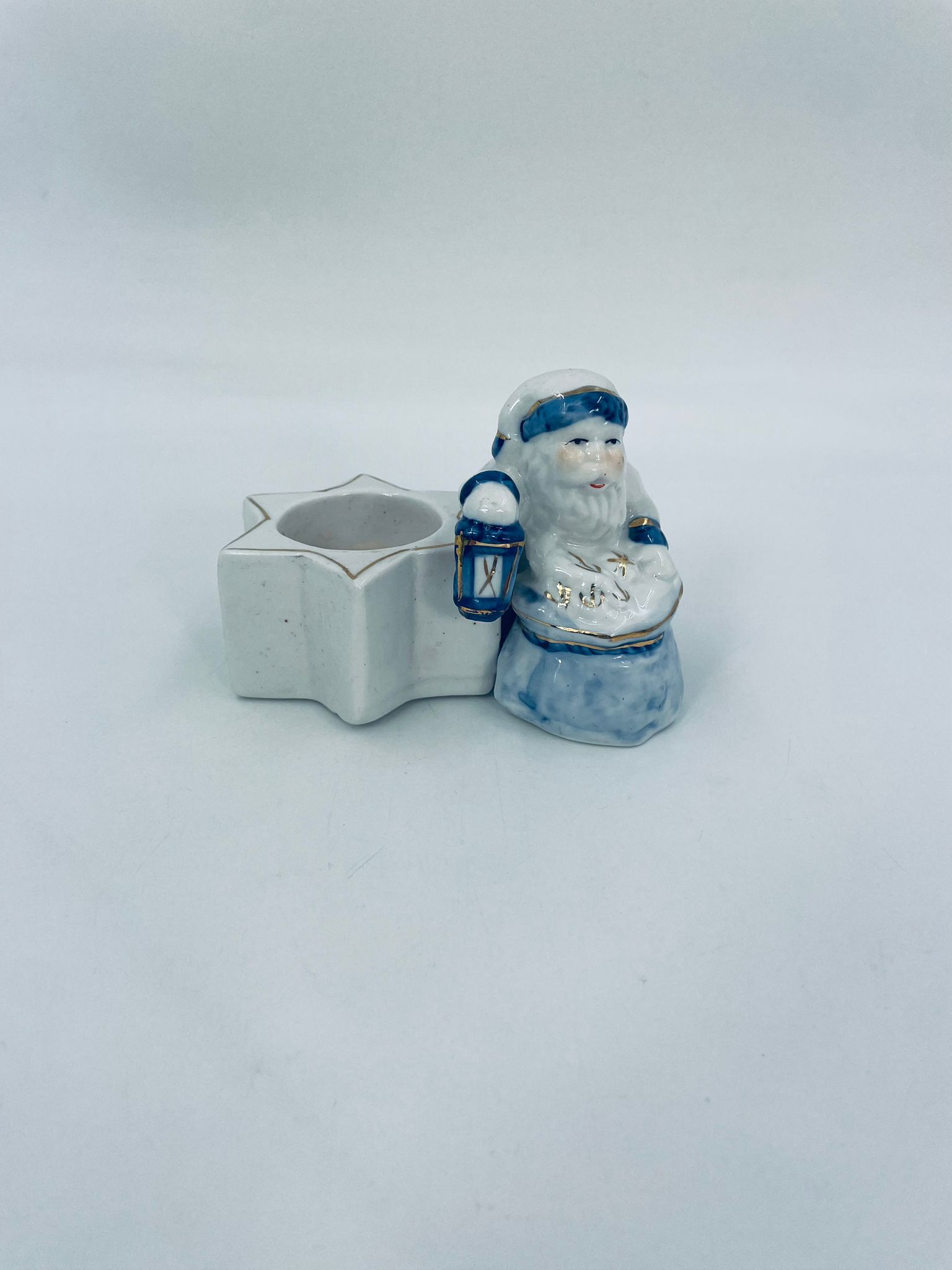 A decorative candle holder in vintage style, made of high-quality porcelain. The candle holder is star-shaped with a golden accent and a decorative figurine of Santa Claus holding a small lantern. Santa Claus is decorated with blue and golden accents.