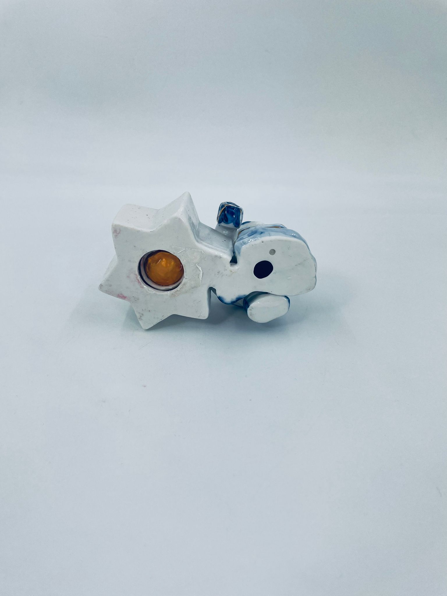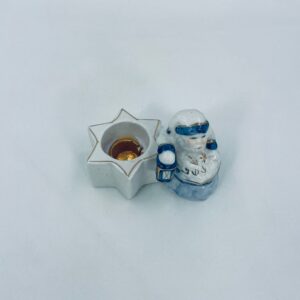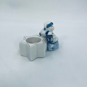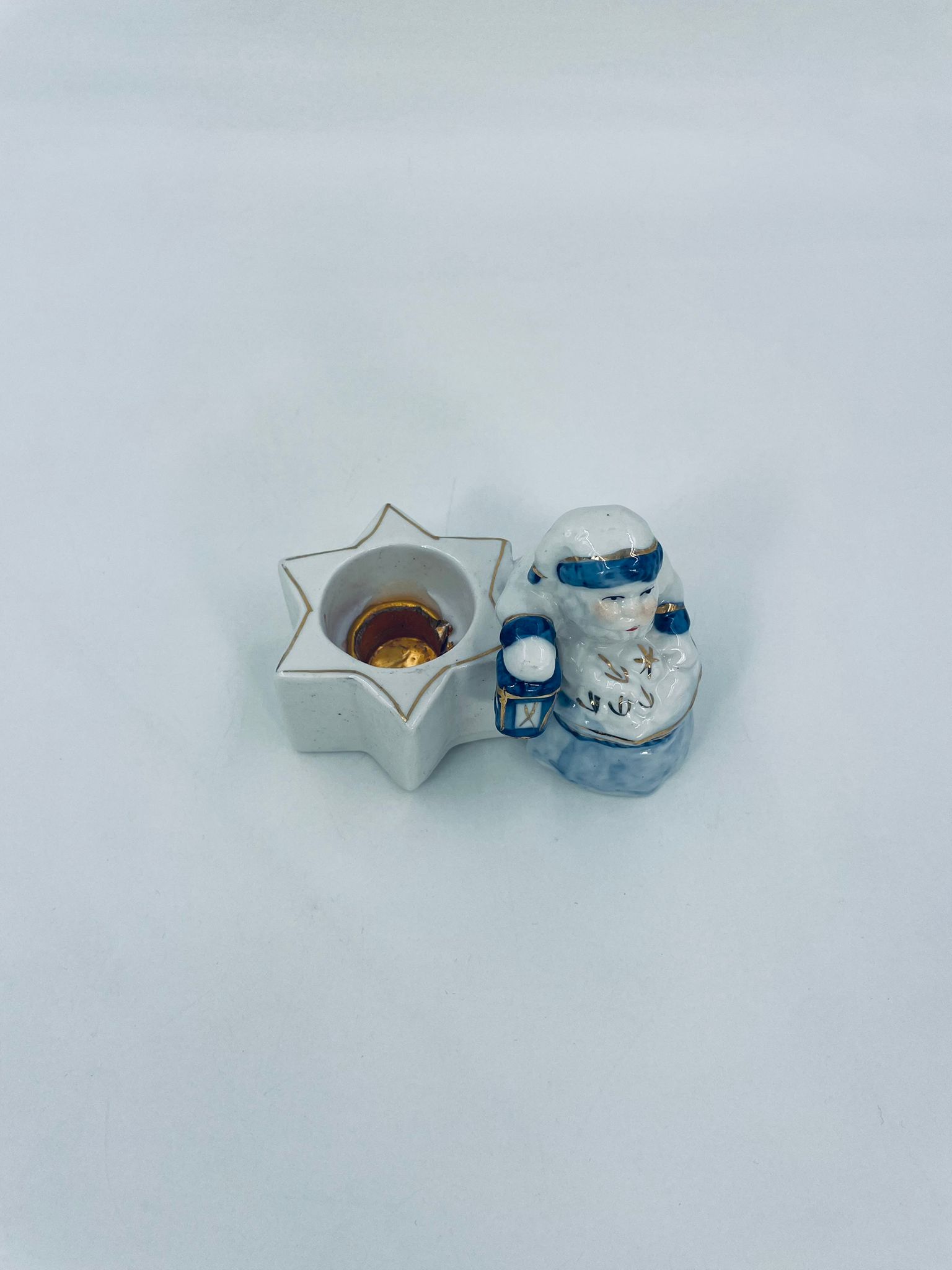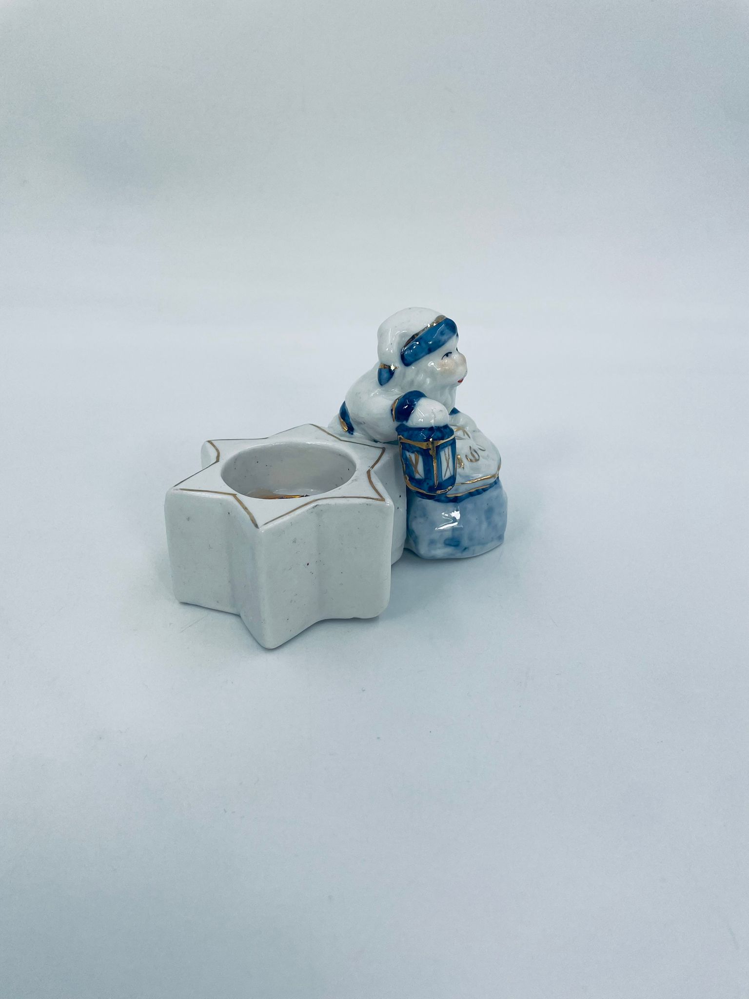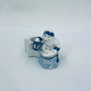 A decorative candle holder in vintage style, made of high-quality porcelain. The candle holder is star-shaped with a golden accent and a decorative figurine of Santa Claus holding a small lantern. Santa Claus is decorated with blue and golden accents.