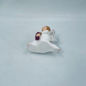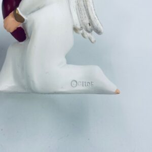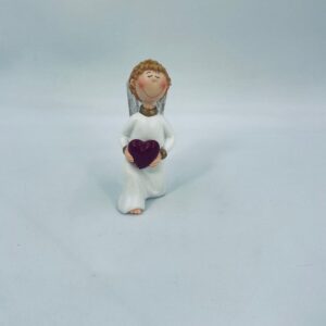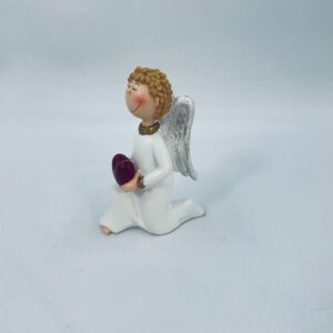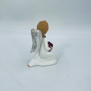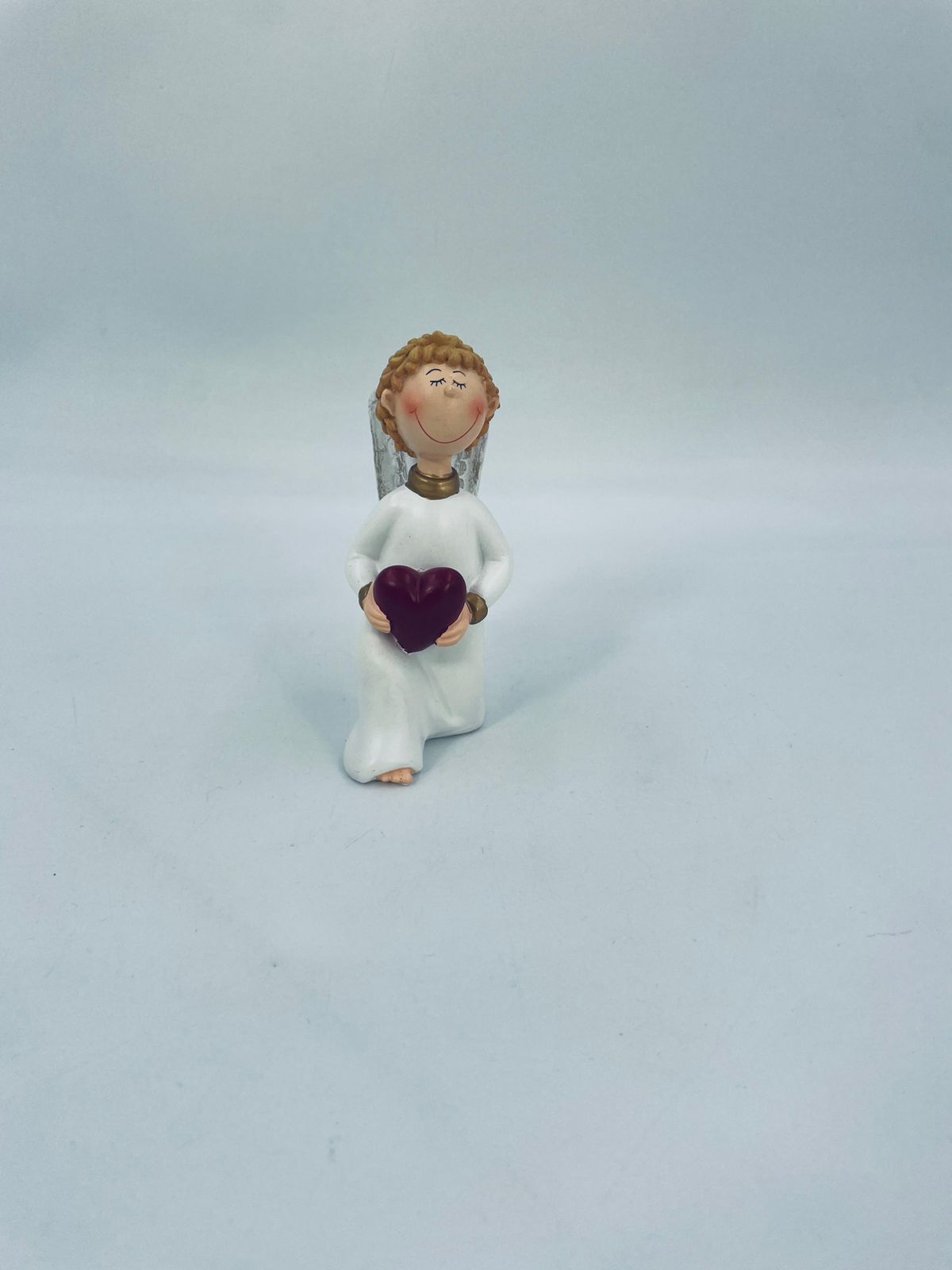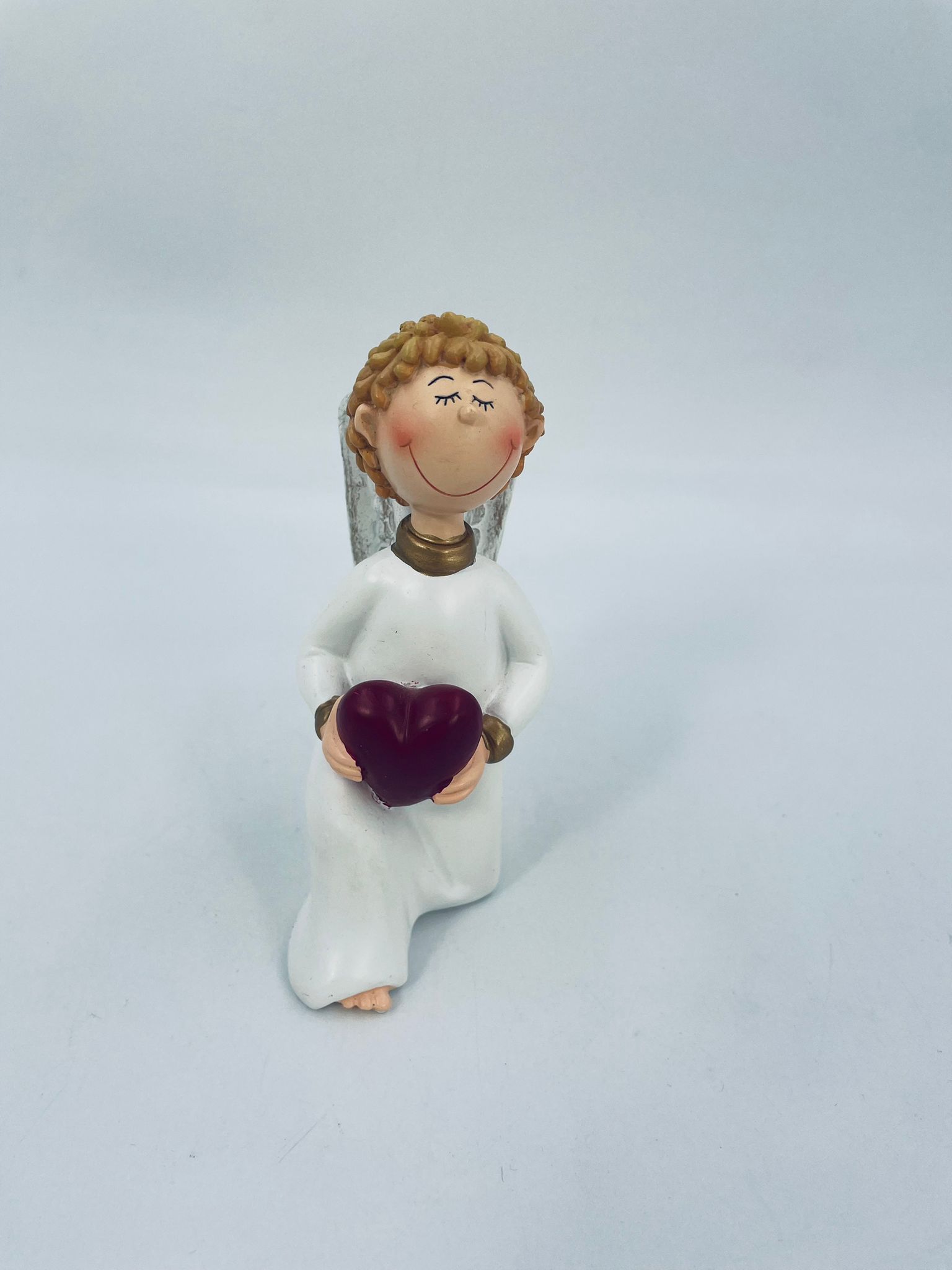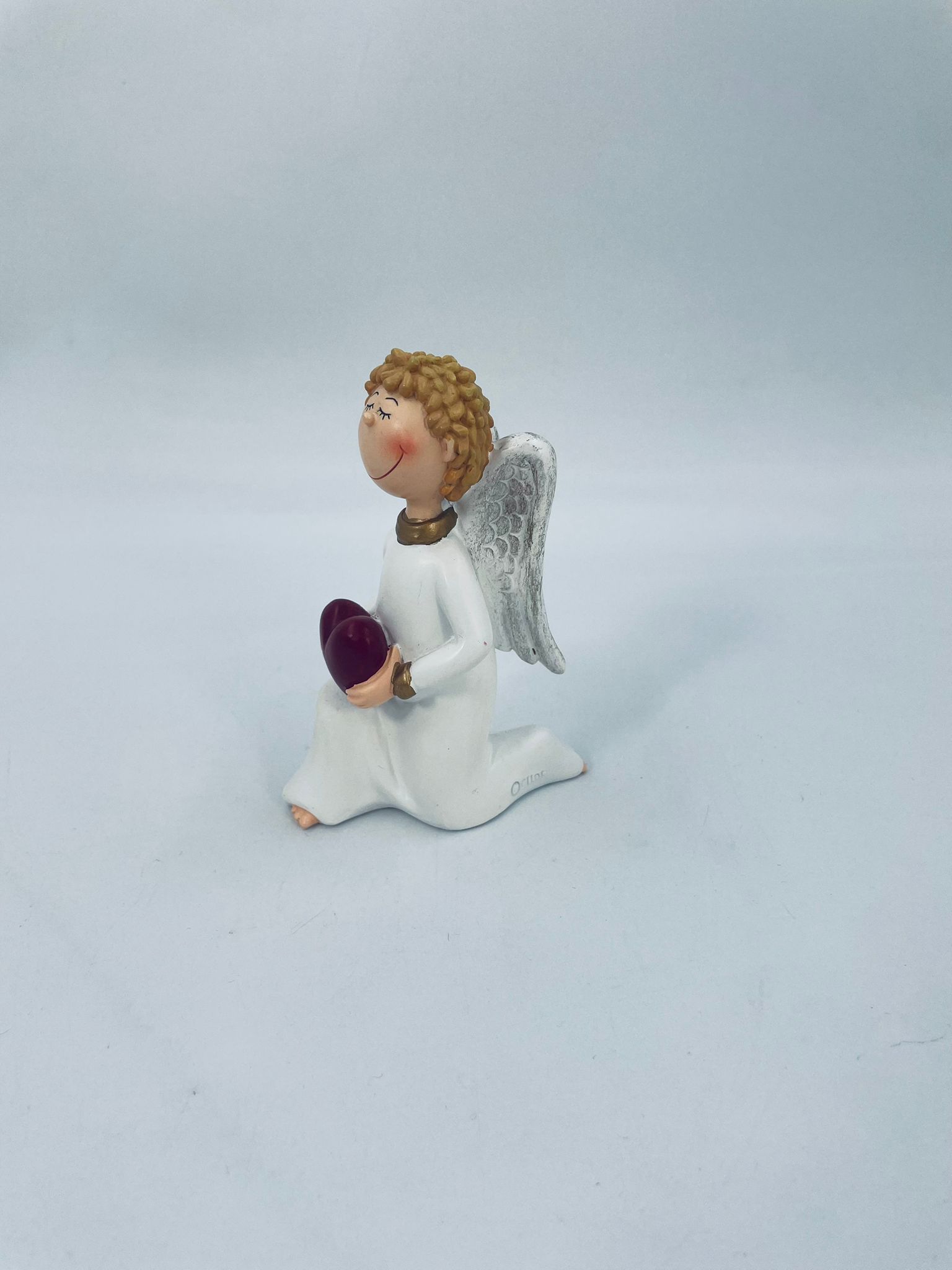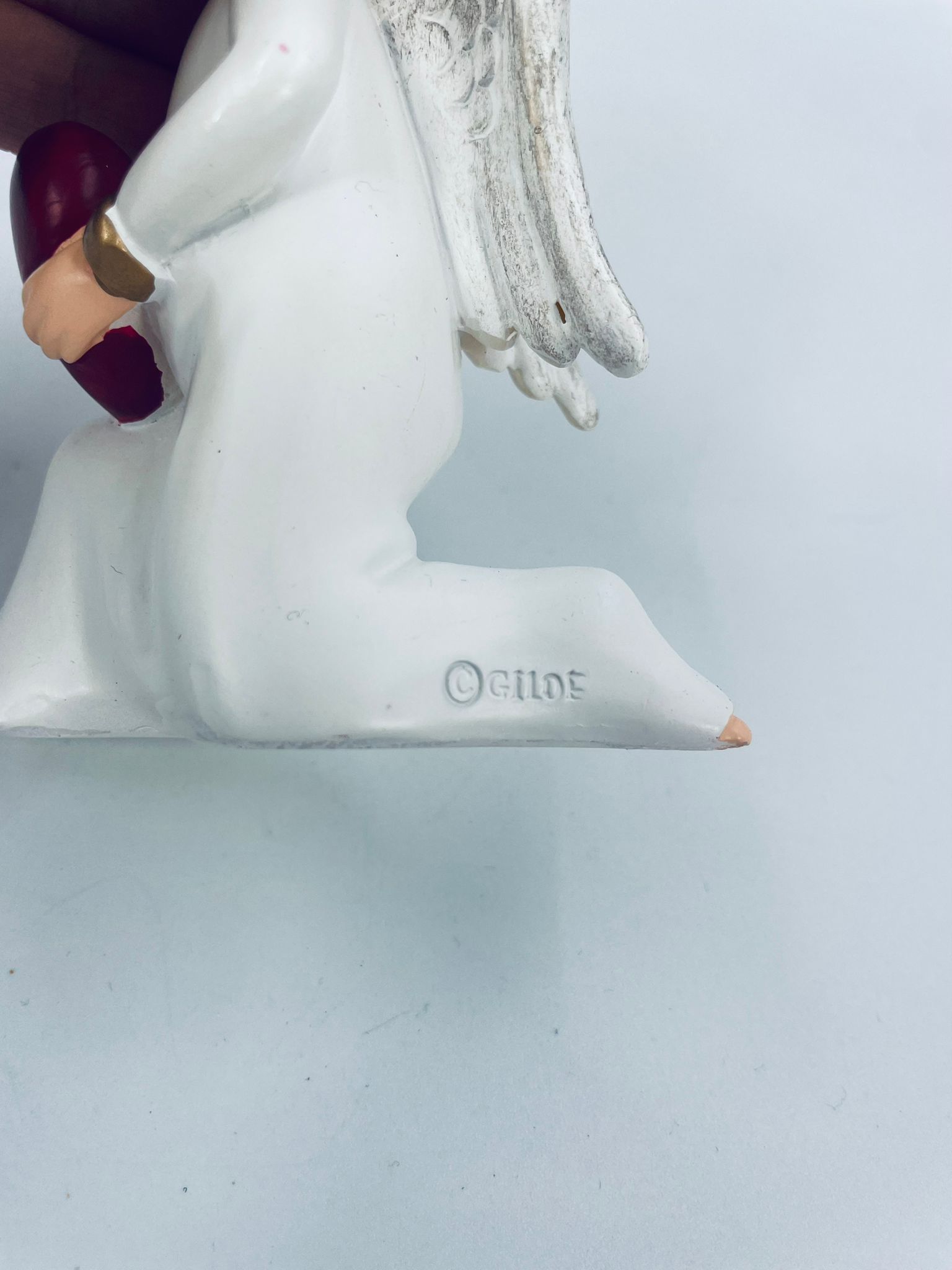 A collectible, decorative figurine made of ceramic by Gilde Handwerk. The figurine is handmade and depicts an angel dressed in a white robe with golden accents, holding a red heart in his hands.