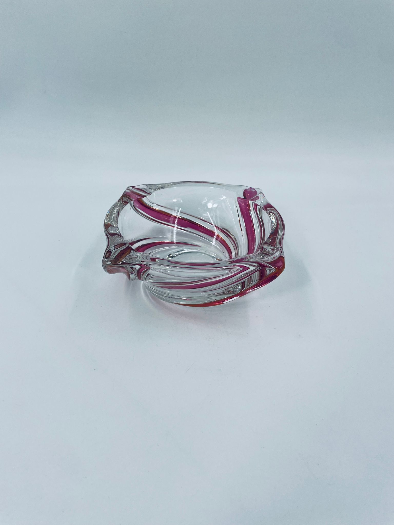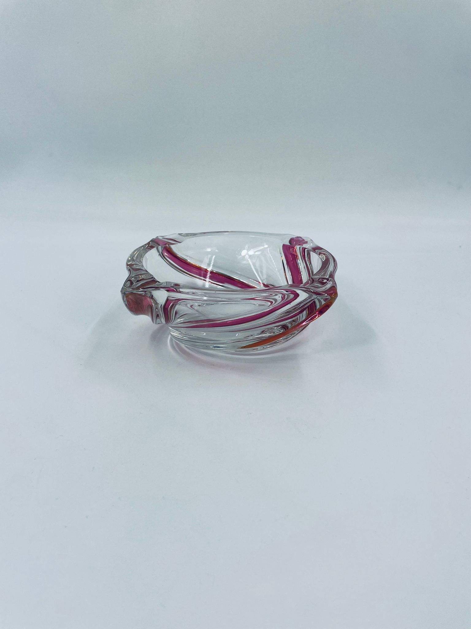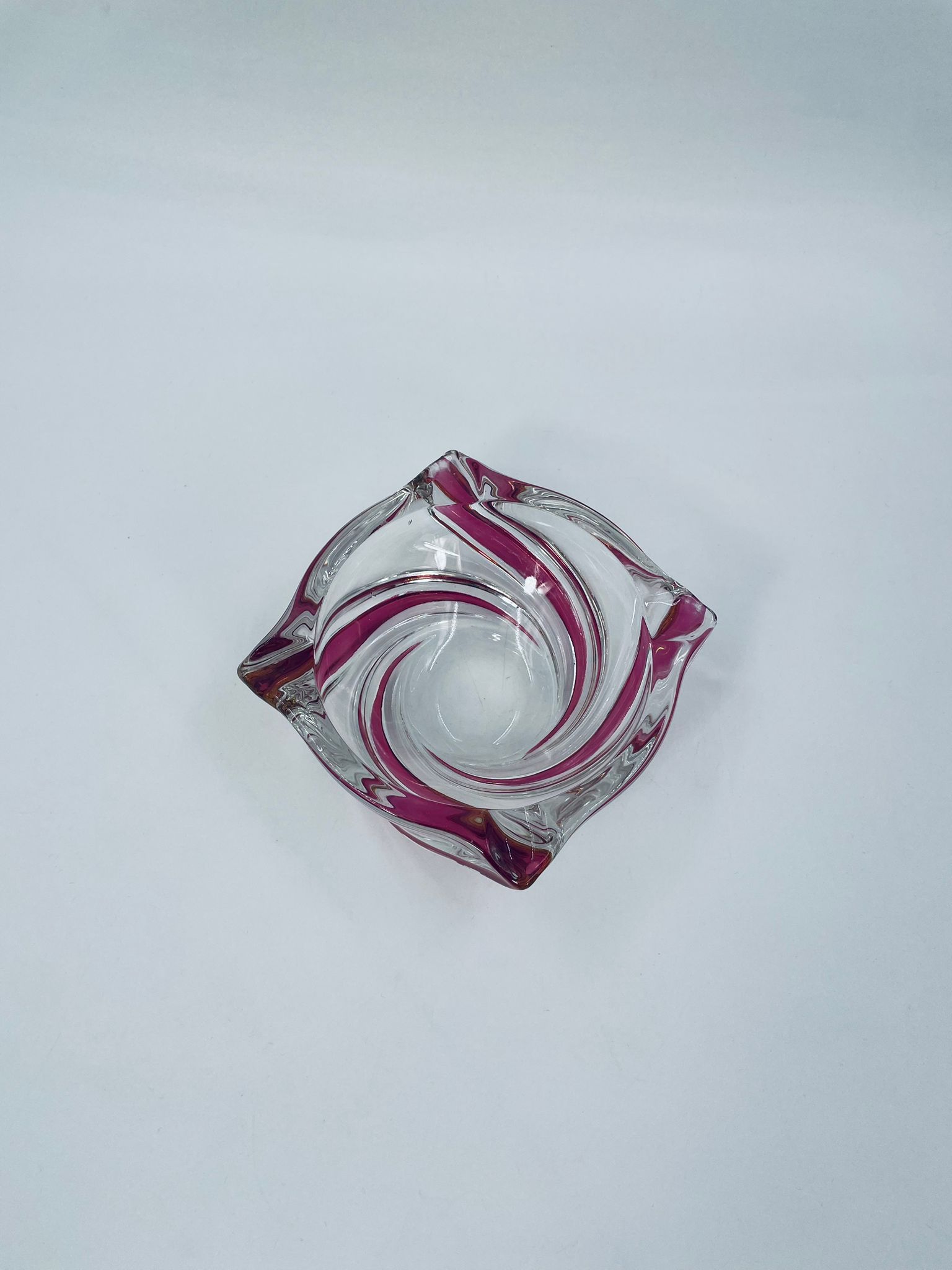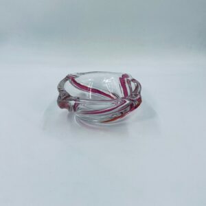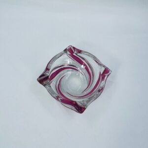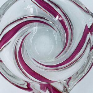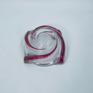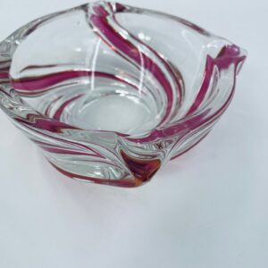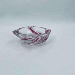 Vintage style decorative bowl from the 1970s, made of high quality artistic crystal glass. The bowl features an irregular, asymmetrical, spiral shape with pink colouring and with four indentations and can be used as an ashtray. It has a slight rubbing on the colour.