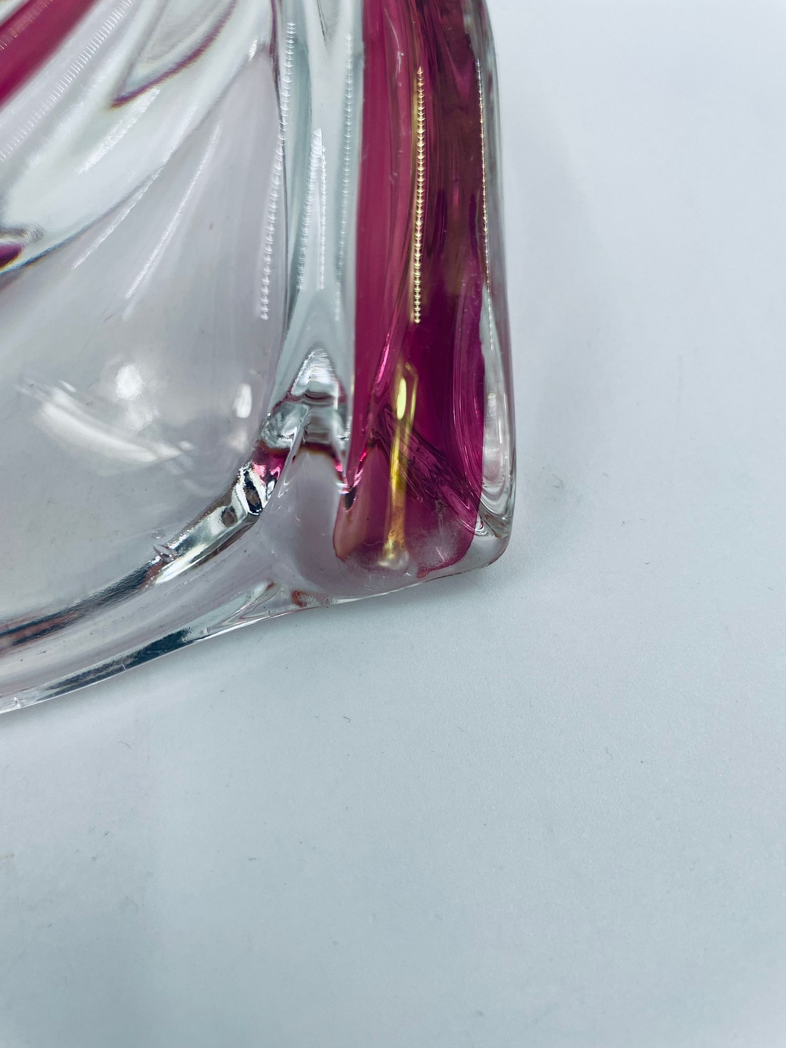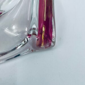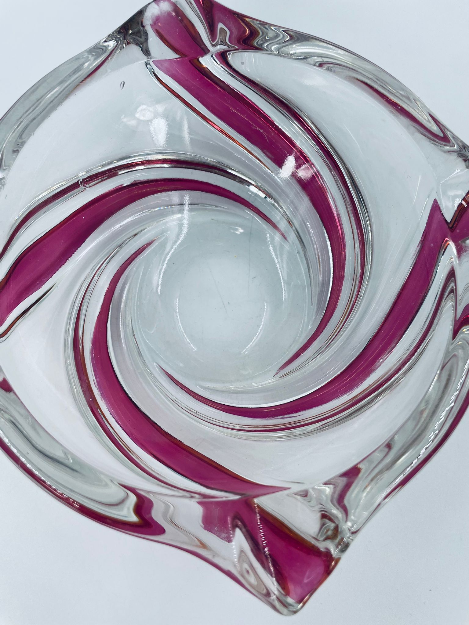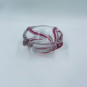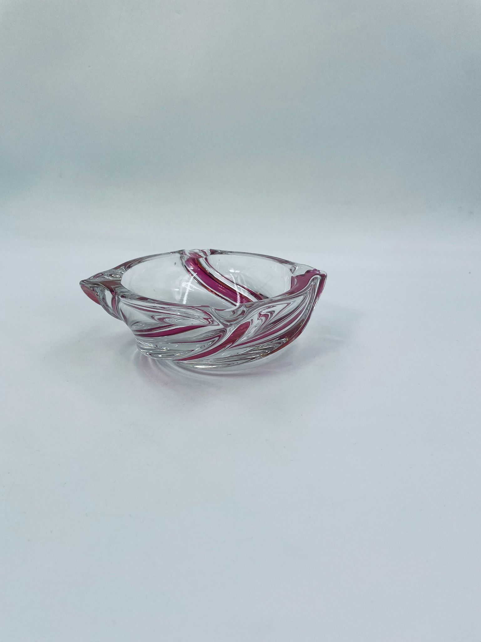 Vintage style decorative bowl from the 1970s, made of high quality artistic crystal glass. The bowl features an irregular, asymmetrical, spiral shape with pink colouring and with four indentations and can be used as an ashtray. It has a slight rubbing on the colour.