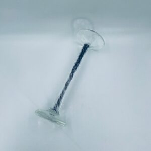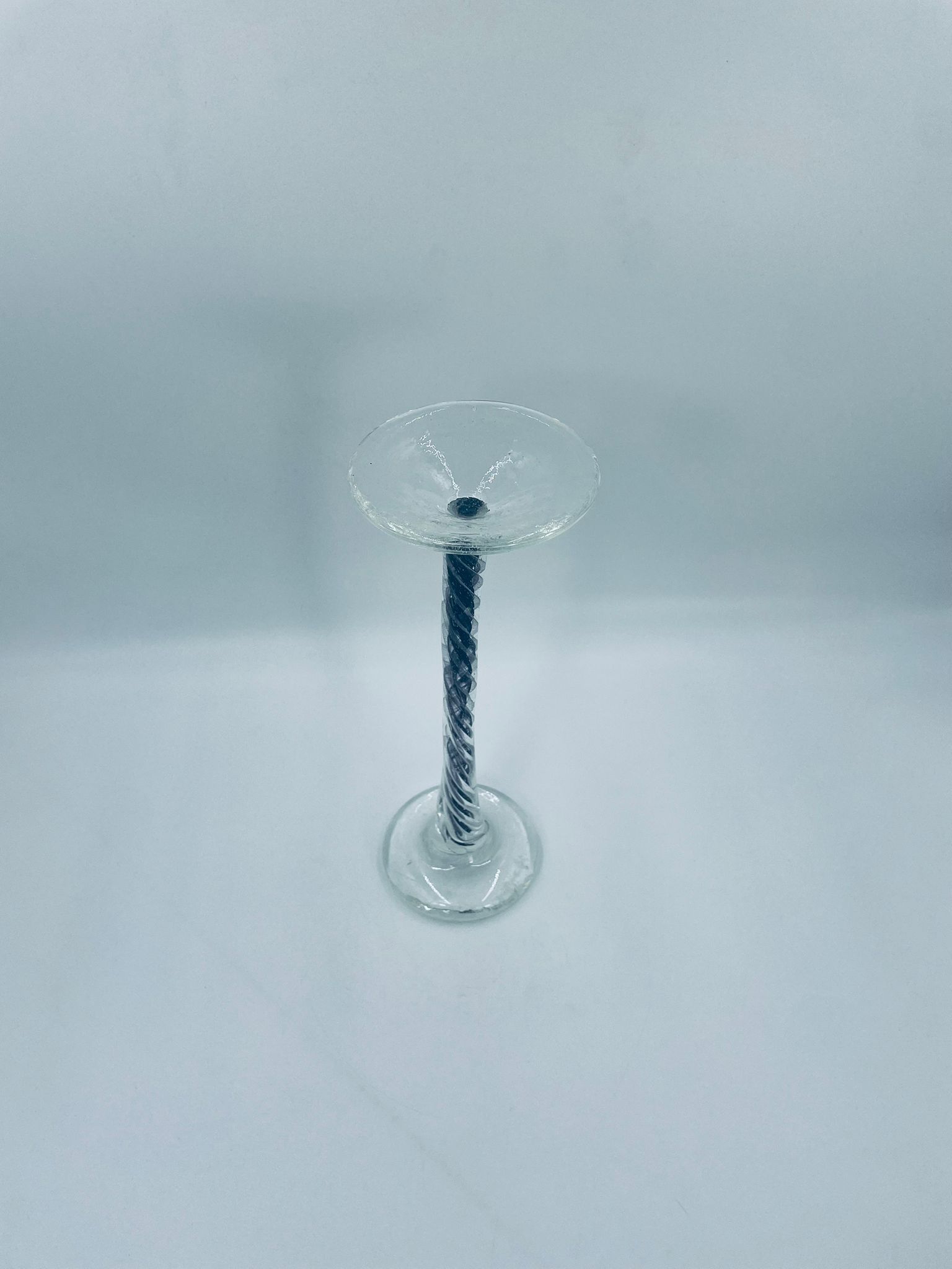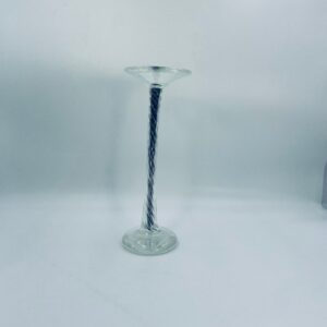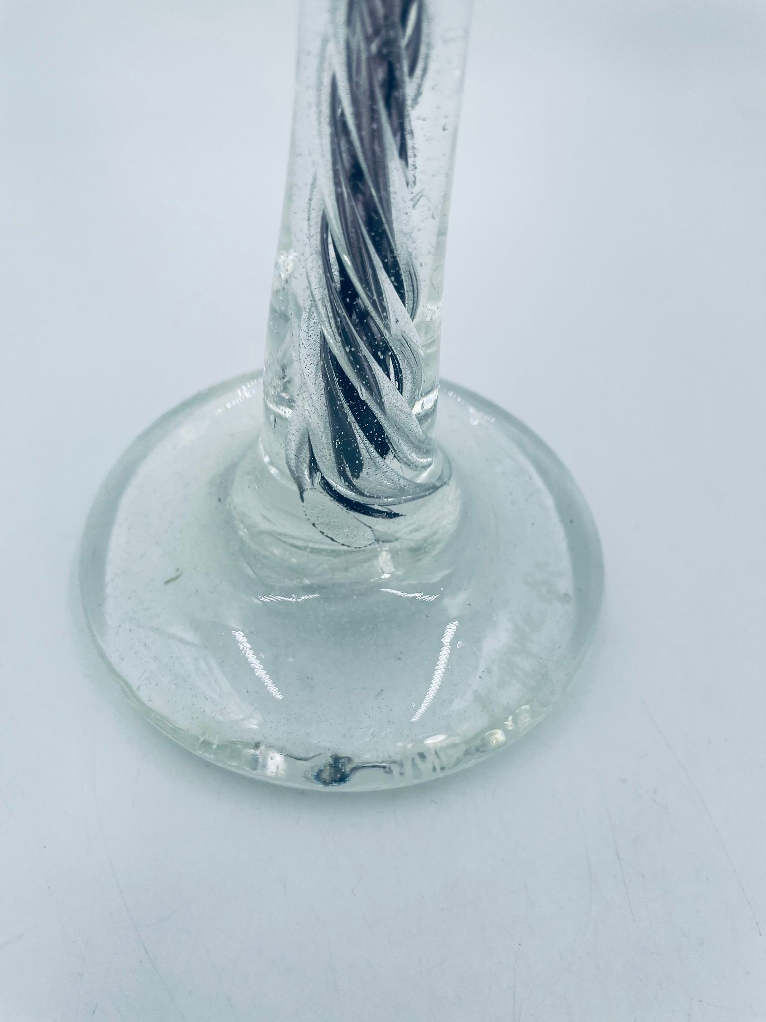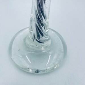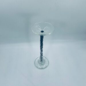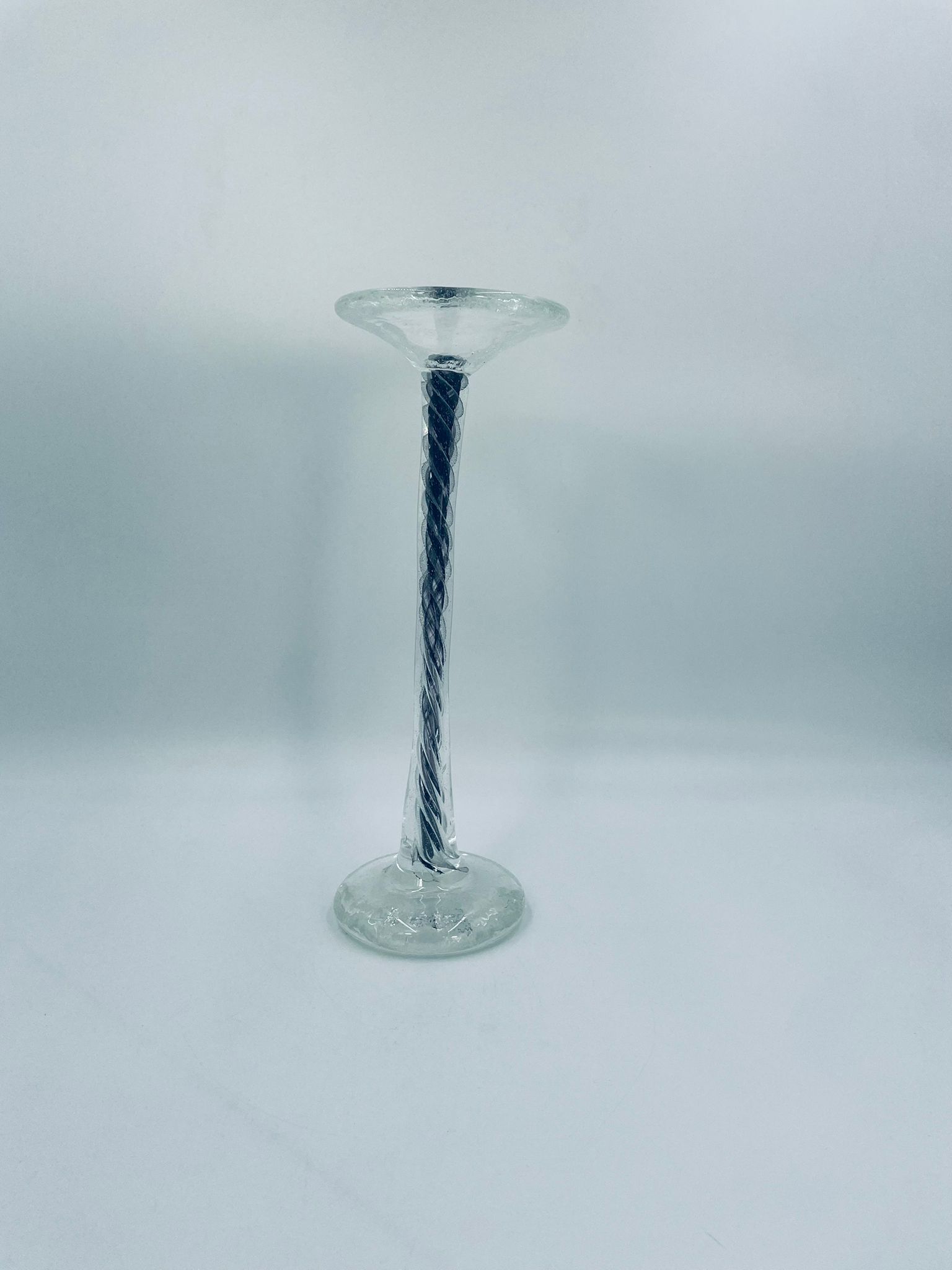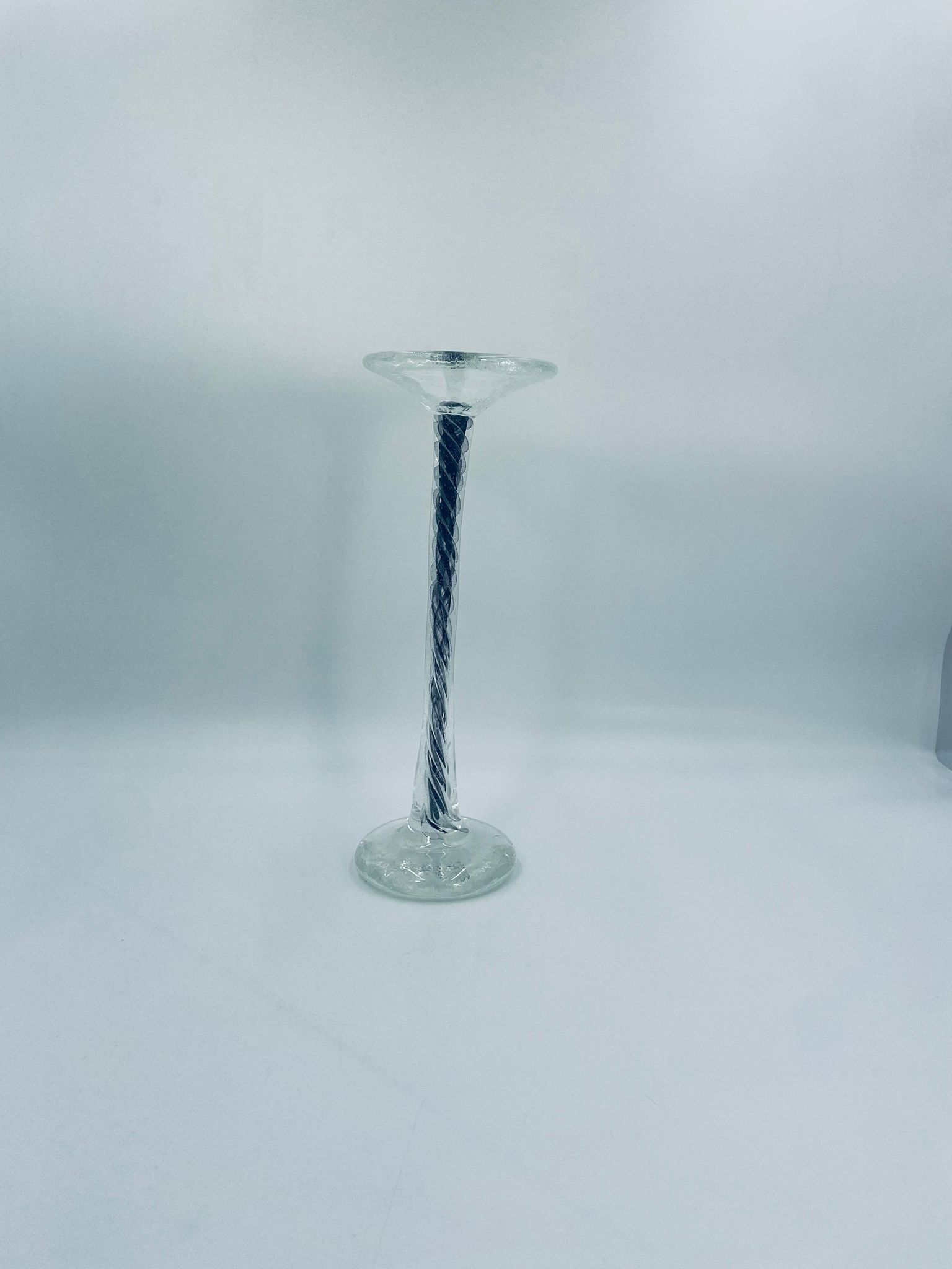 Vintage style decorative candle holder, made of high quality art glass, crystal. The candle holder is transparent with bubbles in the centre and has a decorative leg in which a spiral effect is embedded.