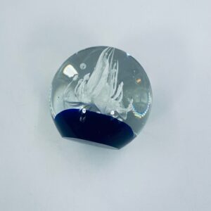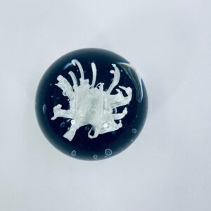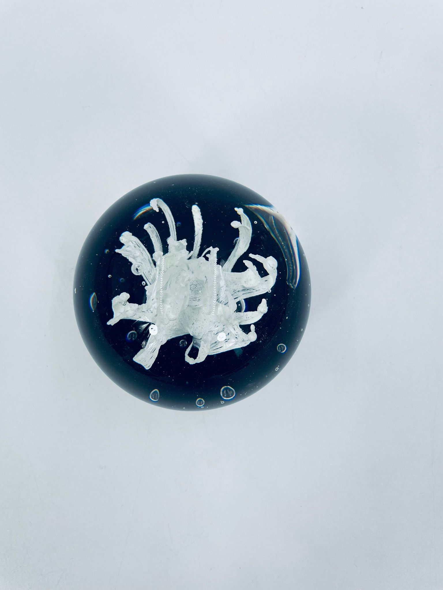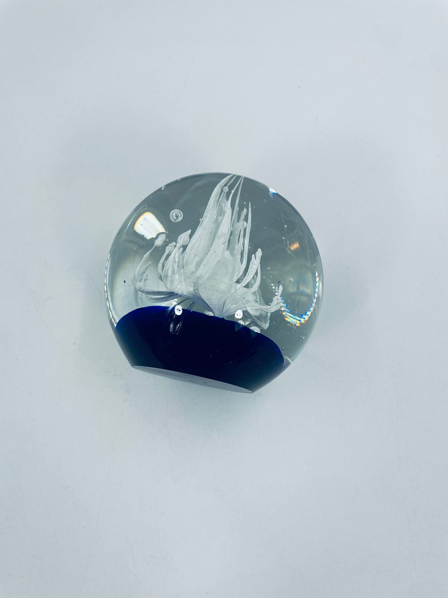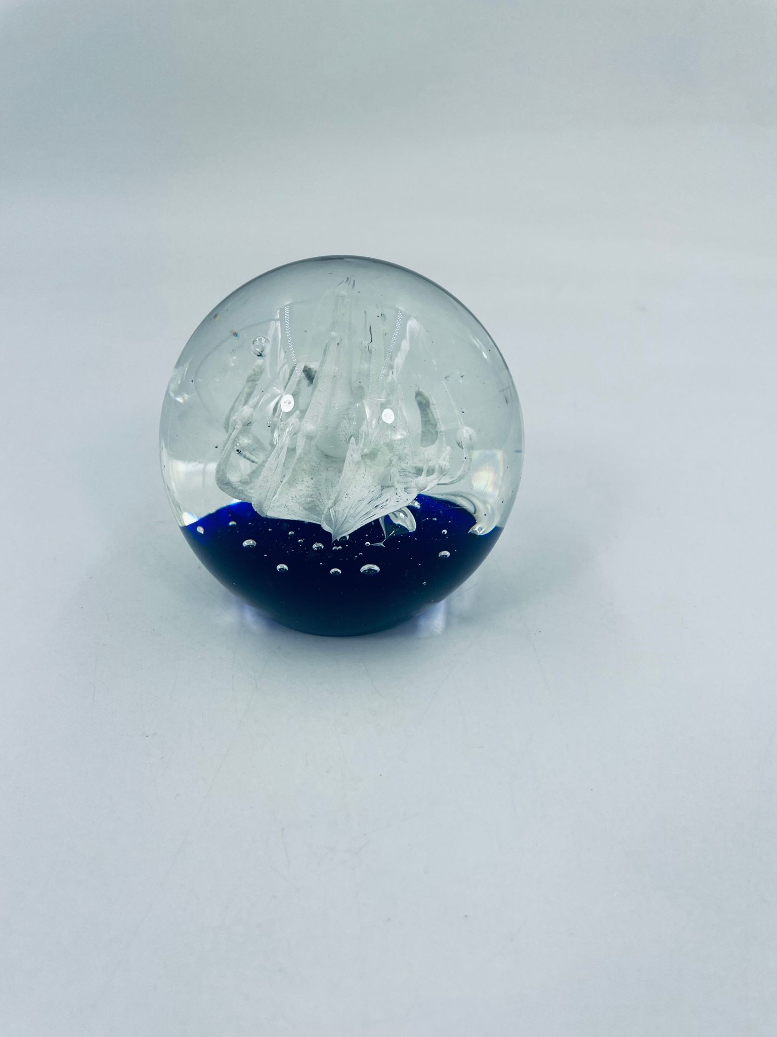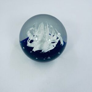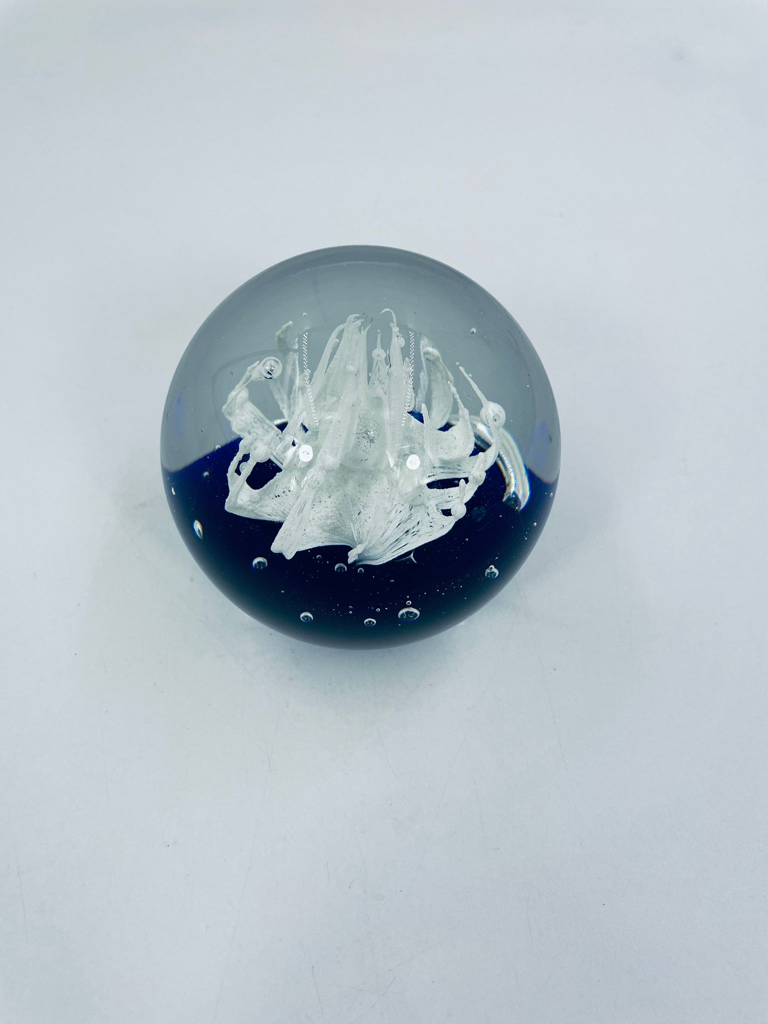 A sphere-shaped figurine, in murano art glass. Inside is a white structure resembling a stylised flower, set on a blue base.