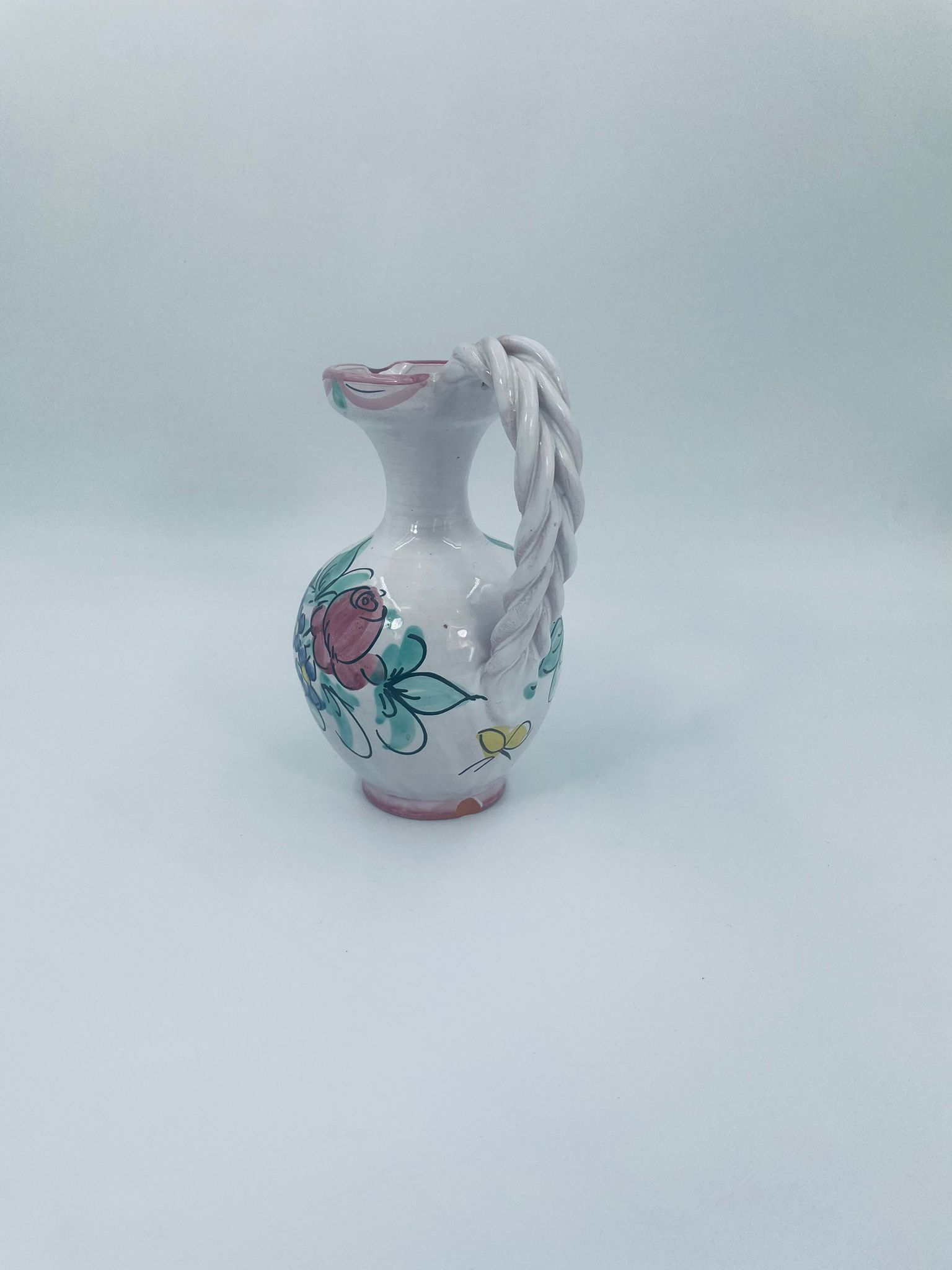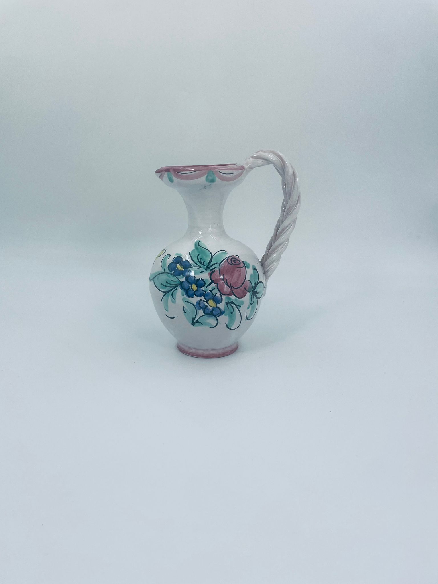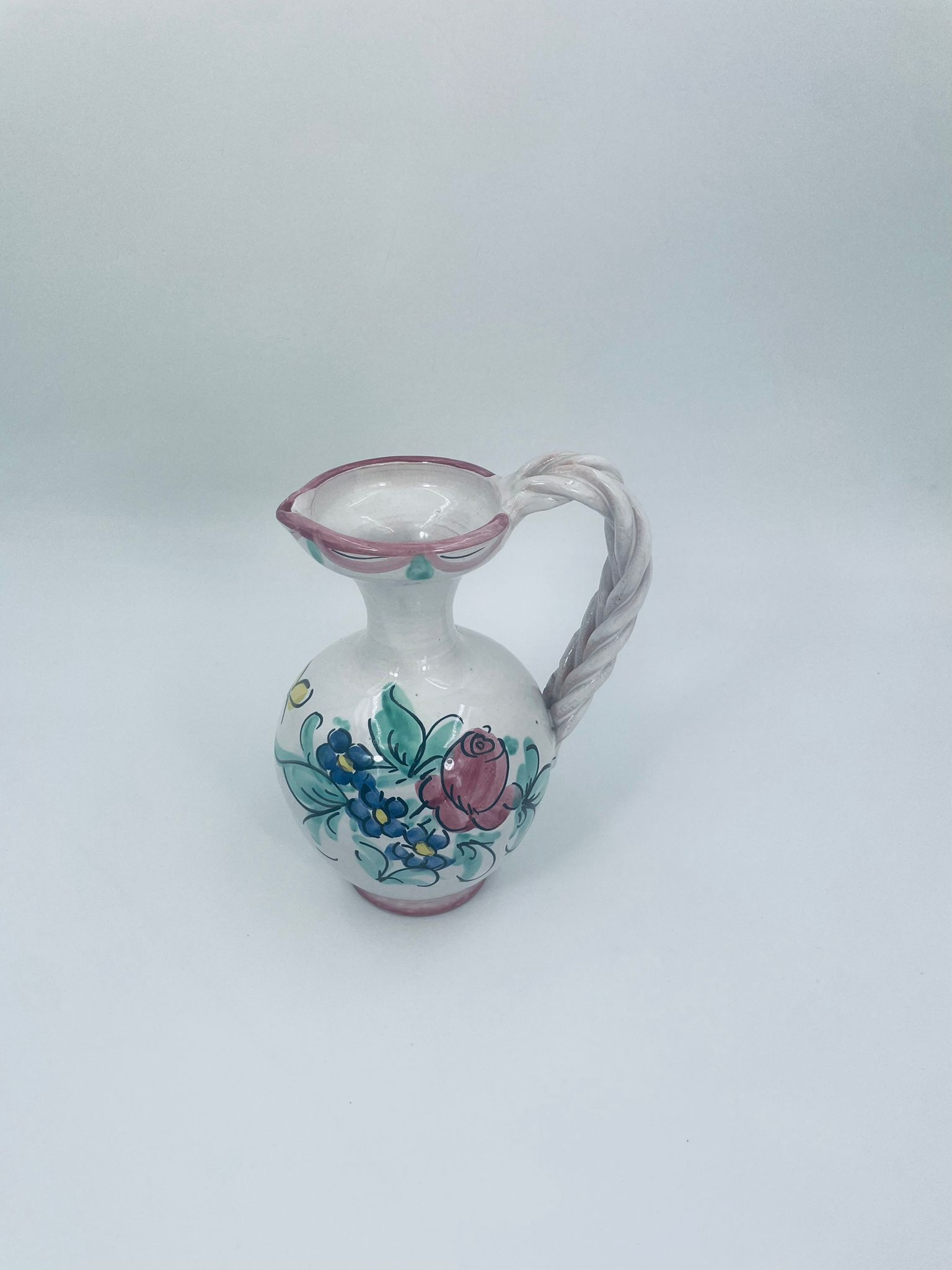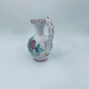 Decorative jug made of Italian majolica in pink. The jug is handmade and hand-painted with floral motifs. The handle of the jug is braided, which adds to its charm. Can be used as a decorative piece or as a vase for small flowers. It has a loss at the base.