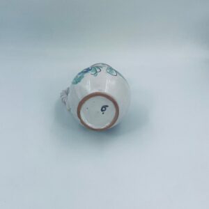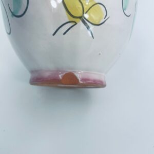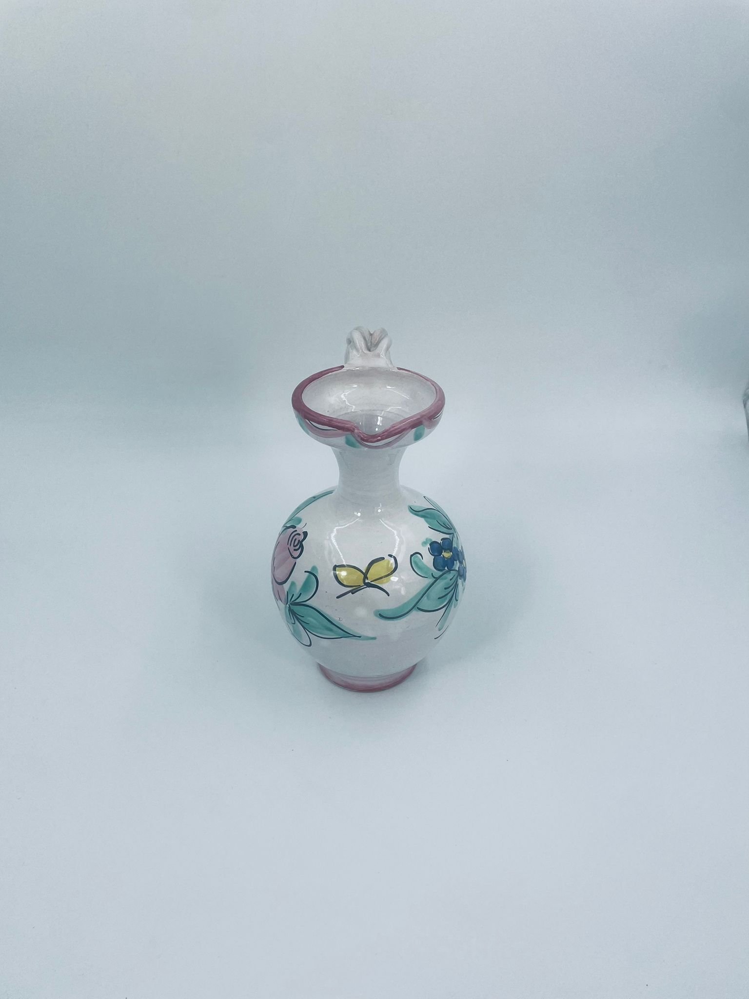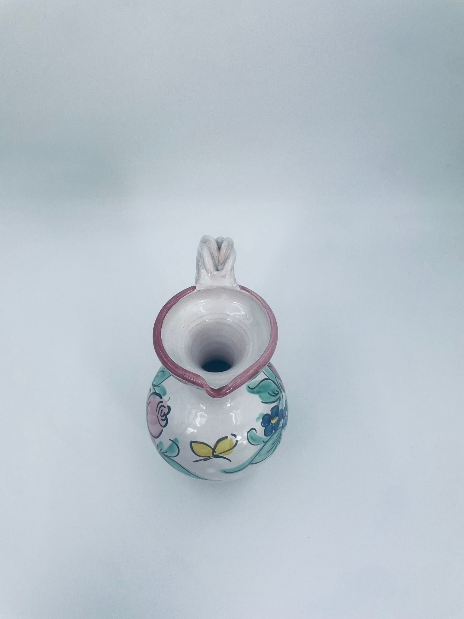 Decorative jug made of Italian majolica in pink. The jug is handmade and hand-painted with floral motifs. The handle of the jug is braided, which adds to its charm. Can be used as a decorative piece or as a vase for small flowers. It has a loss at the base.