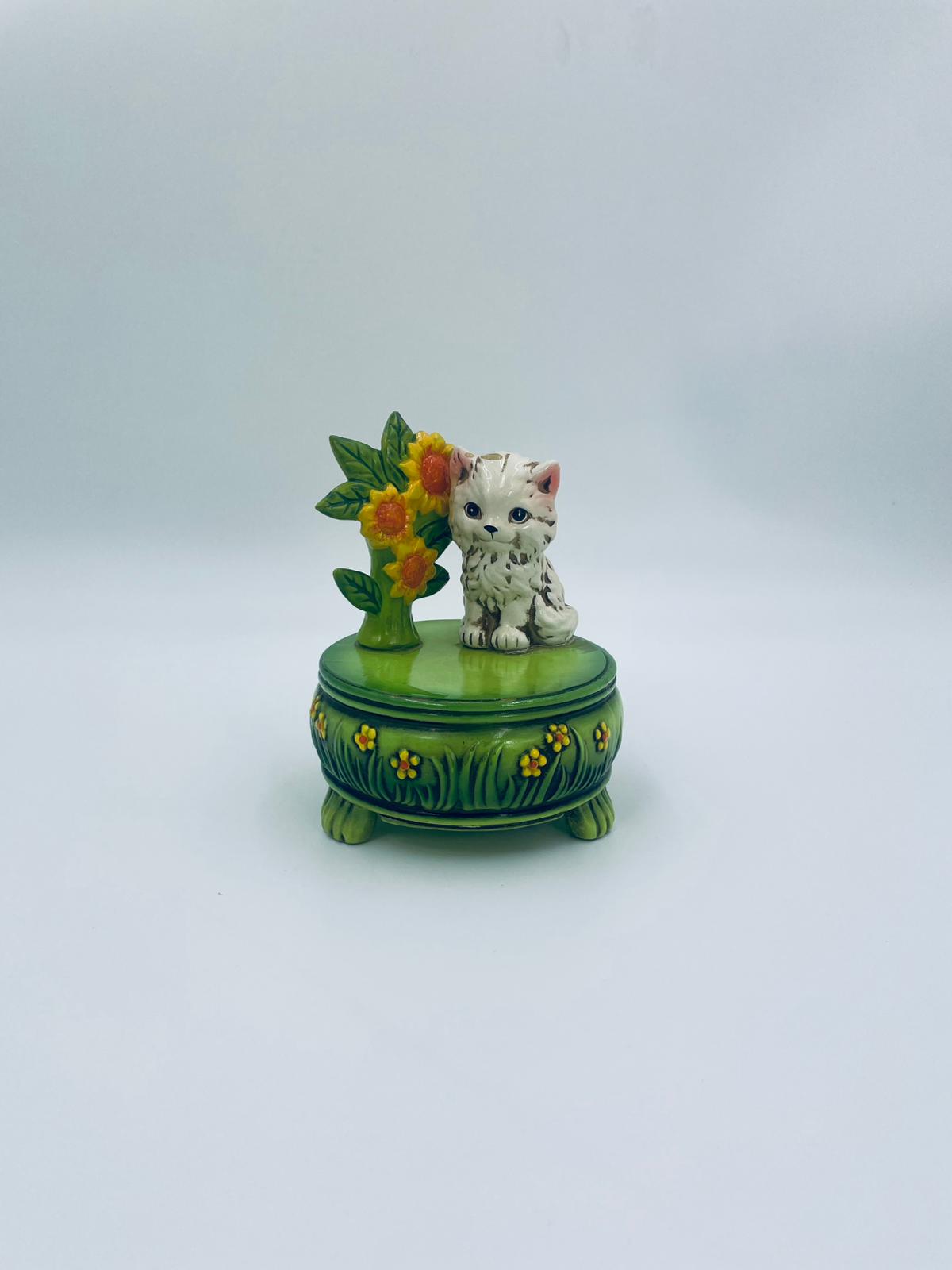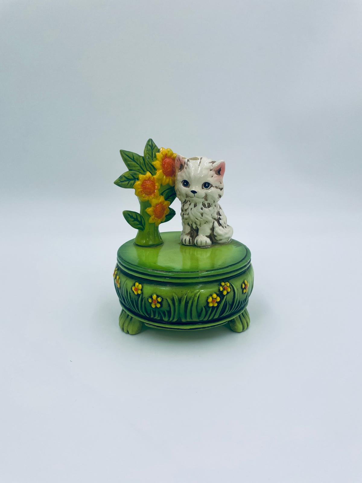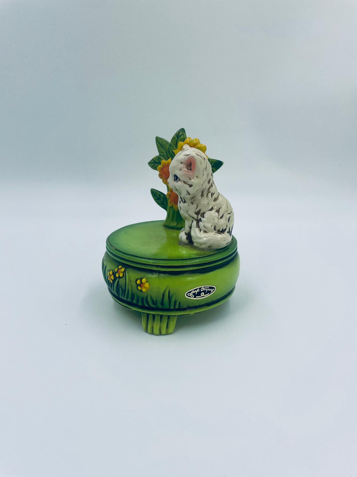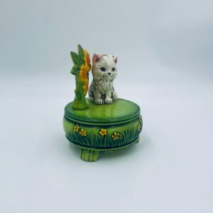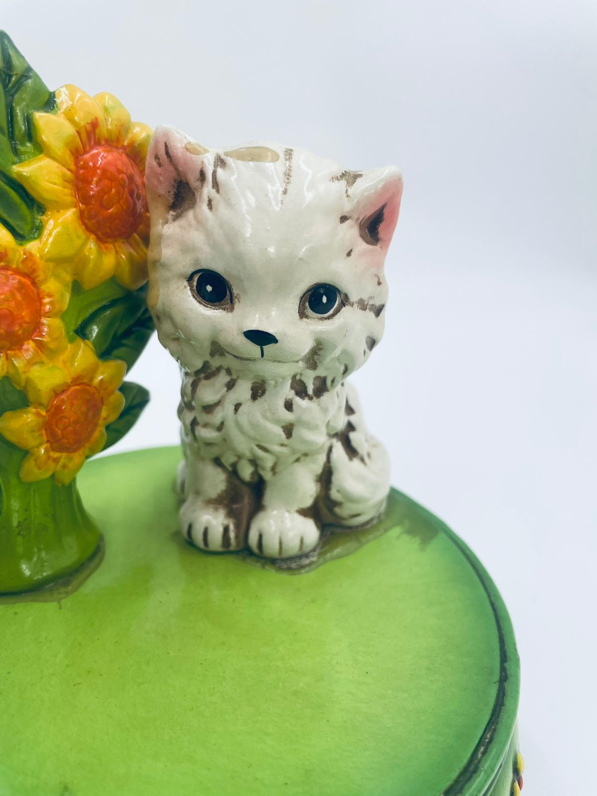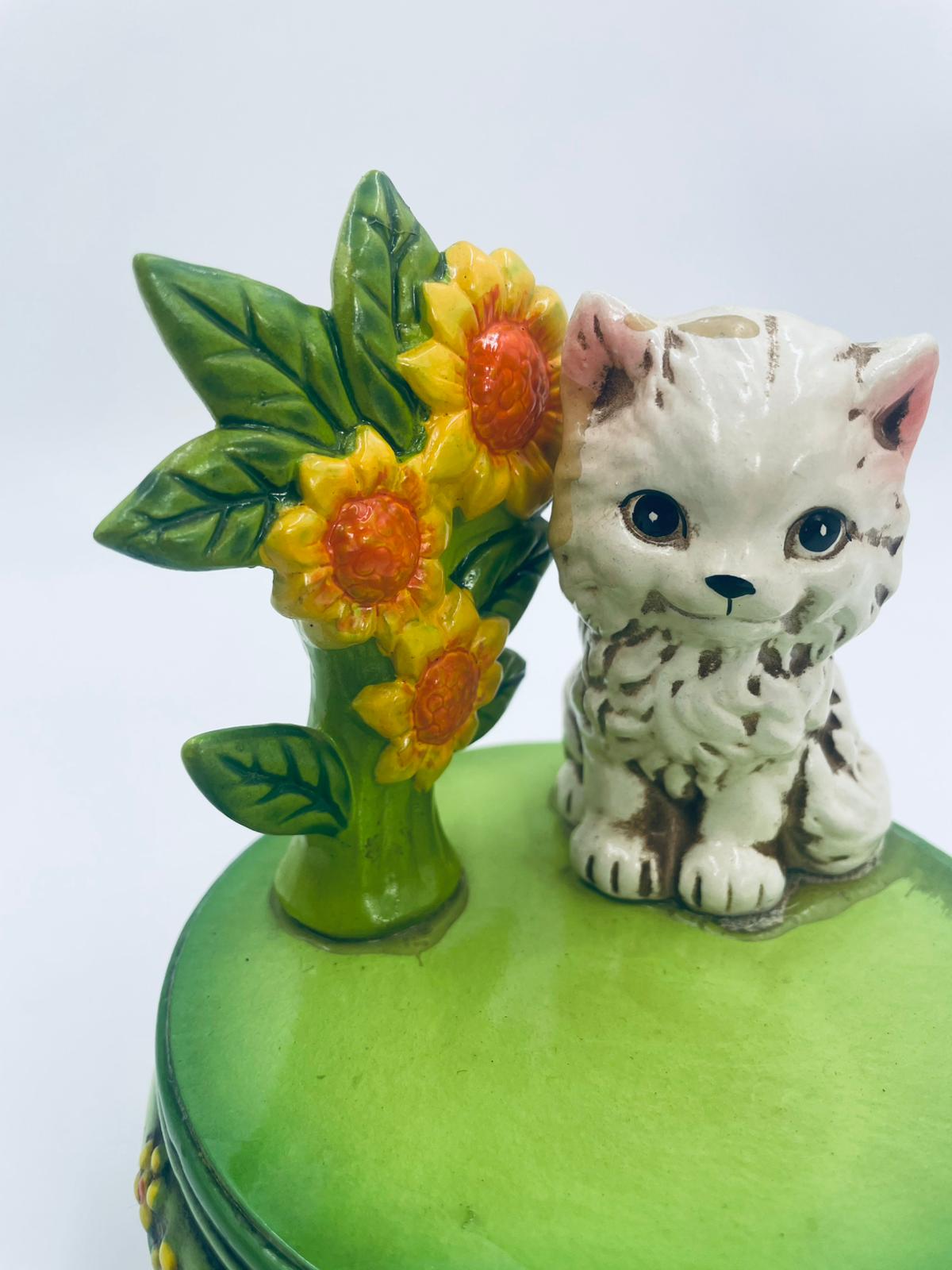 Decorative, collectible music box from the Josef Originals series, made in Japan between 1940 and 1969, made of ceramic. The music box set on three decorative legs, with a figurine of a small cat sitting on a green round box decorated with flowers and a figurine of a bouquet of yellow sunflowers. It has rubbing and scratching.