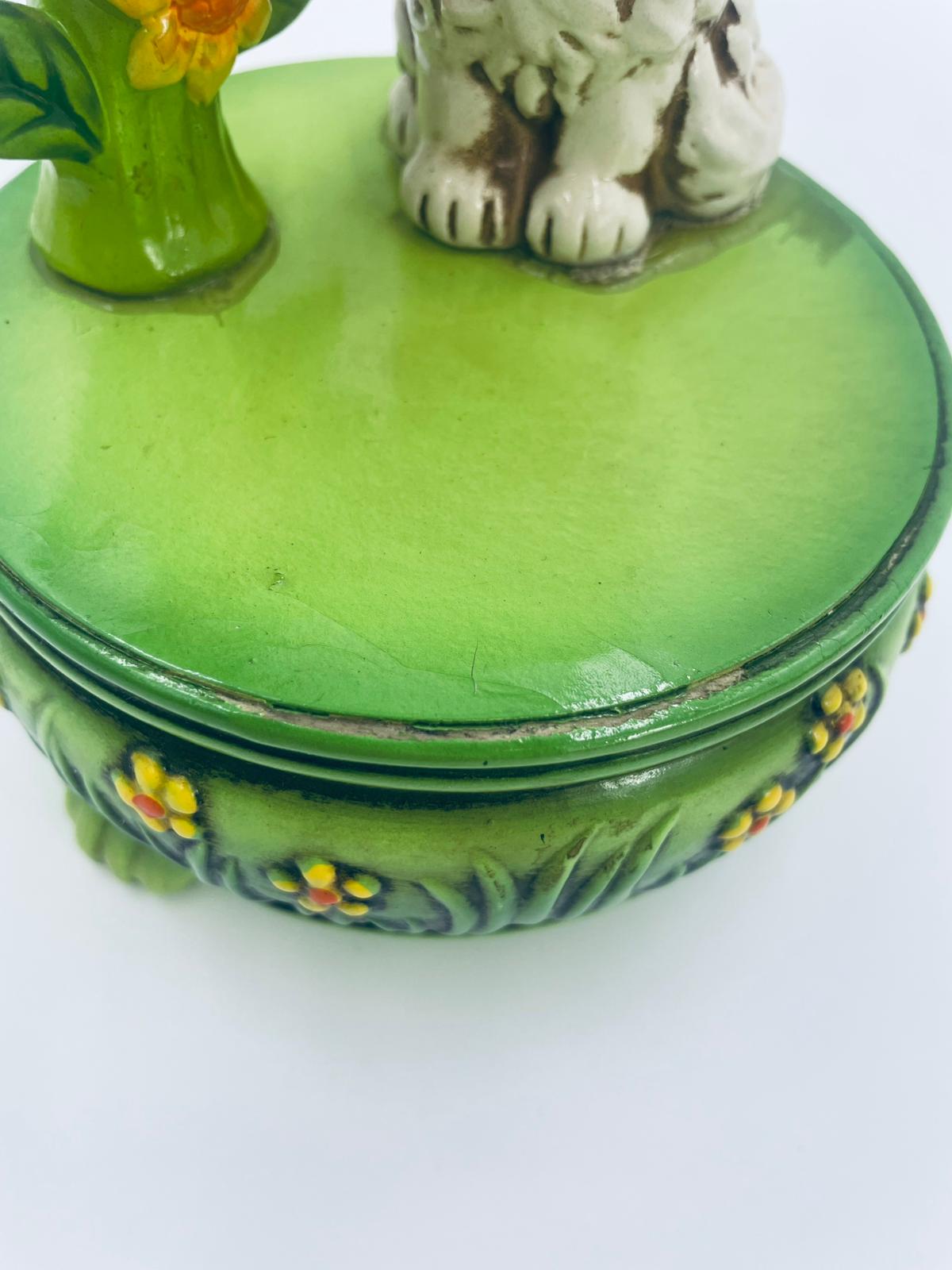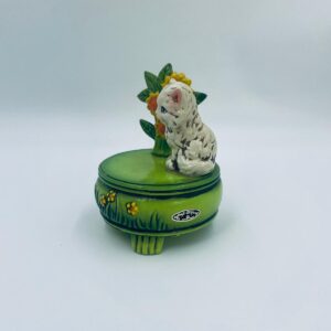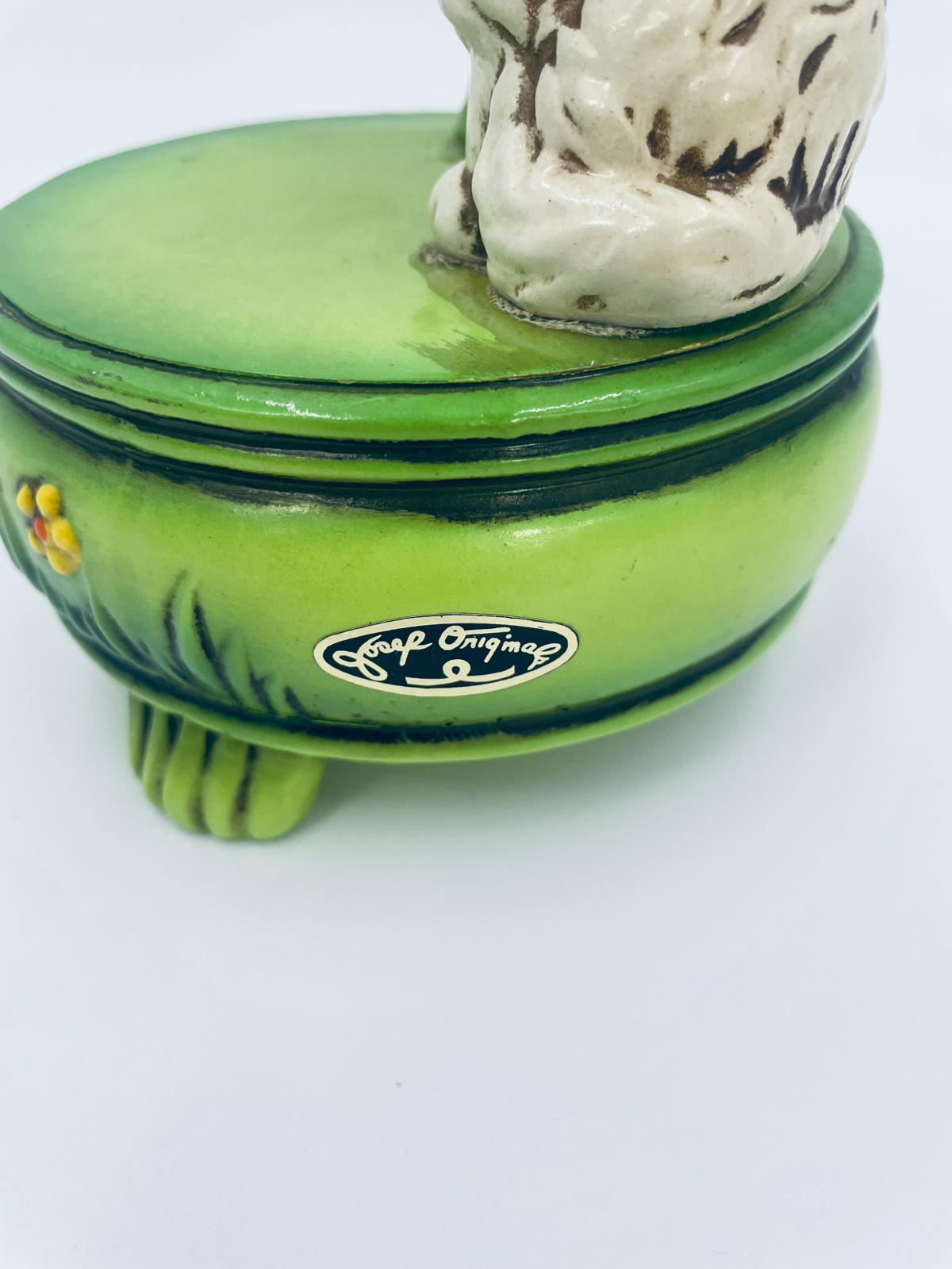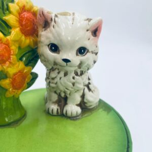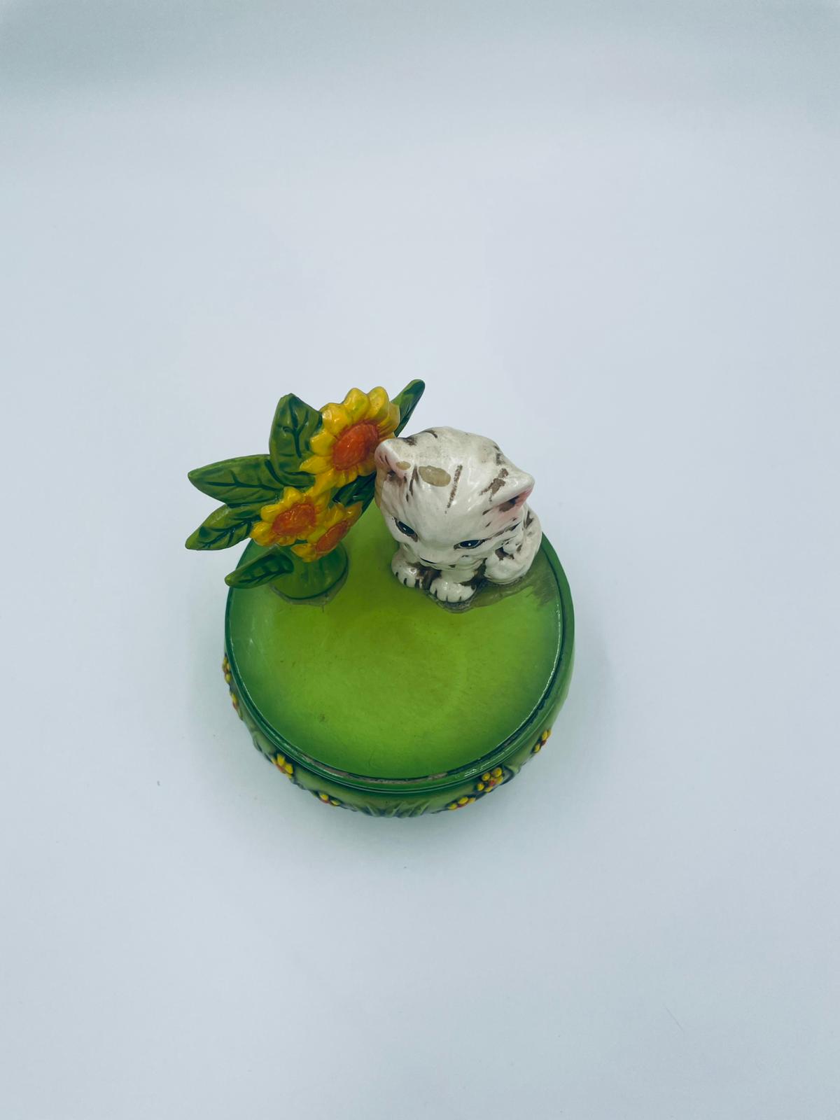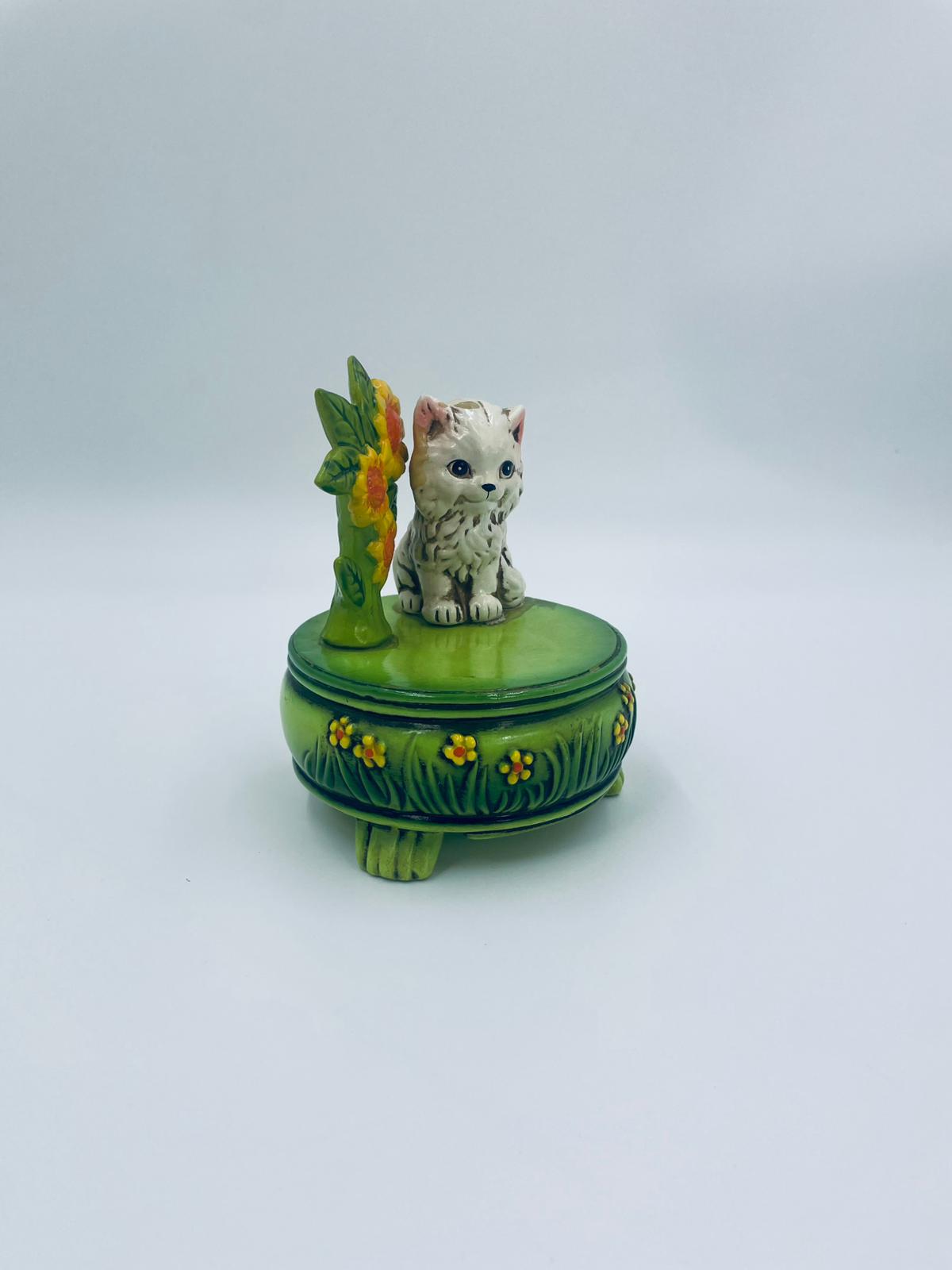 Decorative, collectible music box from the Josef Originals series, made in Japan between 1940 and 1969, made of ceramic. The music box set on three decorative legs, with a figurine of a small cat sitting on a green round box decorated with flowers and a figurine of a bouquet of yellow sunflowers. It has rubbing and scratching.