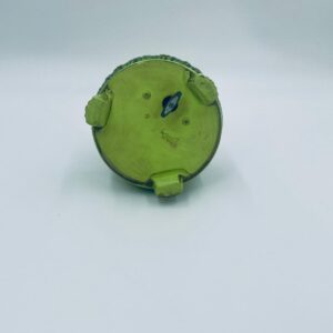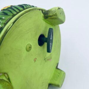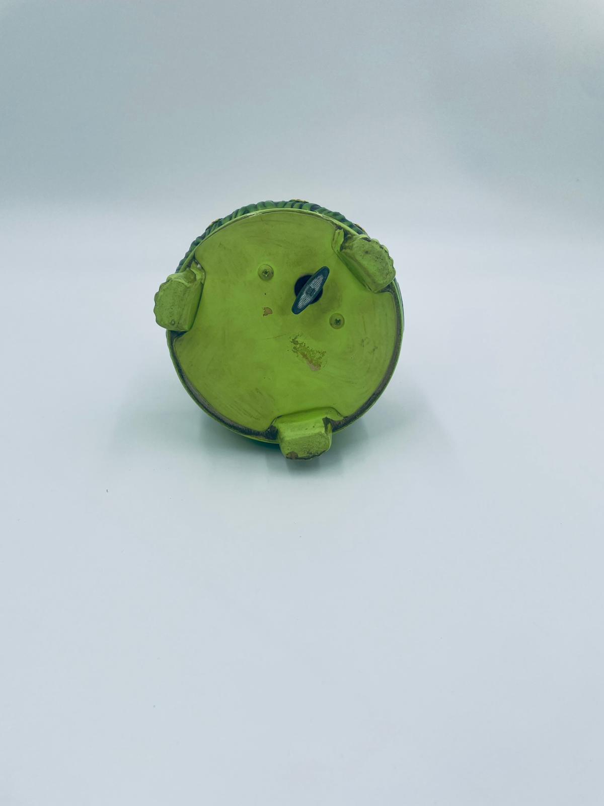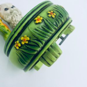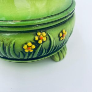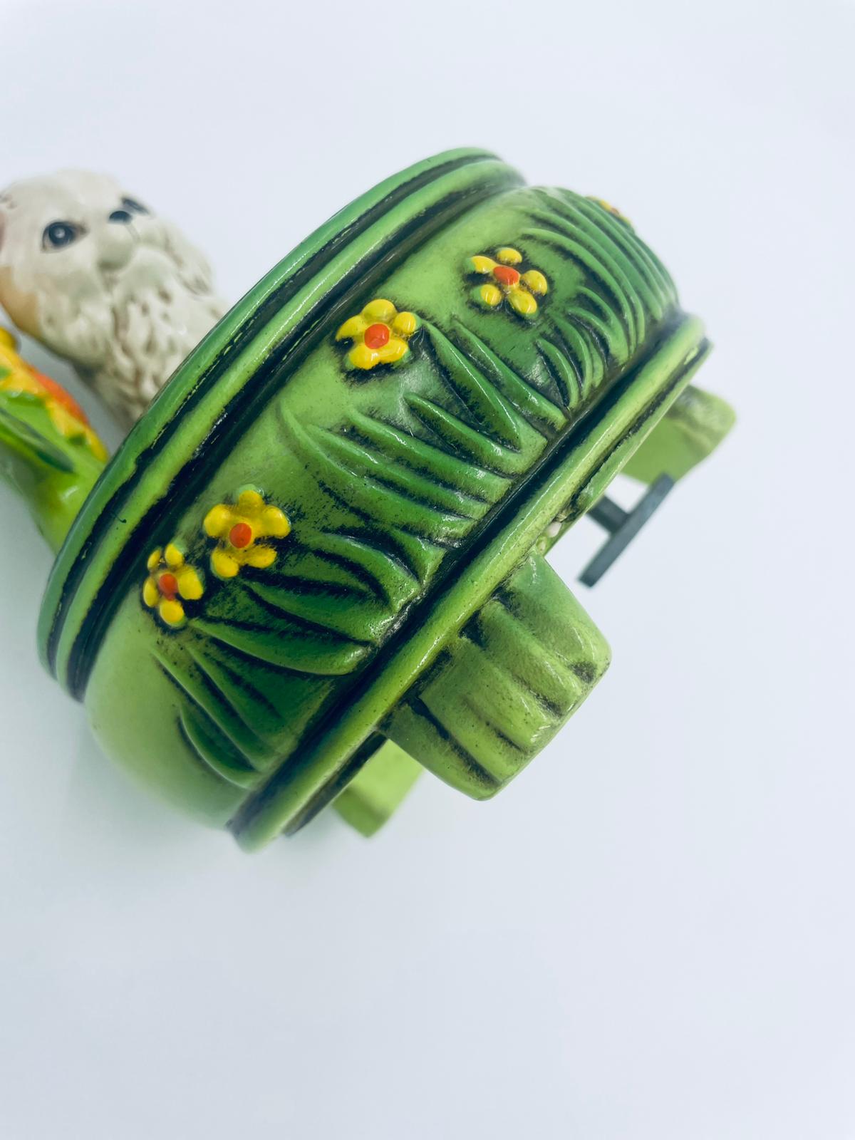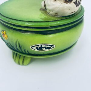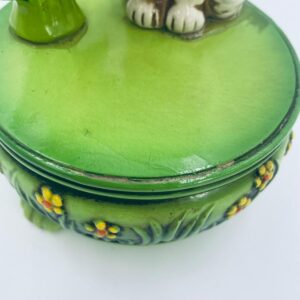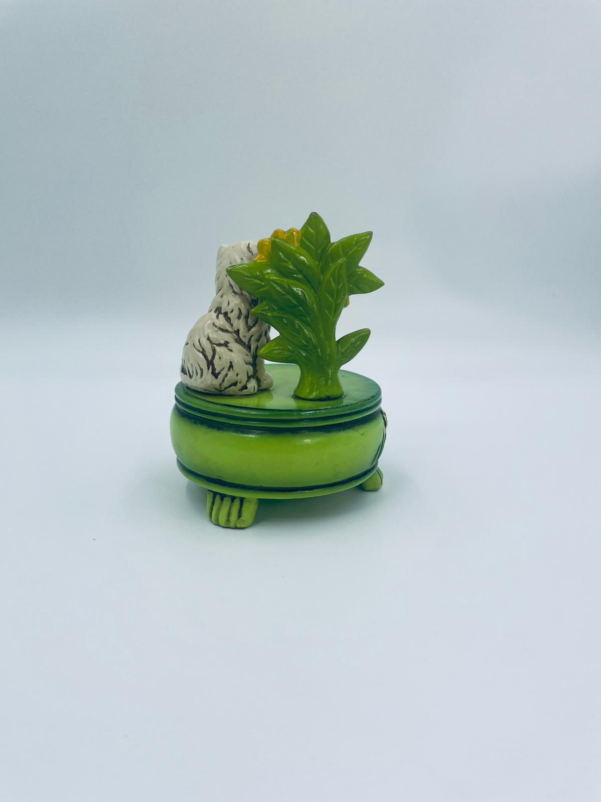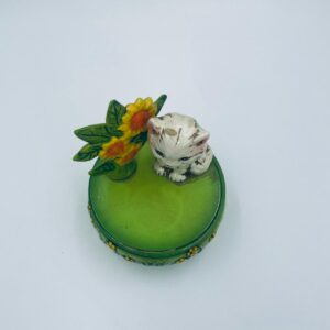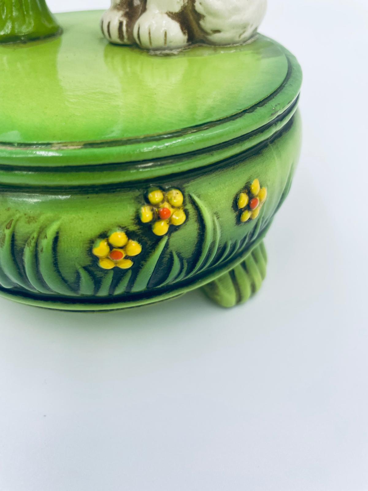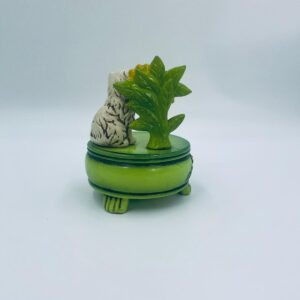 Decorative, collectible music box from the Josef Originals series, made in Japan between 1940 and 1969, made of ceramic. The music box set on three decorative legs, with a figurine of a small cat sitting on a green round box decorated with flowers and a figurine of a bouquet of yellow sunflowers. It has rubbing and scratching.