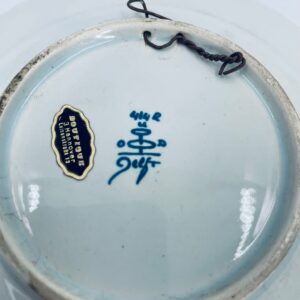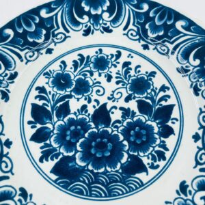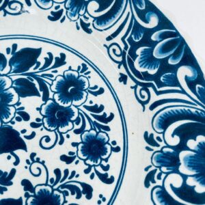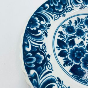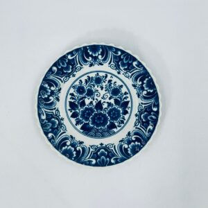 Talerzyk dekoracyjny ścienny, w stylu Vintage typu Delft Blue , wykonany z ceramiki. Talerzyk charakteryzuje się klasycznym holenderskim wzornictwem w kolorze kobaltowym, z motywem kwiatowym w centralnej części, otoczonym bogatym ornamentem na szerokim rancie. Talerzyk posiada falistą krawędź. Posiada pęknięcie szkliwa.