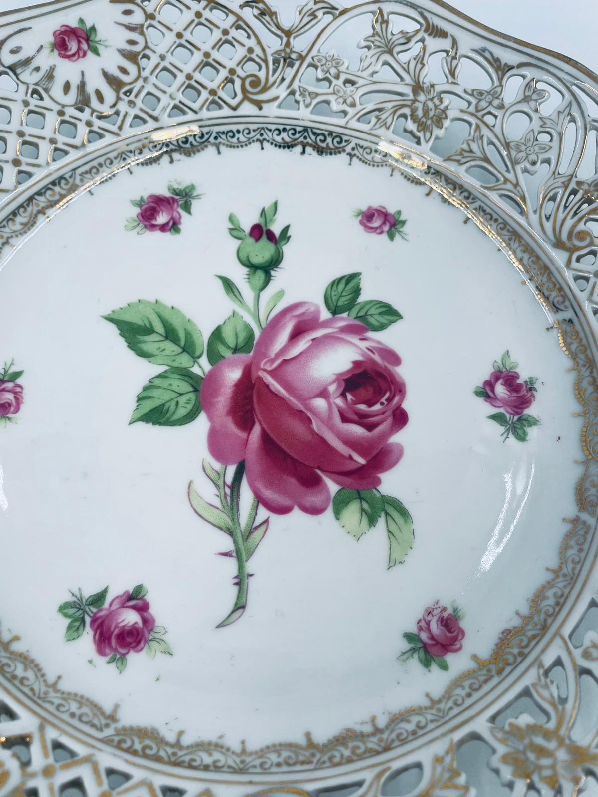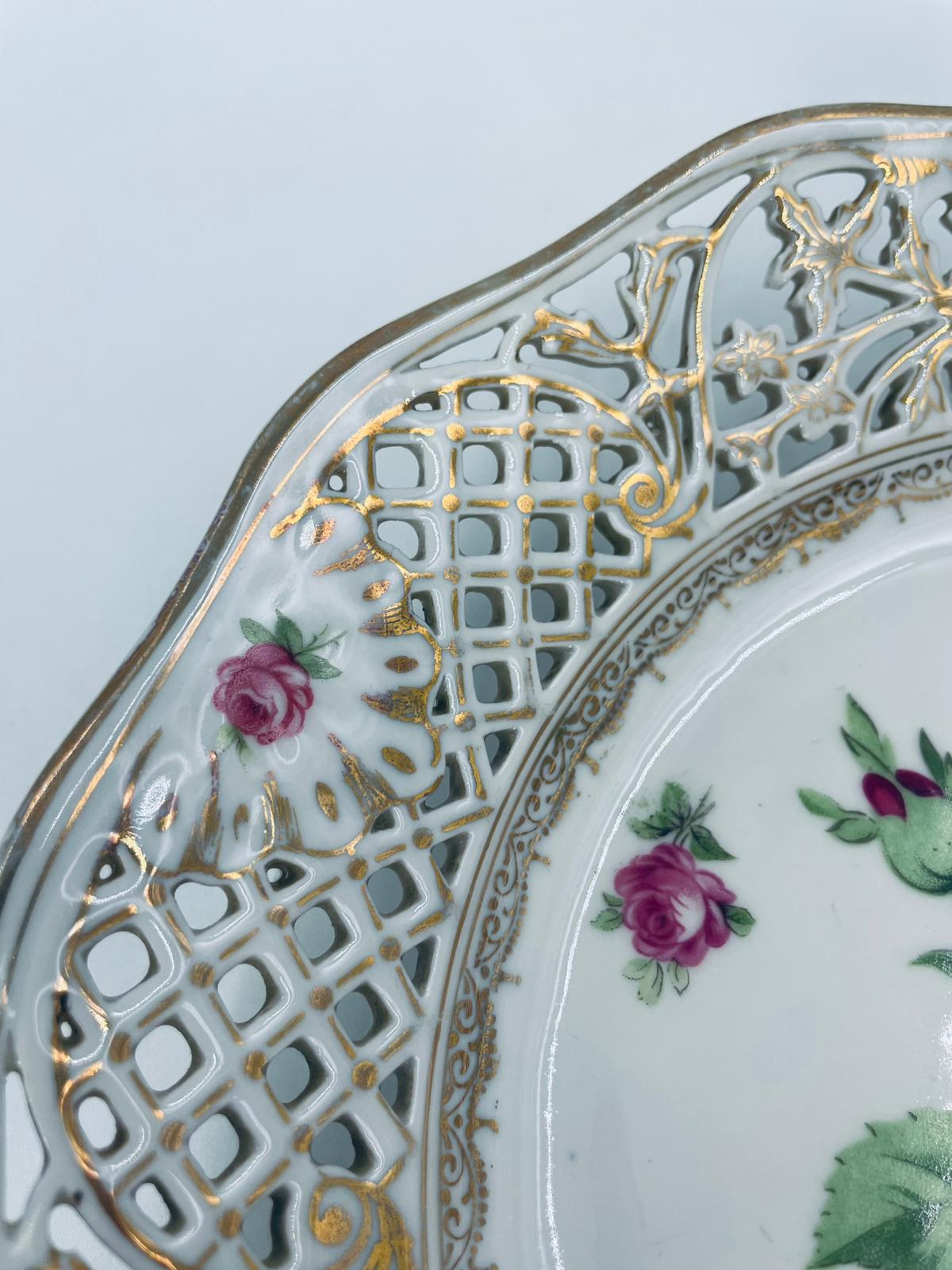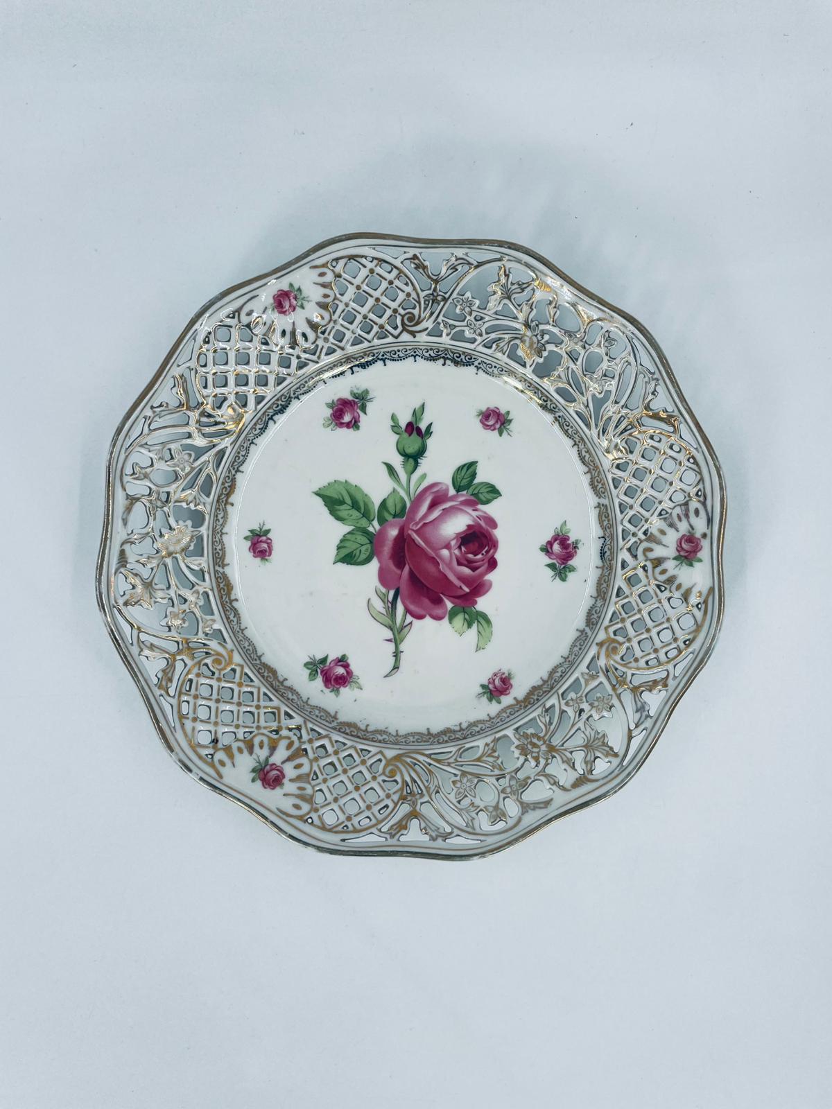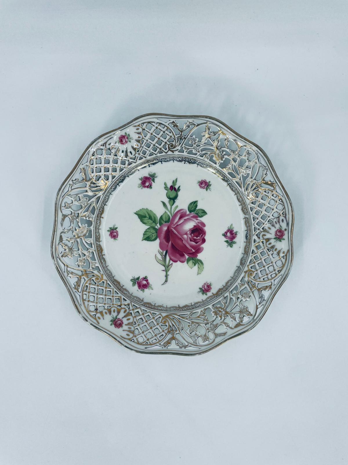 A decorative plate by the Schumann Dresden factory, made of high quality white porcelain. The plate features an openwork rim with gold accents, decorated with a rose motif, with a large central rose and smaller roses, finished with gilding on the wavy rim. It has rubbing on the gilding.