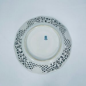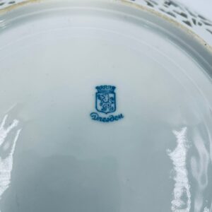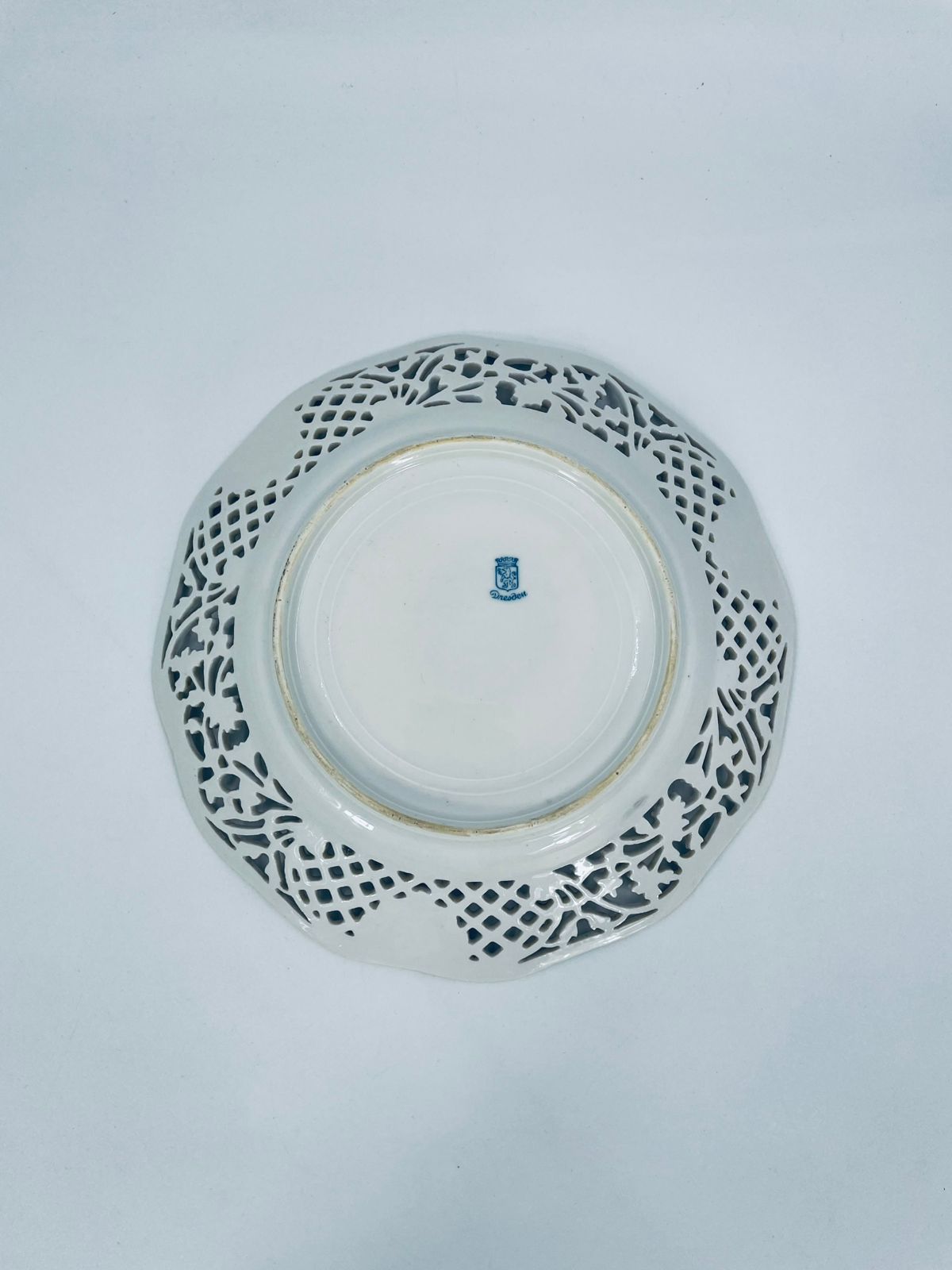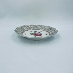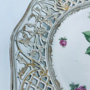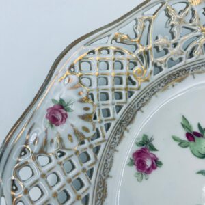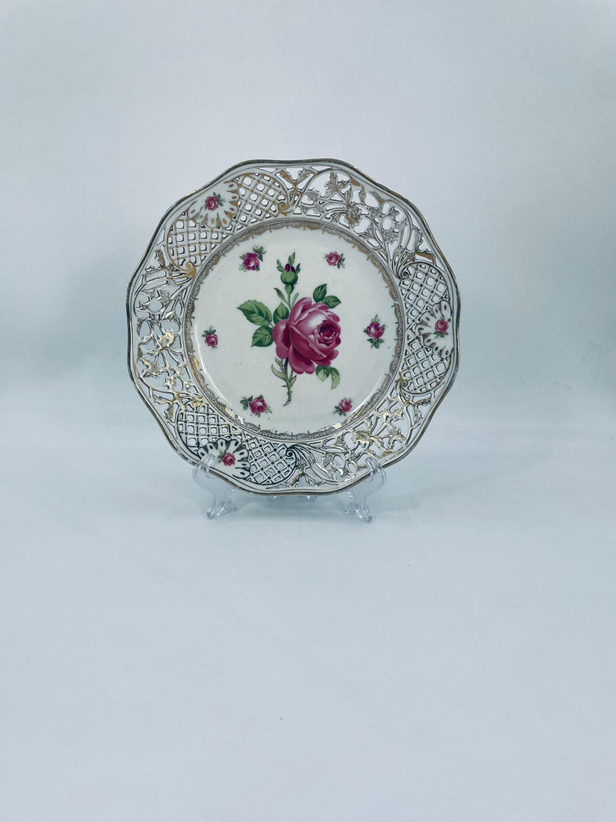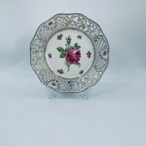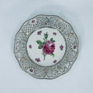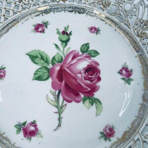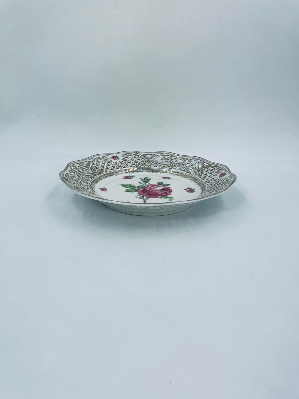 A decorative plate by the Schumann Dresden factory, made of high quality white porcelain. The plate features an openwork rim with gold accents, decorated with a rose motif, with a large central rose and smaller roses, finished with gilding on the wavy rim. It has rubbing on the gilding.