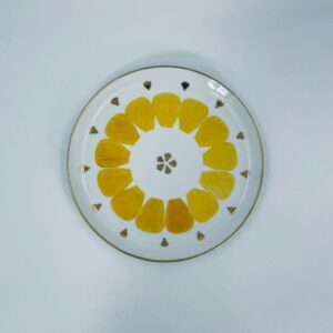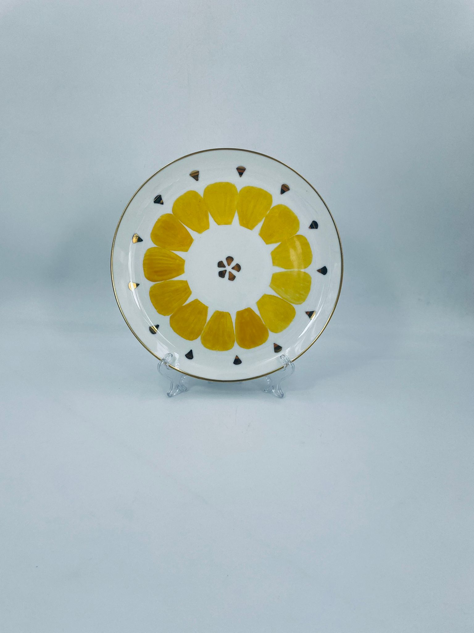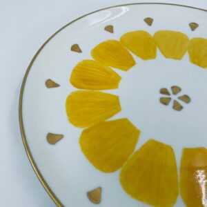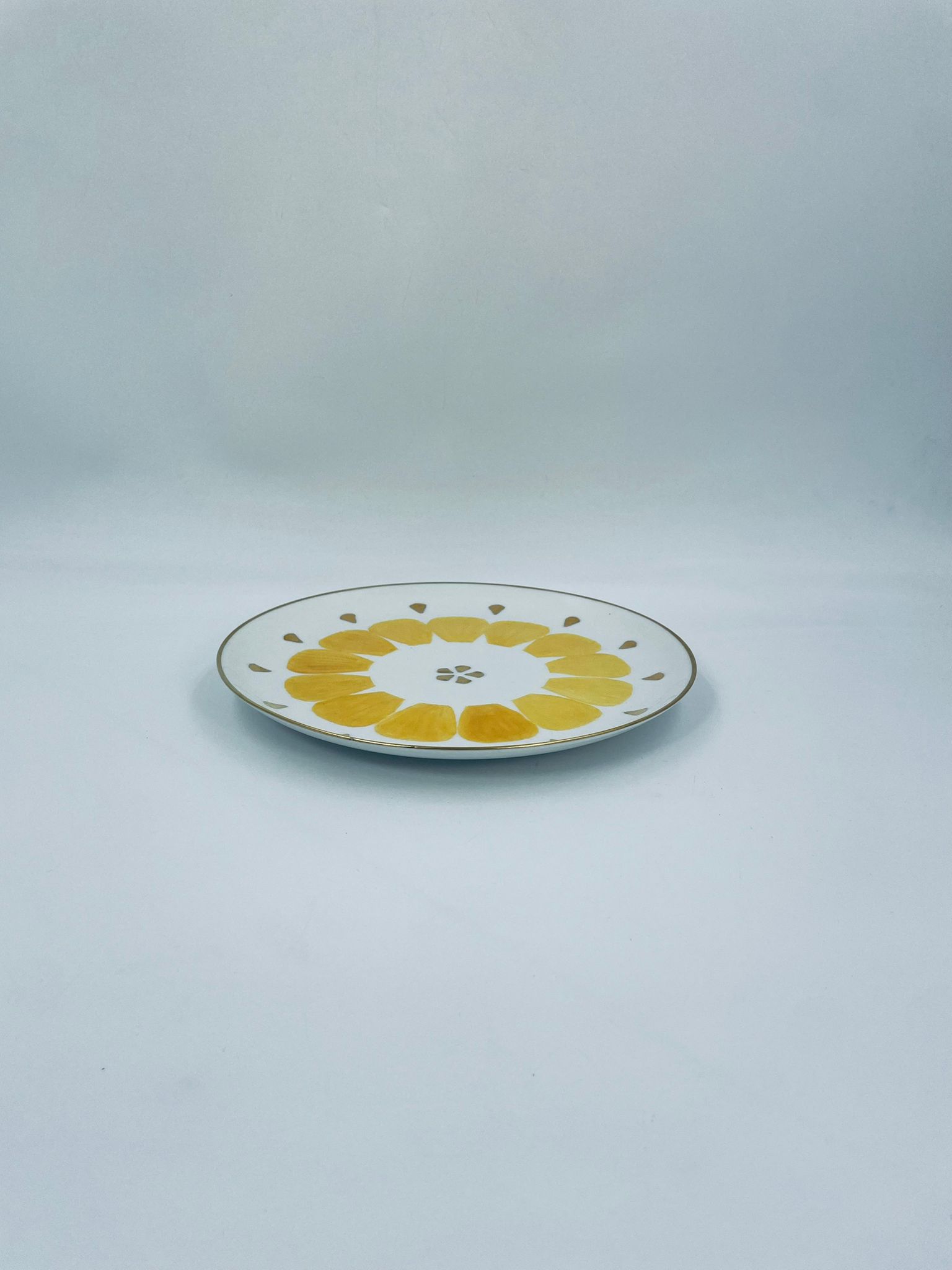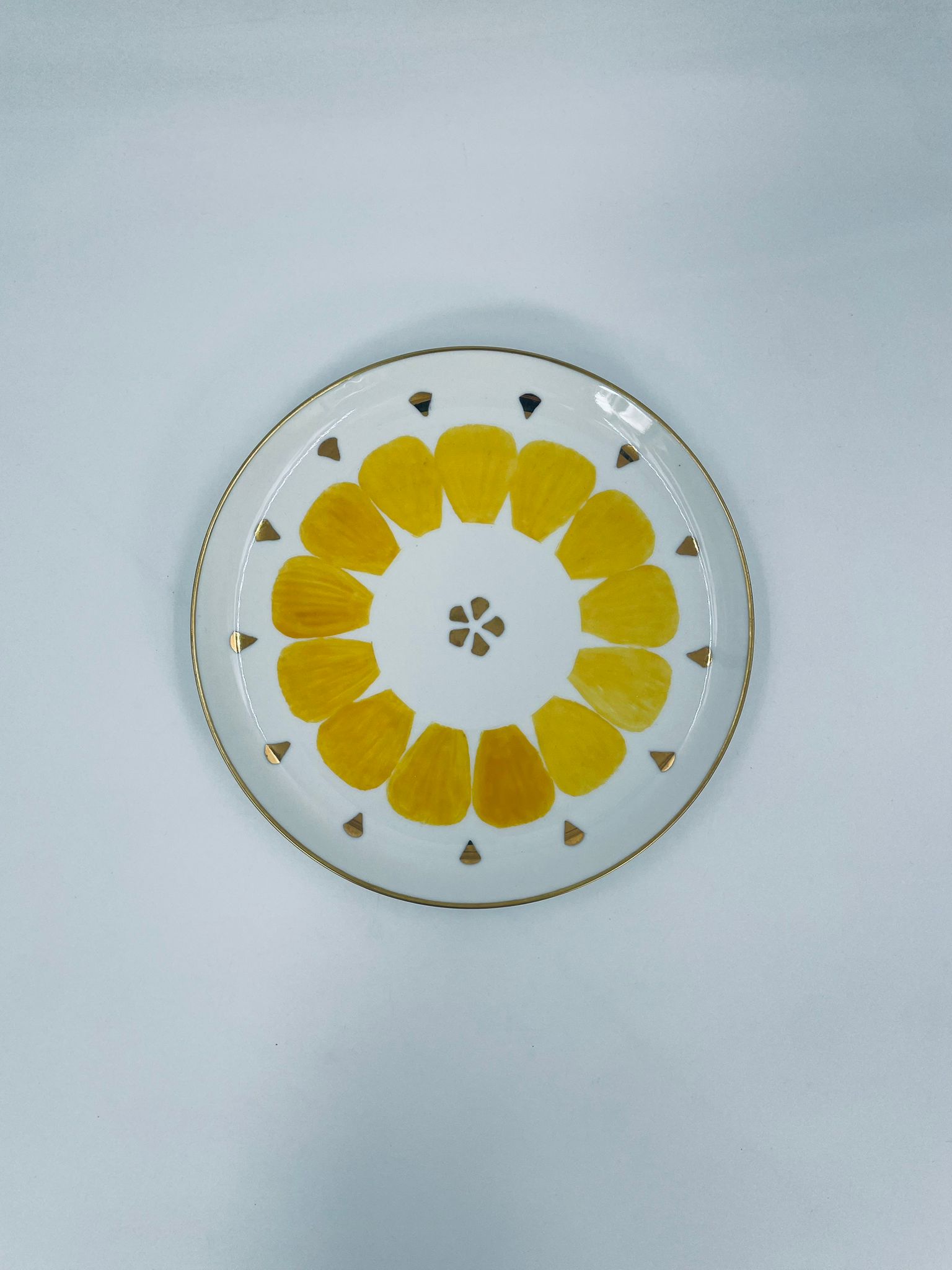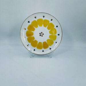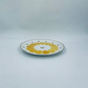 Decorative flat plate by the Arzberg label , made of high quality white porcelain. The plate is characterised by hand-painted yellow petal-shaped decorative elements, gold accents, finished with gilding on the rim.