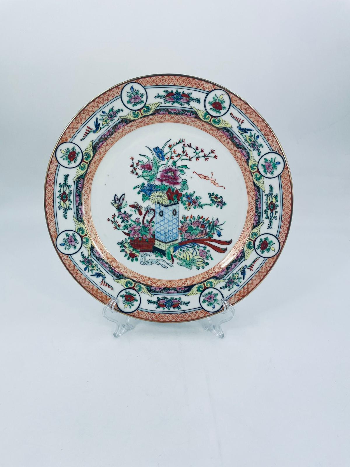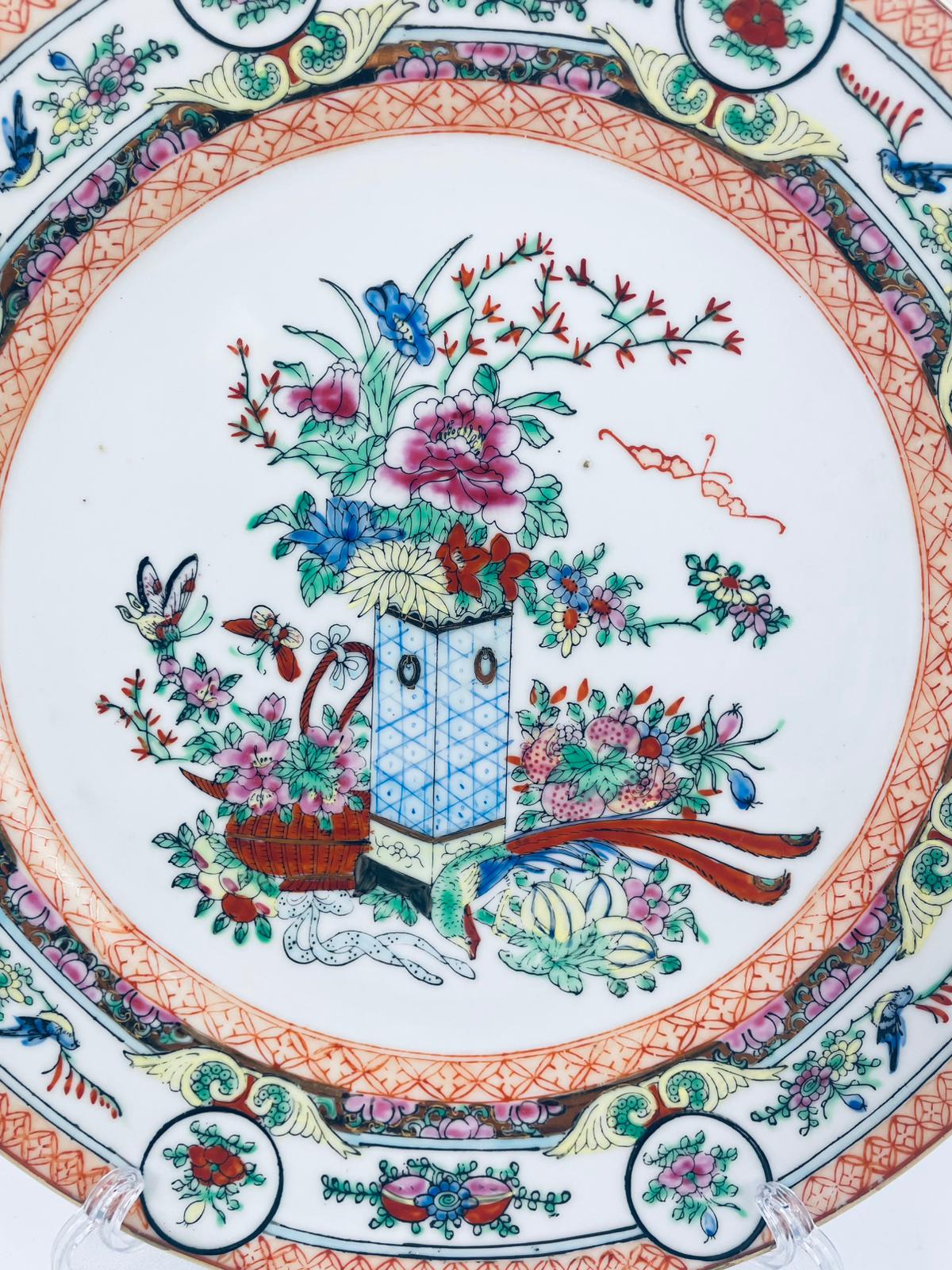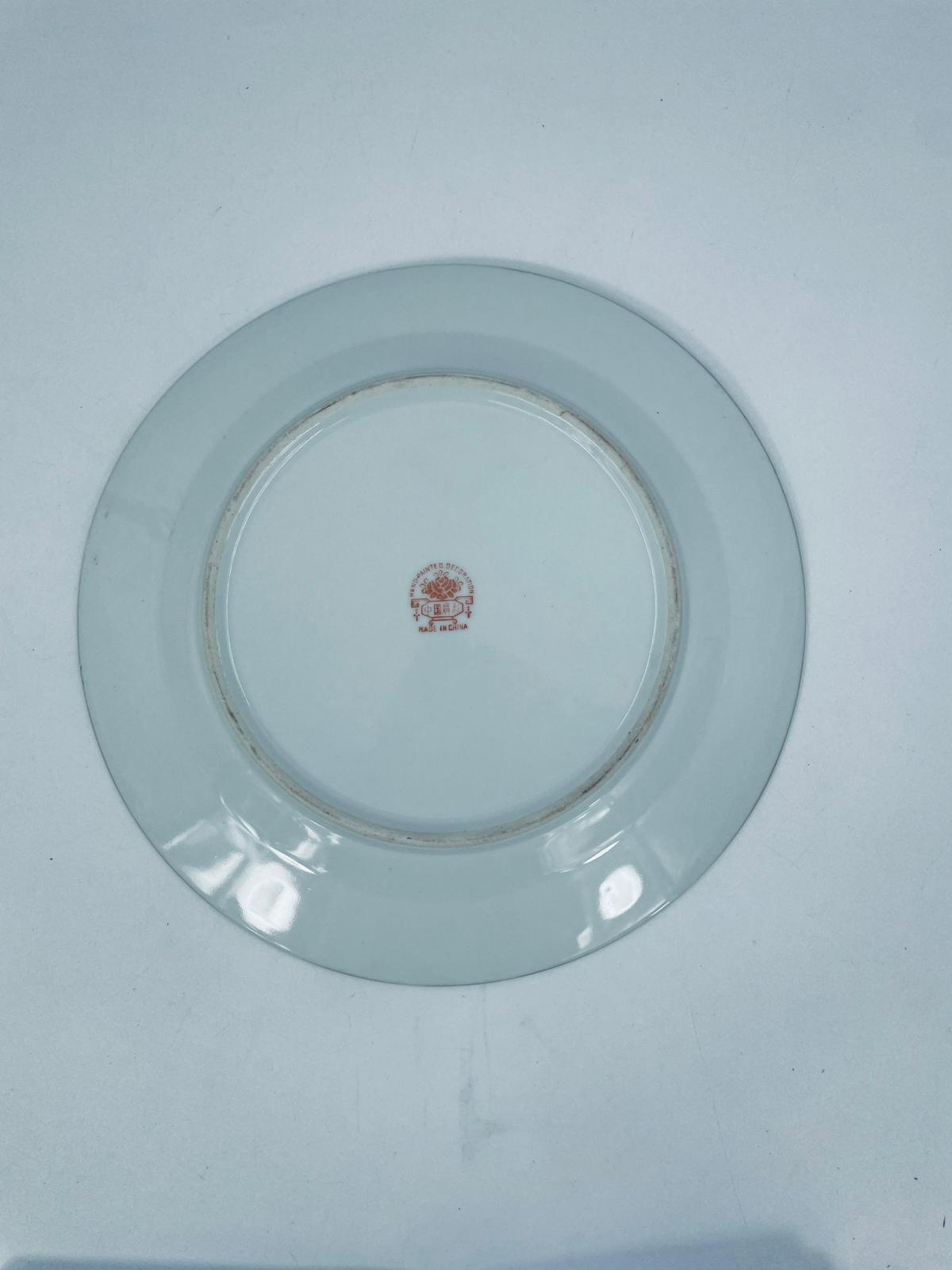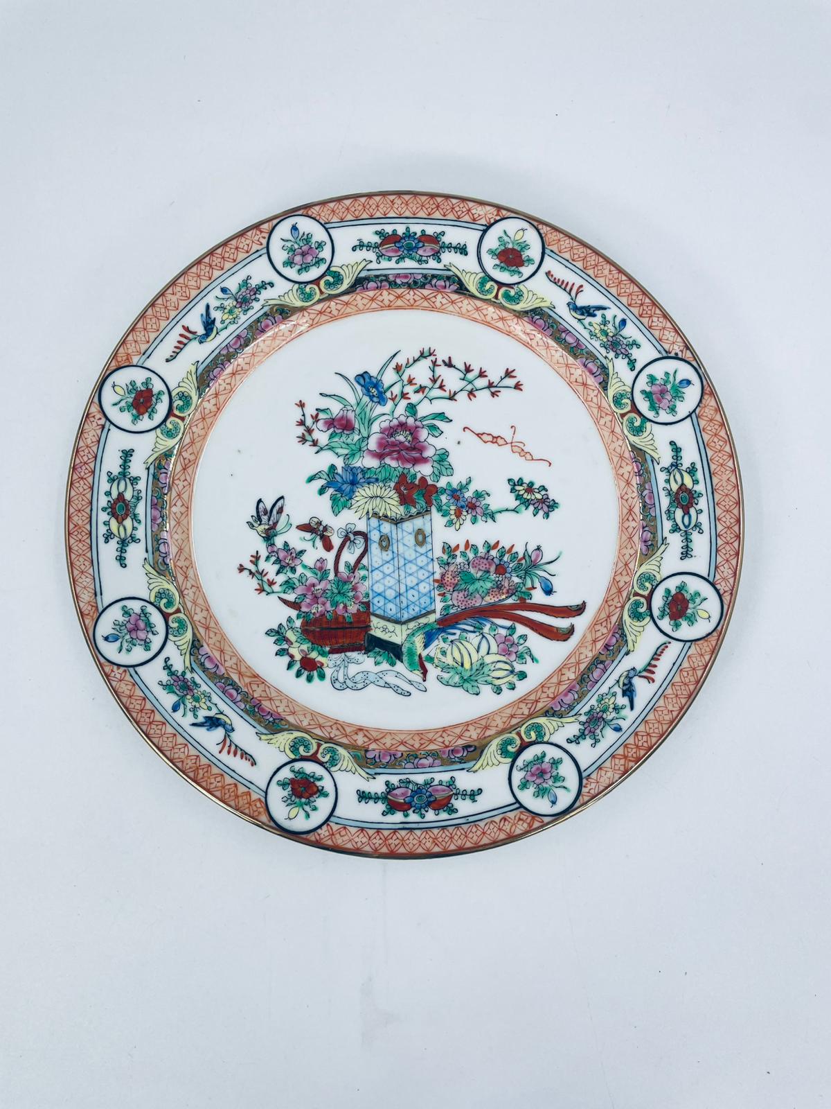 Old collector's plate, hand painted. Porcelain in white with a motif of flowers, insects and birds. Finished with gilding on the rims. Rubbing on the underside of the plate due to use.