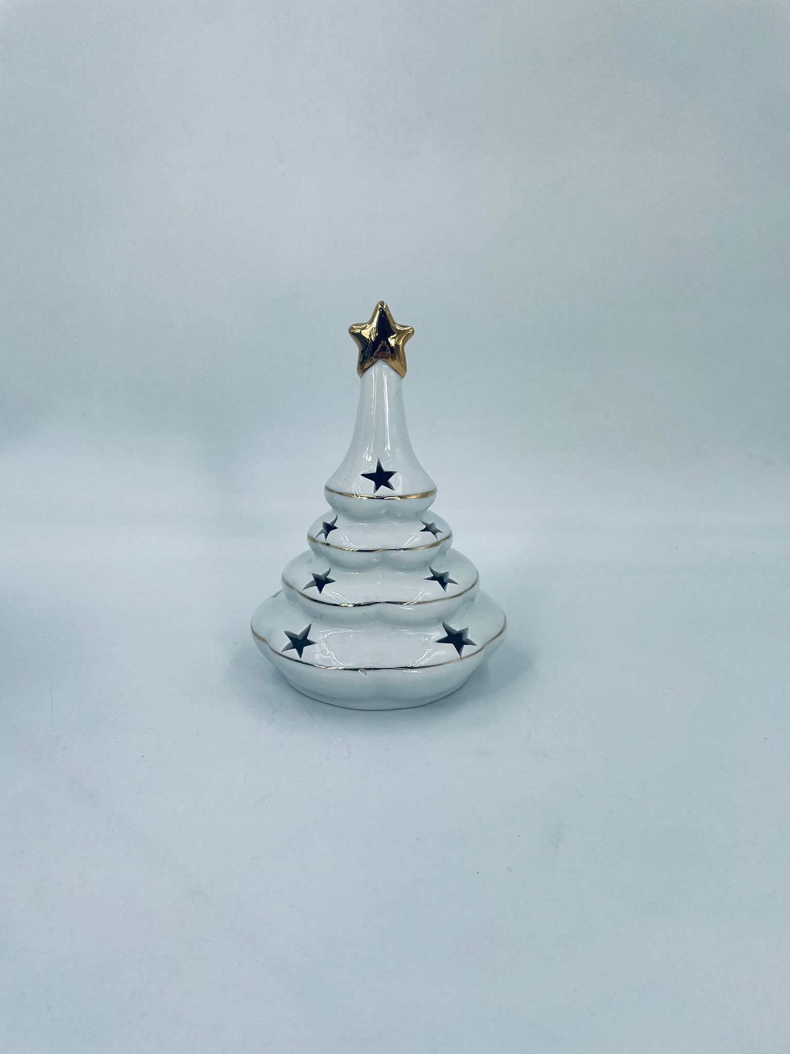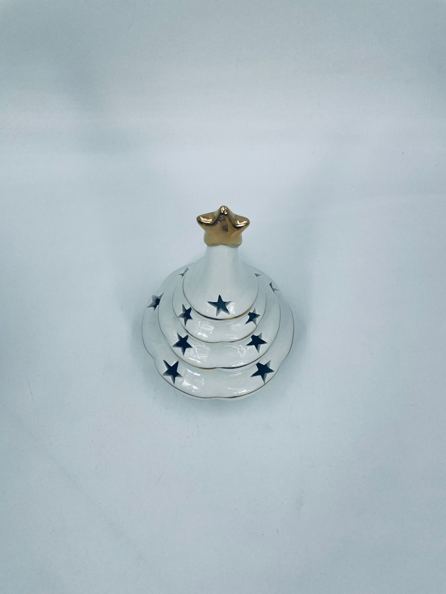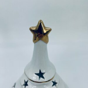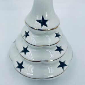 A decorative candle holder in vintage style, made of high-quality white porcelain. The candle holder is shaped like a Christmas tree with a decorative golden star-shaped tip, finished with gilding. The candle holder has star-shaped cut-outs through which the light shines.