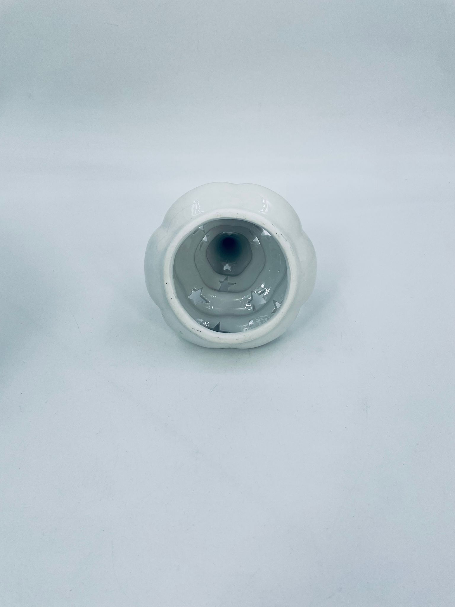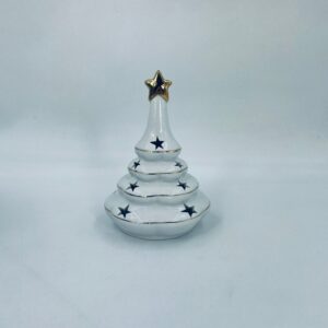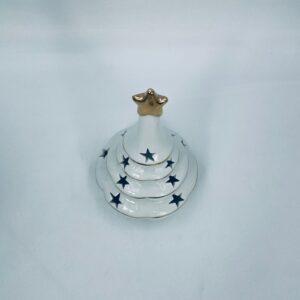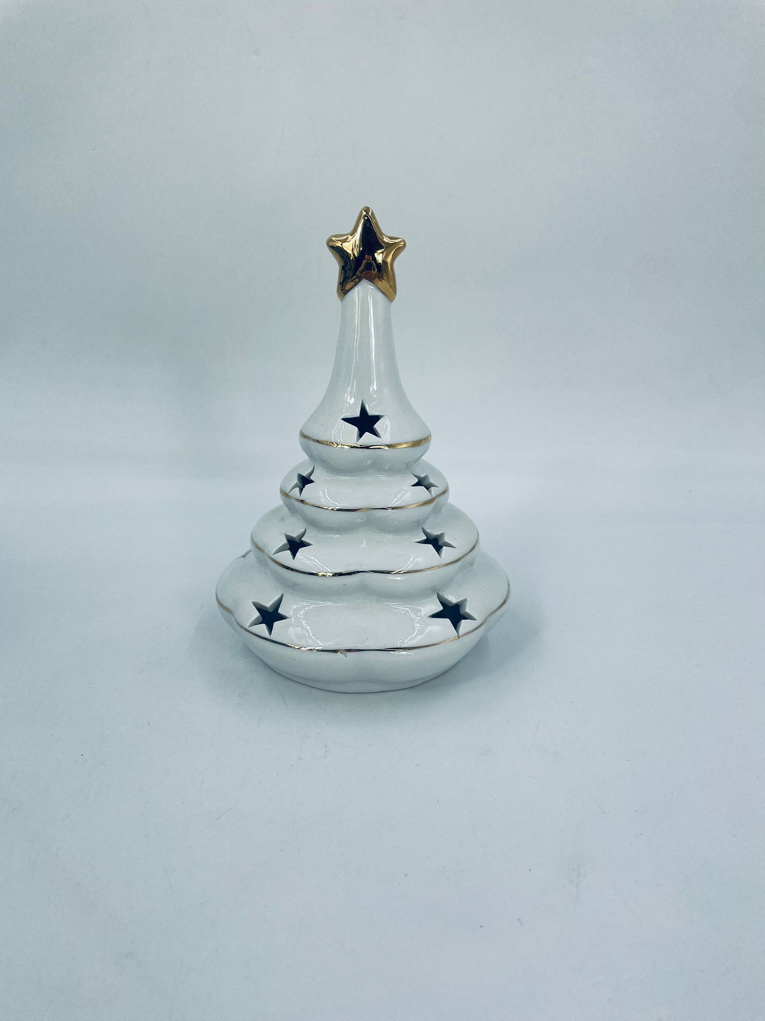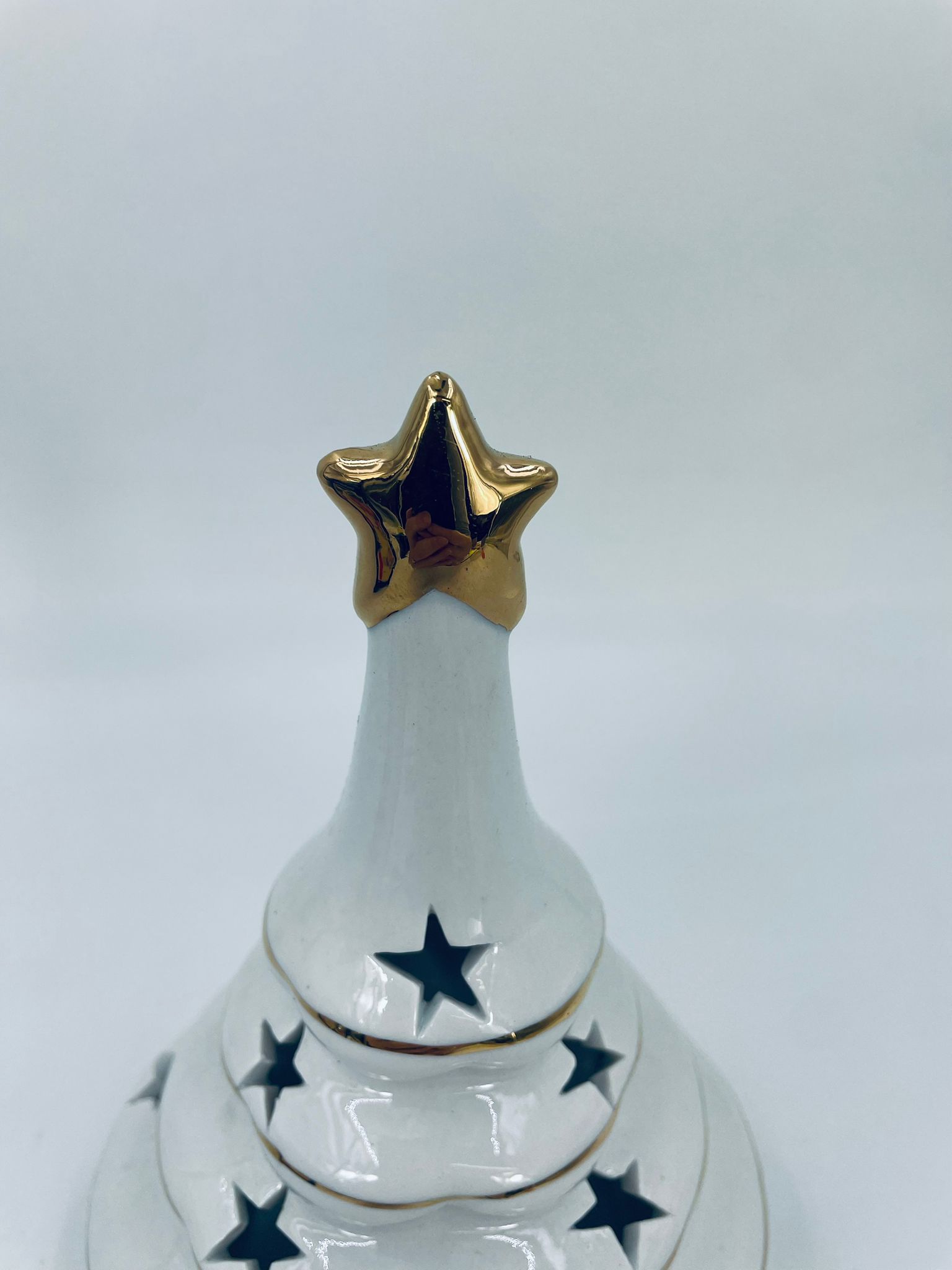 A decorative candle holder in vintage style, made of high-quality white porcelain. The candle holder is shaped like a Christmas tree with a decorative golden star-shaped tip, finished with gilding. The candle holder has star-shaped cut-outs through which the light shines.