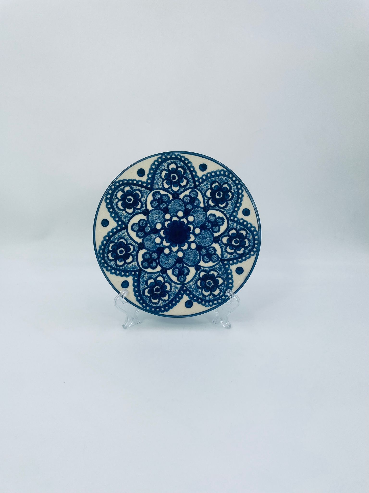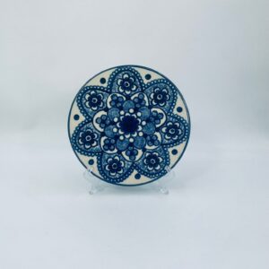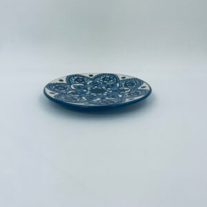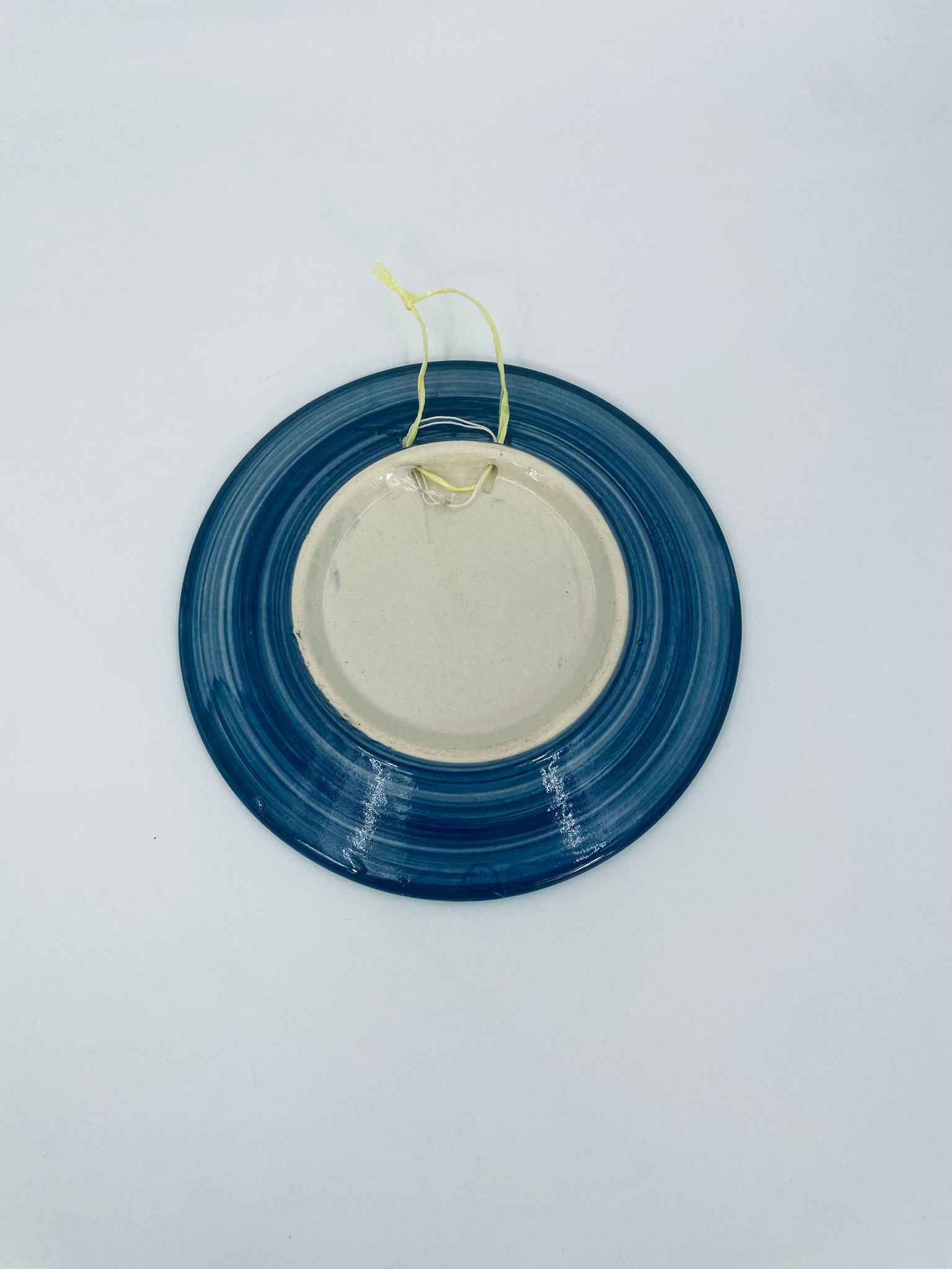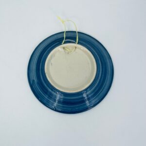 Vintage style decorative wall plate, made of ecru coloured ceramic. The plate features hand-painted decoration in cobalt blue.