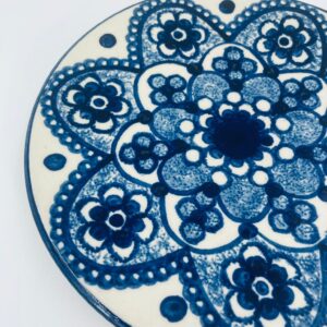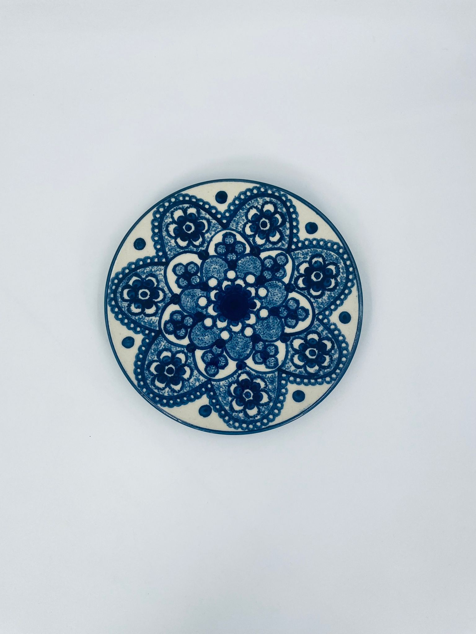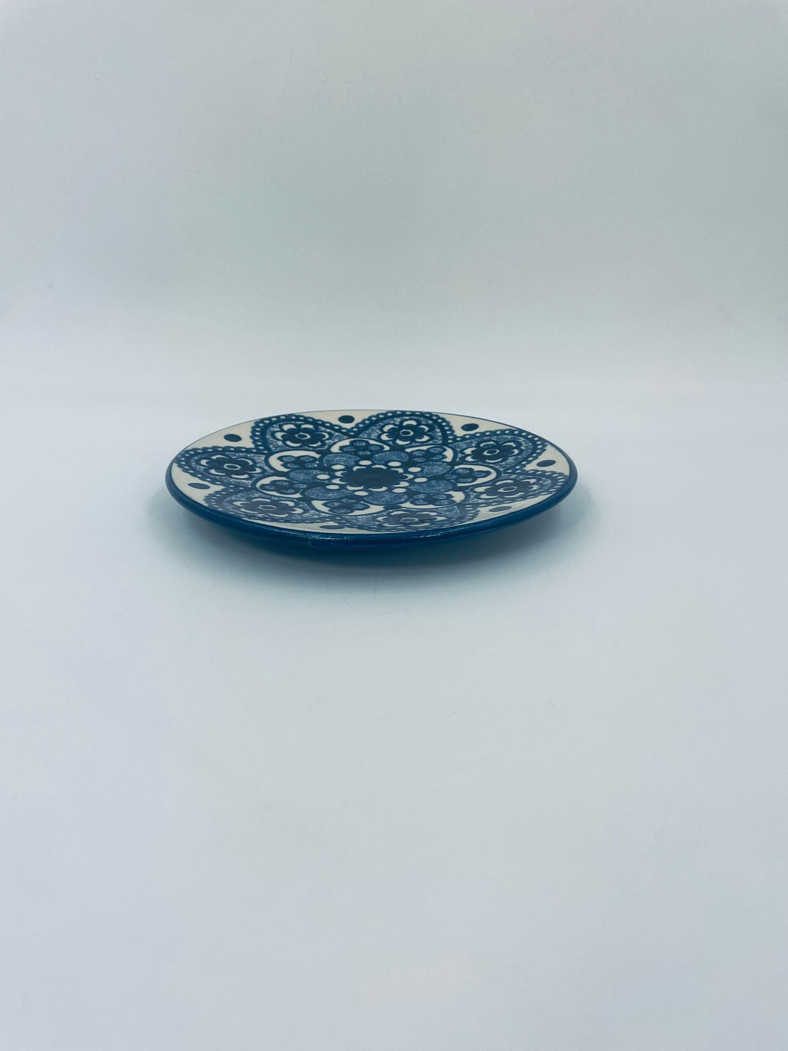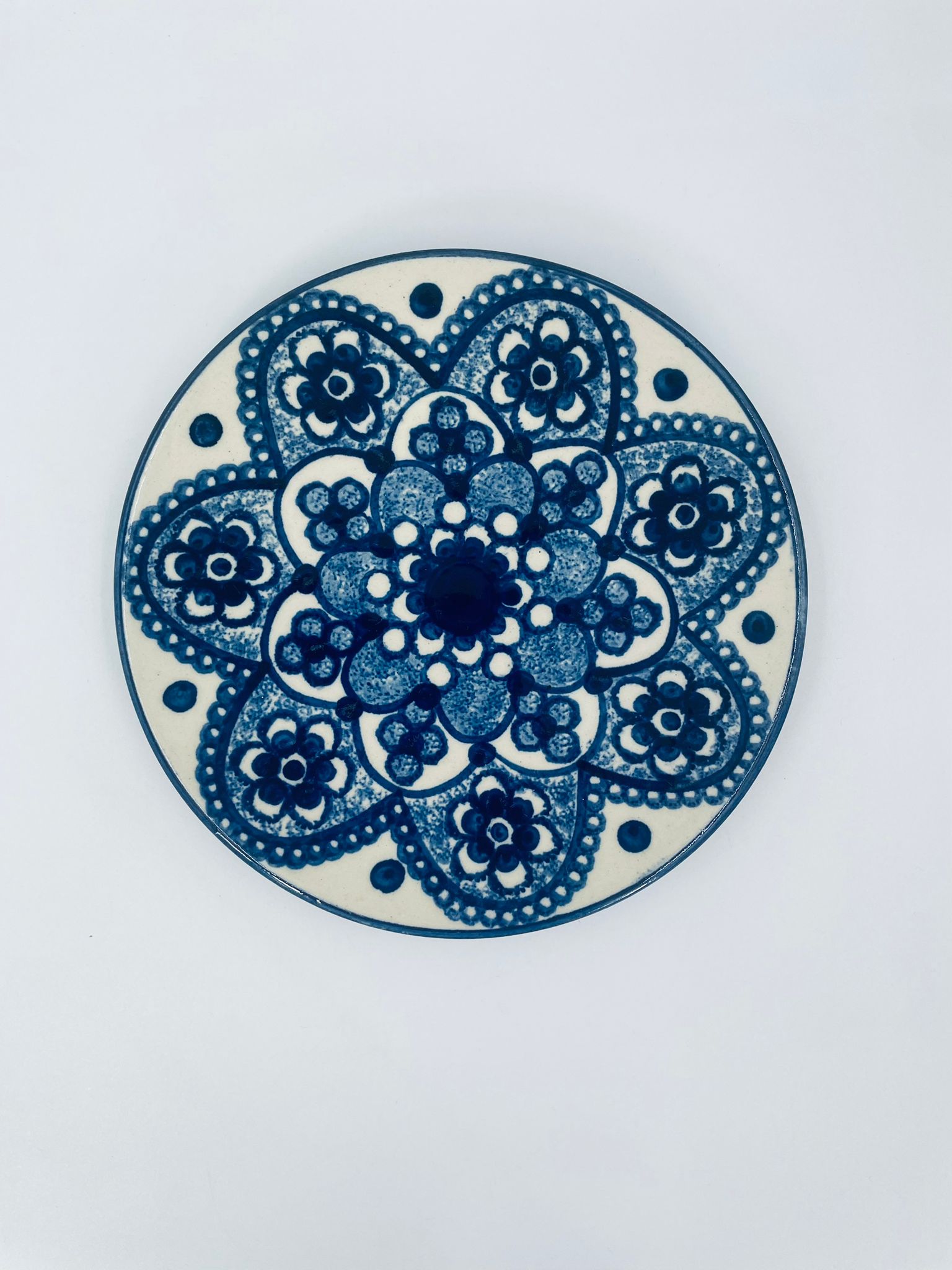 Vintage style decorative wall plate, made of ecru coloured ceramic. The plate features hand-painted decoration in cobalt blue.
