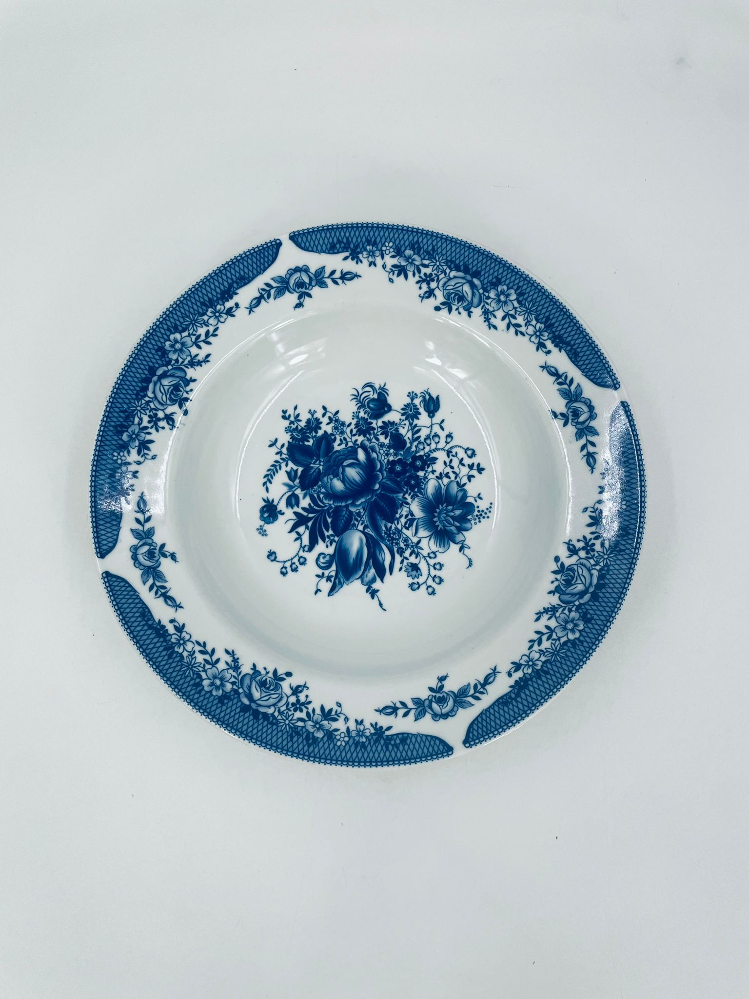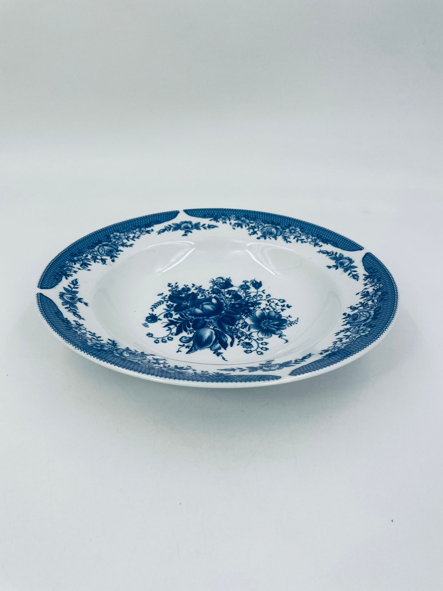 Deep plate by Kahla in white hard vegan porcelain. It is distinguished by the beautiful flower bouquet design in the centre of the plate and the decorative blue rim with flower motifs and mesh.