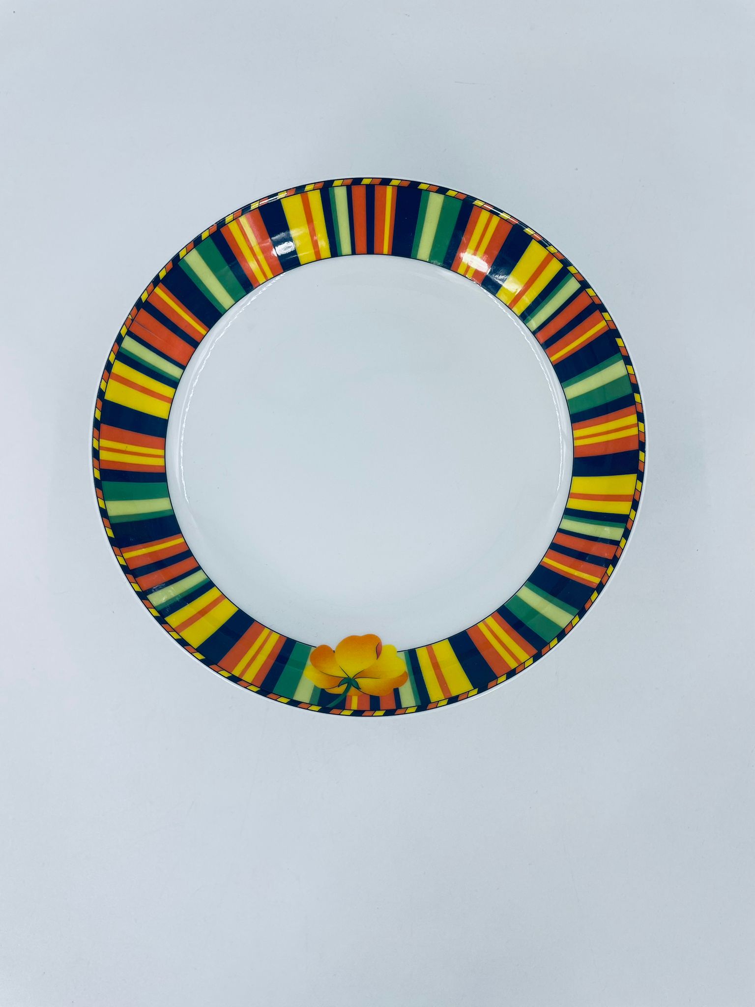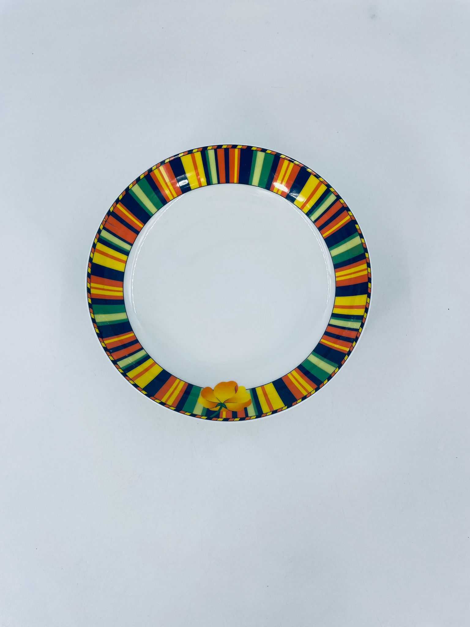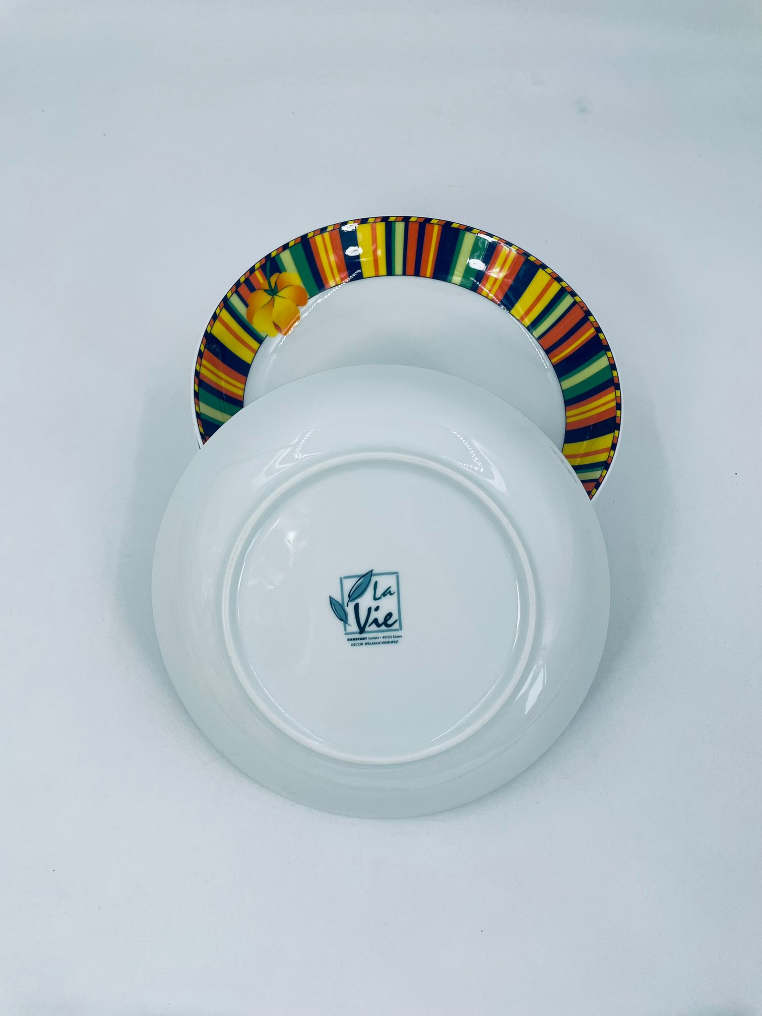 A deep plate by La Vie with a decorative, distinctive multicoloured pattern and flower.