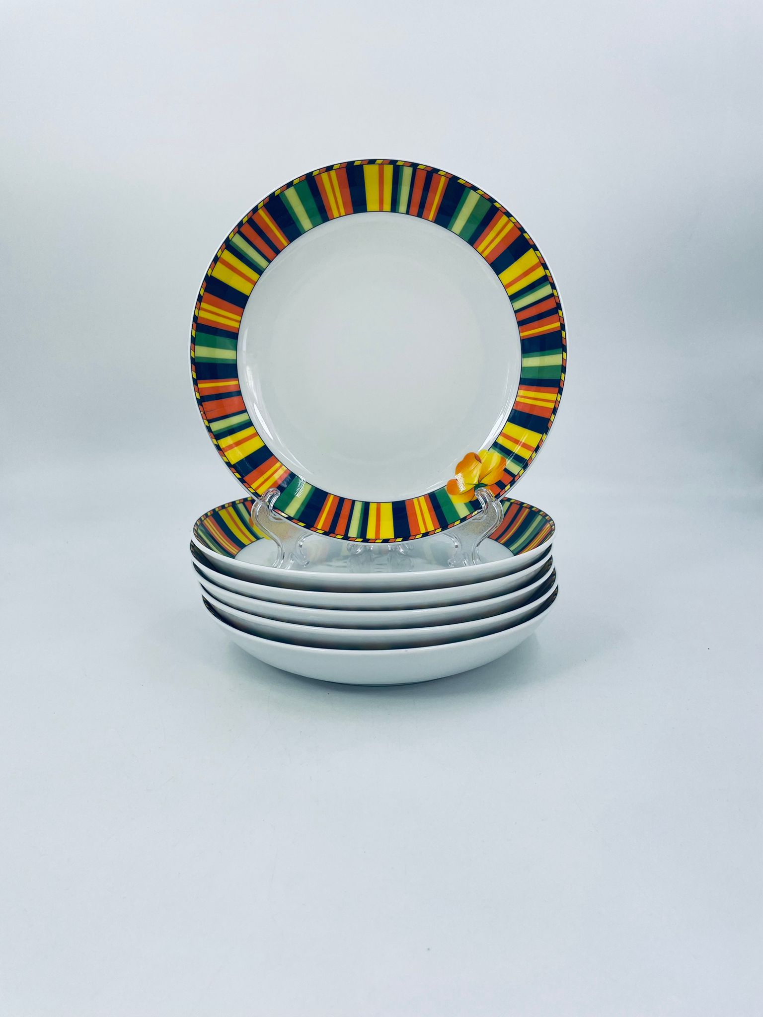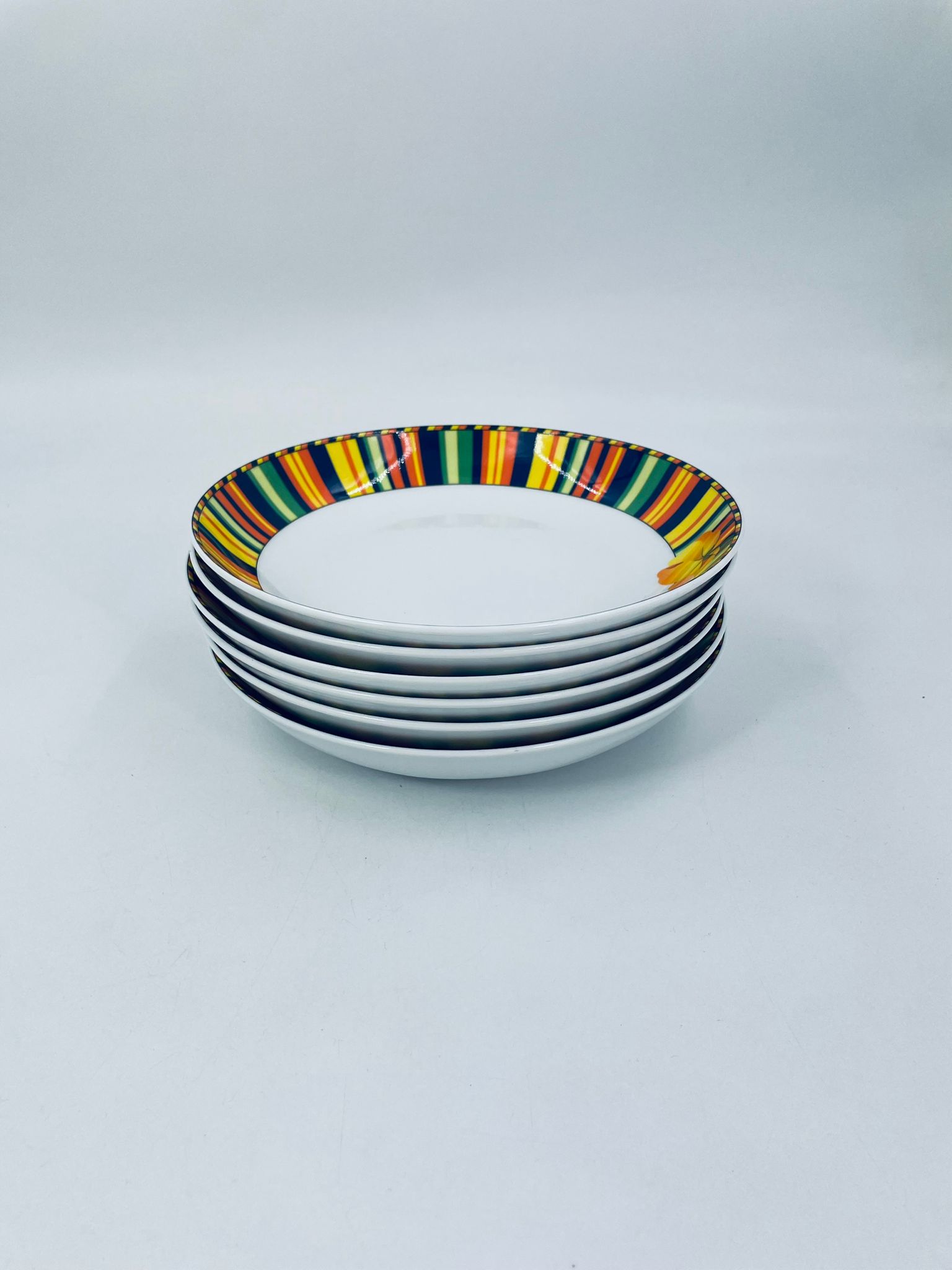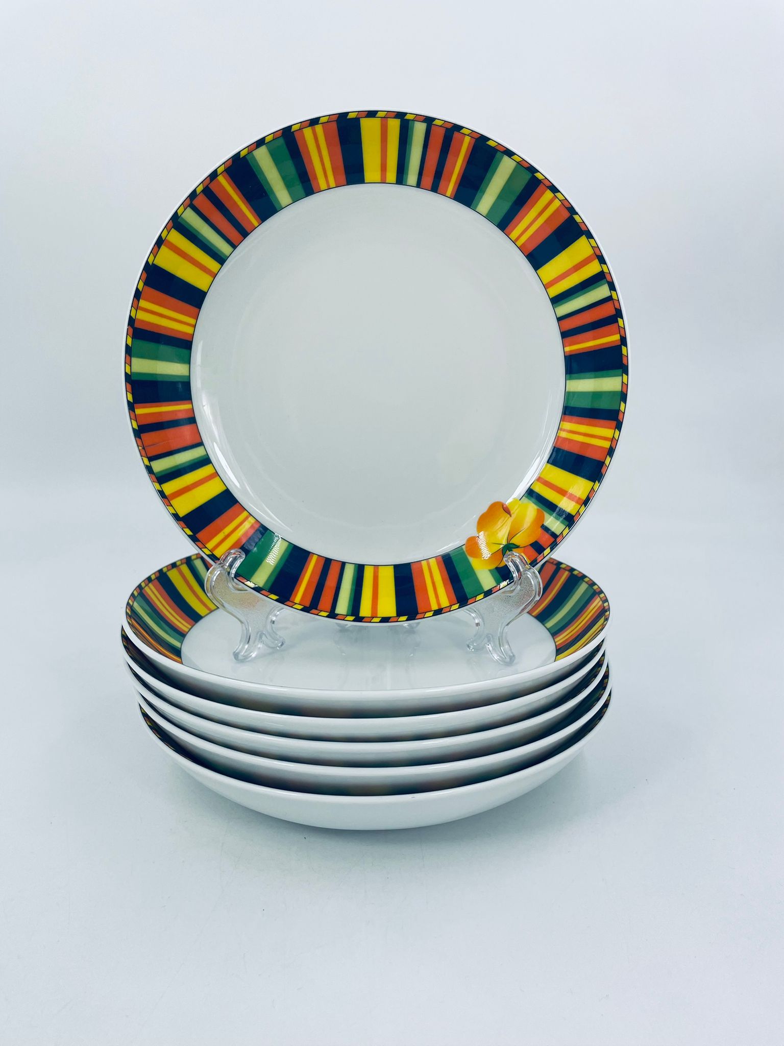 A deep plate by La Vie with a decorative, distinctive multicoloured pattern and flower.