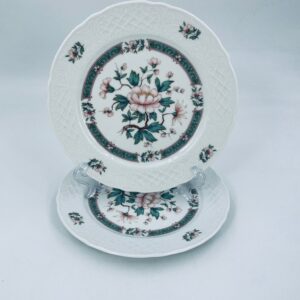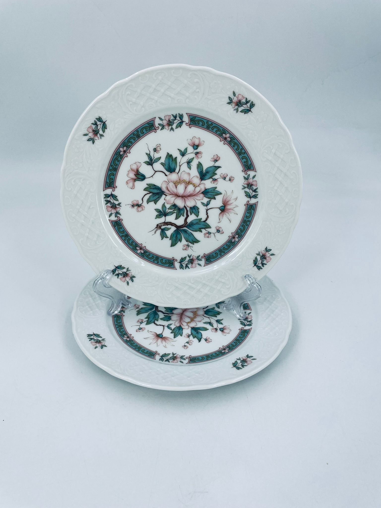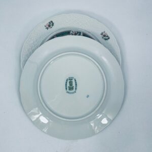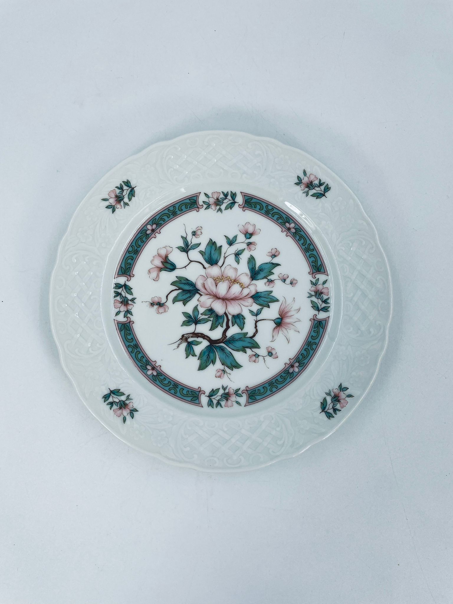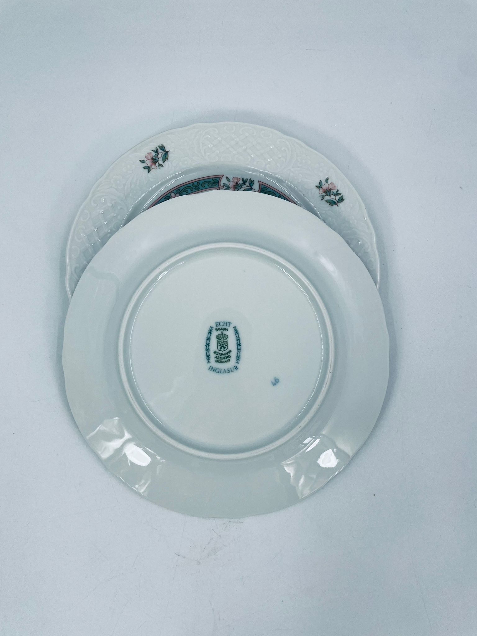 Talerz deserowy wytwórni Echt Schumann z wysokiej jakości białej porcelany. Motywem na talerzu jest wzór delikatnych różowych kwitów z zielonymi liśćmi.