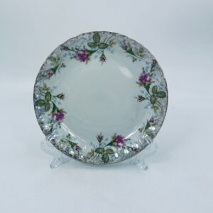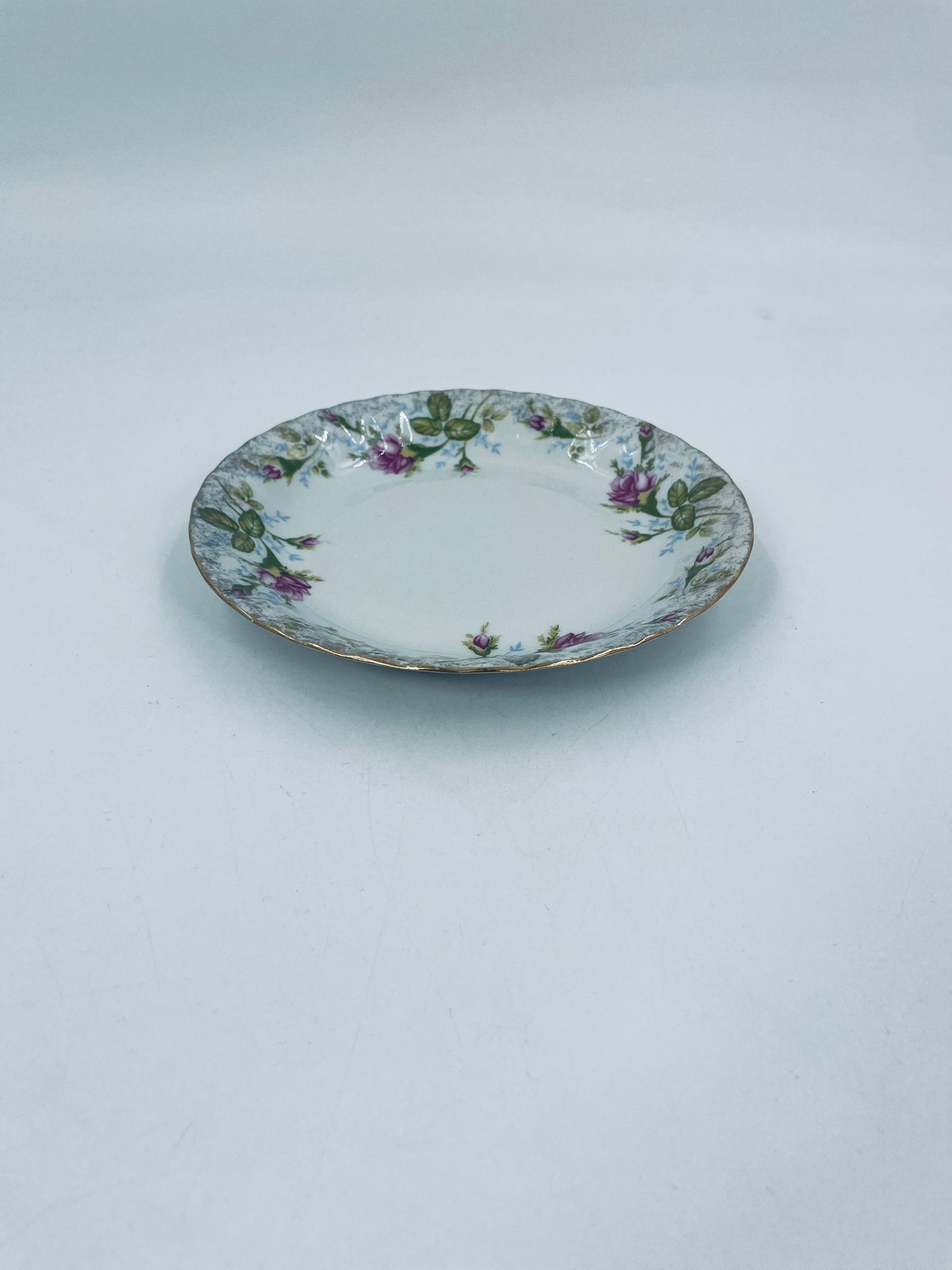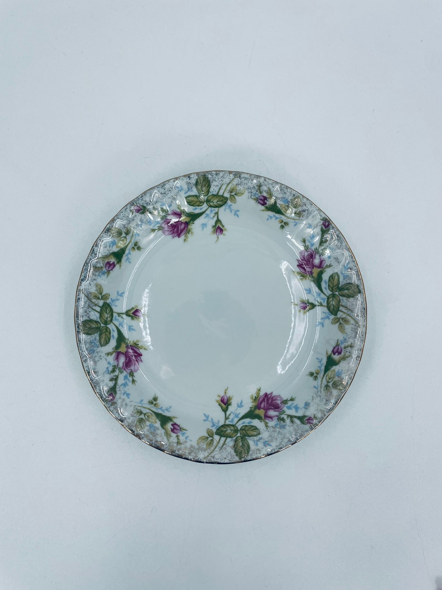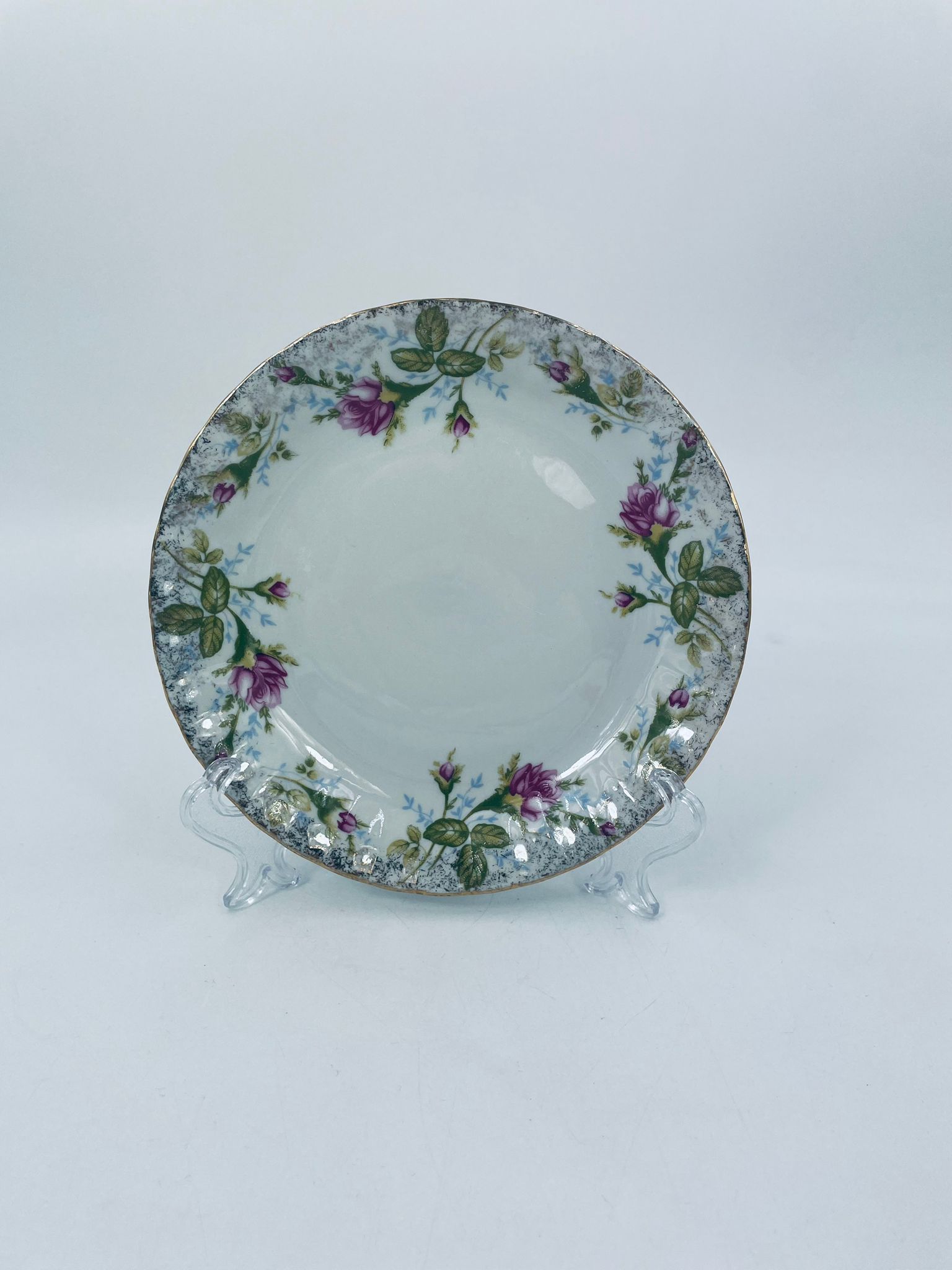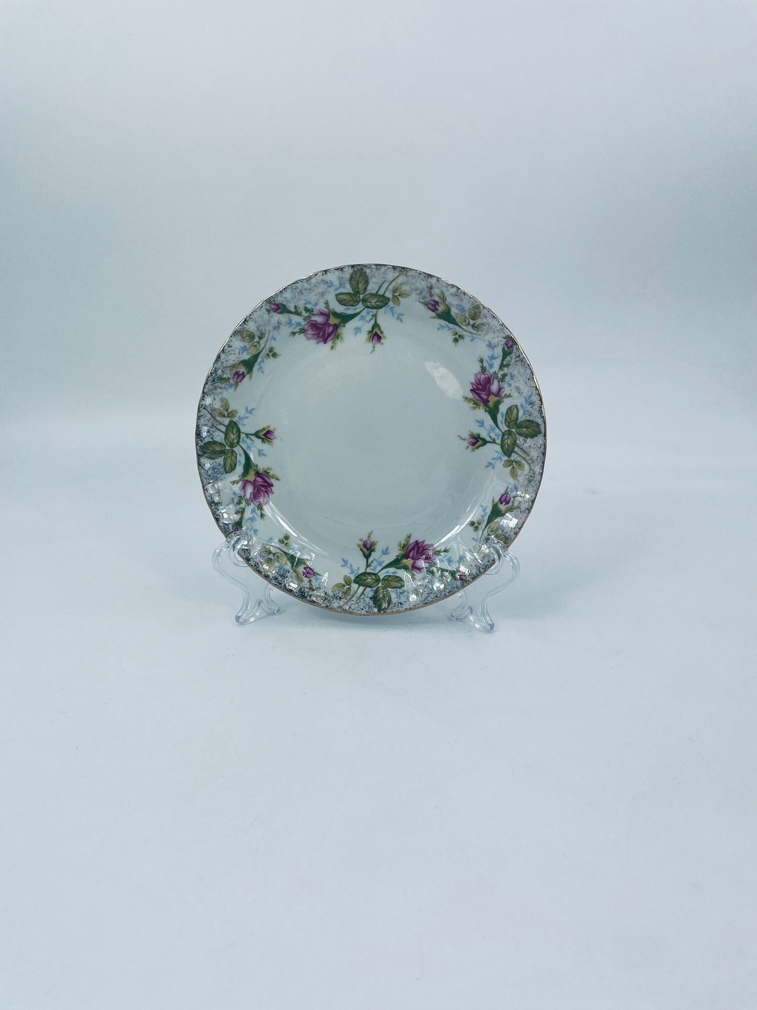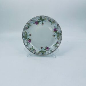 Dessert plate by the Polish porcelain factory Chodzież, cut Iwona golden rose, made of high quality white porcelain with a distinctive stylish decoration of beautiful pink roses with green branches. The plate is richly decorated and finished with gilding.