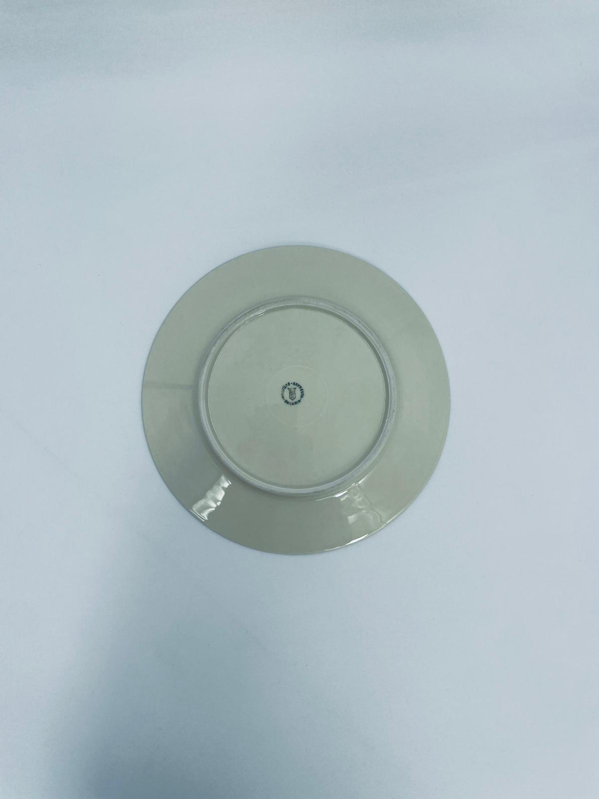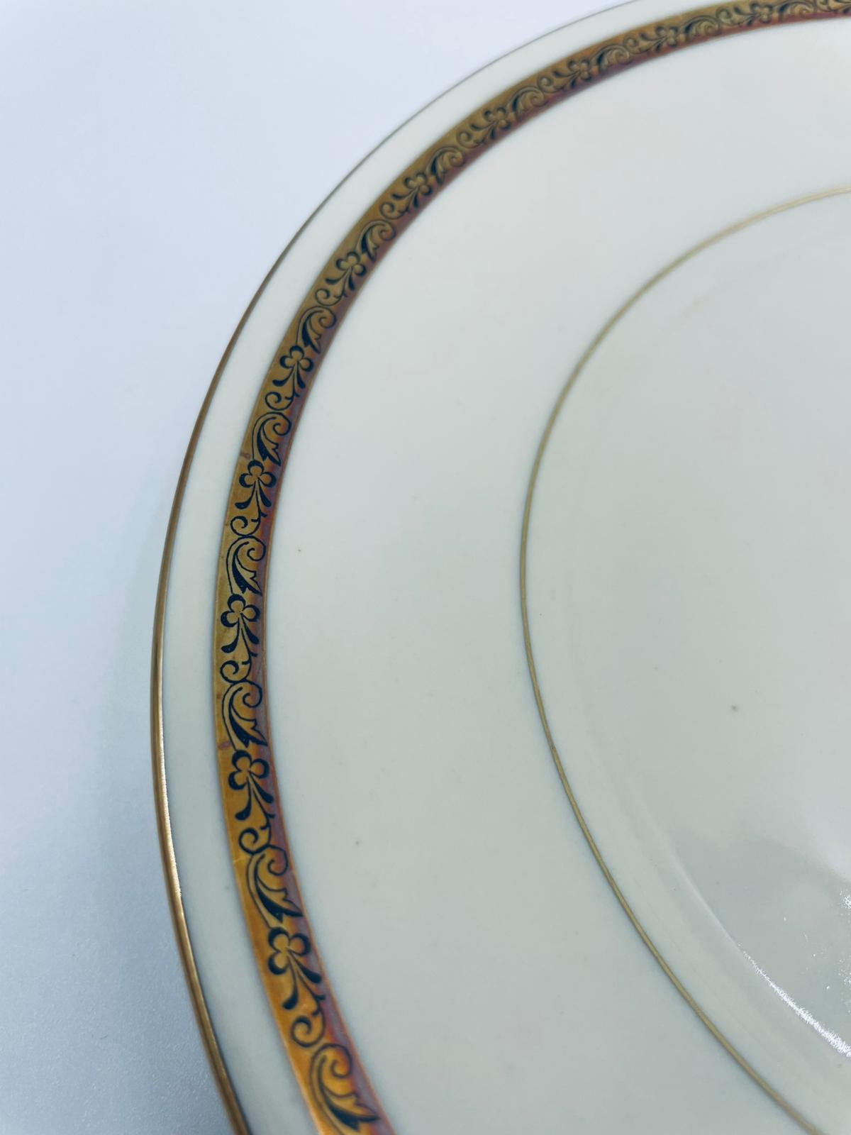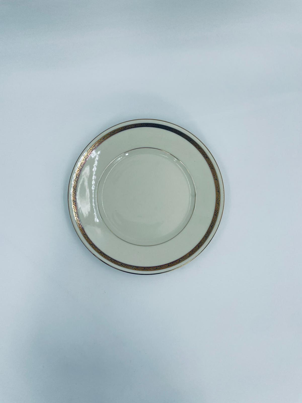 Dessert plate by the Walkure Bayreuth Bavaria label, made of high-quality porcelain in ecru. The plate is characterised by an elegant design with a gold band with a pattern around the plate and is finished with gilding on the rim.