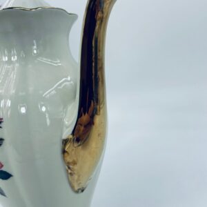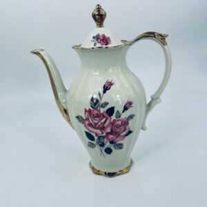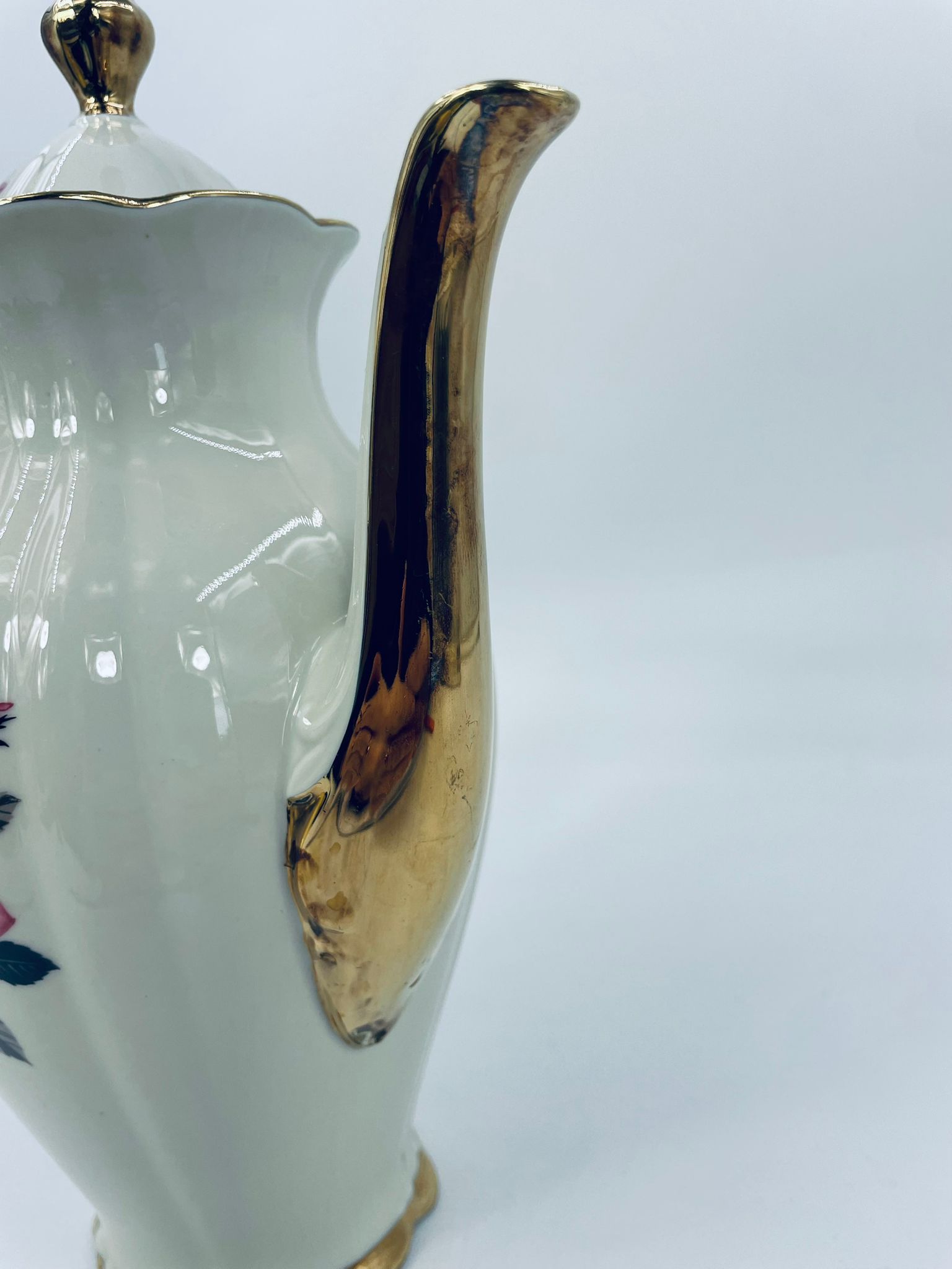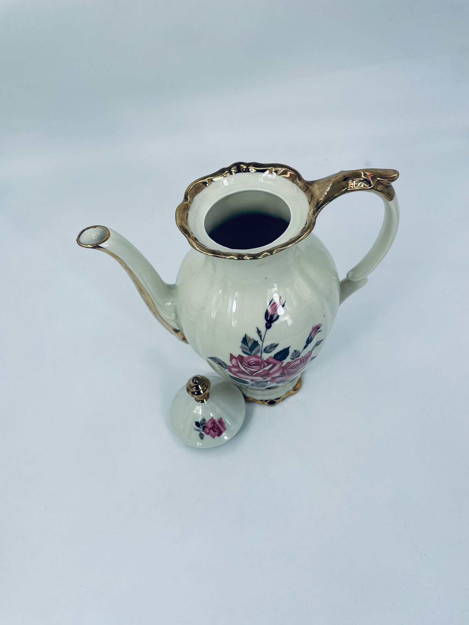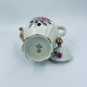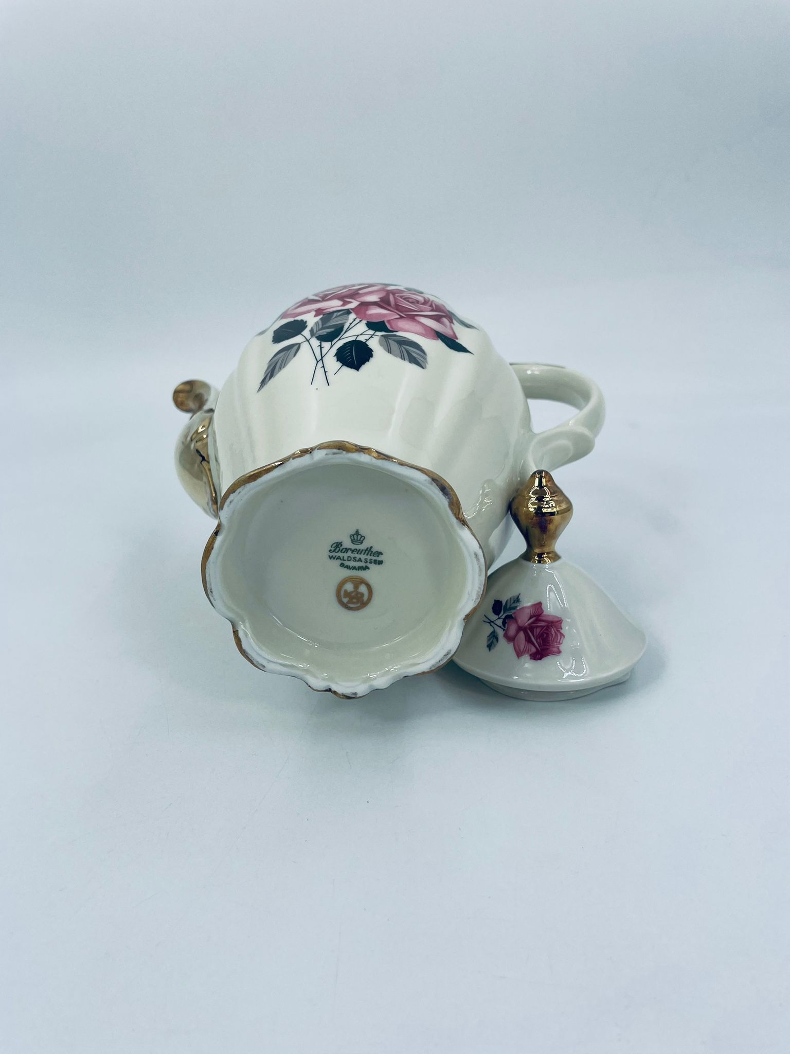 Dzbanek do herbaty wytwórni Bareuther Waldsassen Bavaria. Wysokiej jakości porcelana w kolorze ecru z delikatnym kwiatowym wzorem różowych róż na gałązkach w kolorze czerni i szarości. Dzbanuszek wykończony złoceniami na rantach. Delikatne przetarcia na złoceniach.
