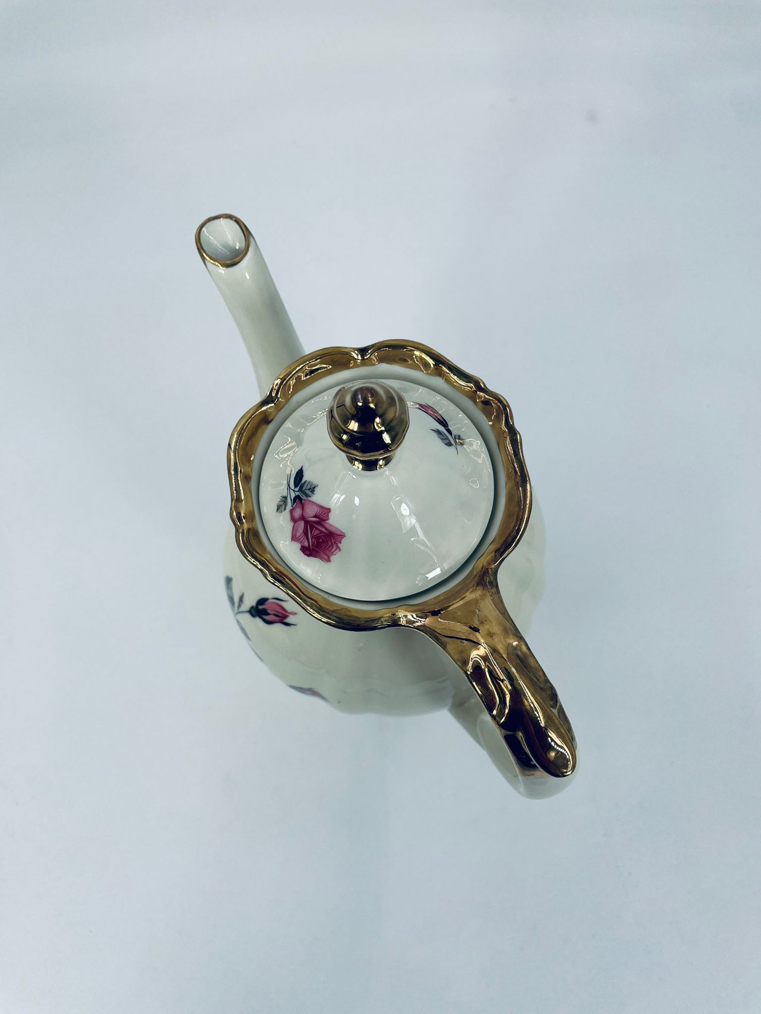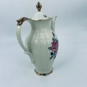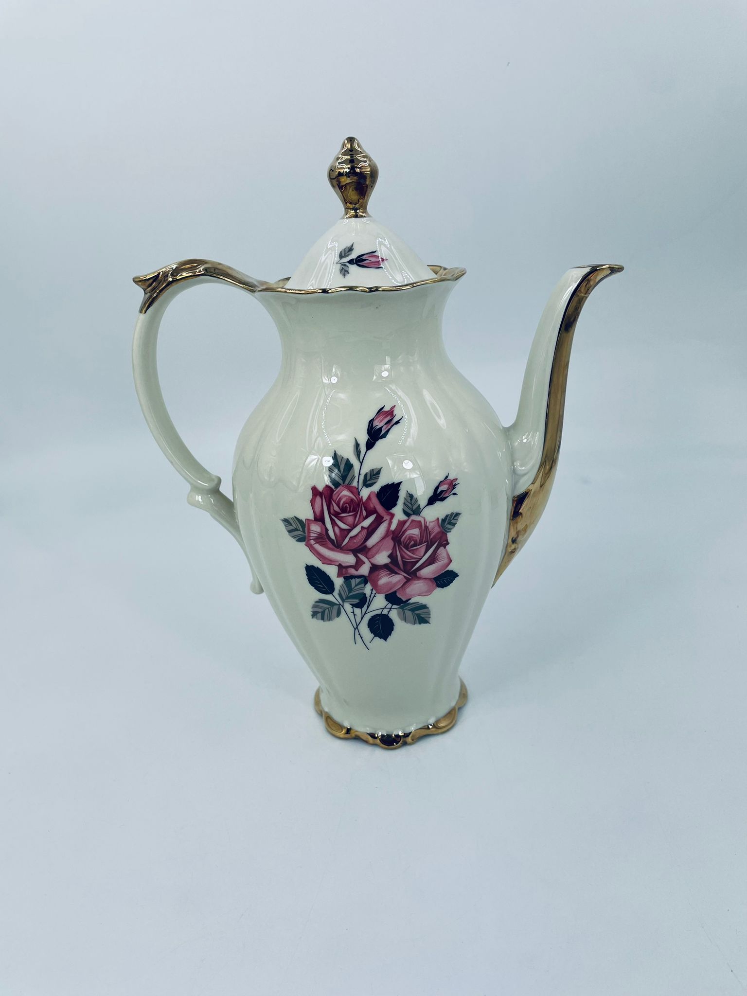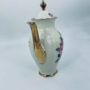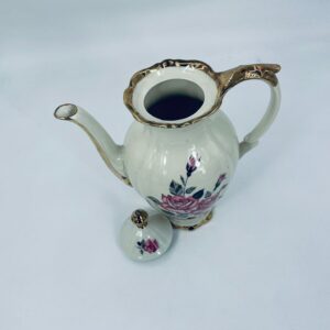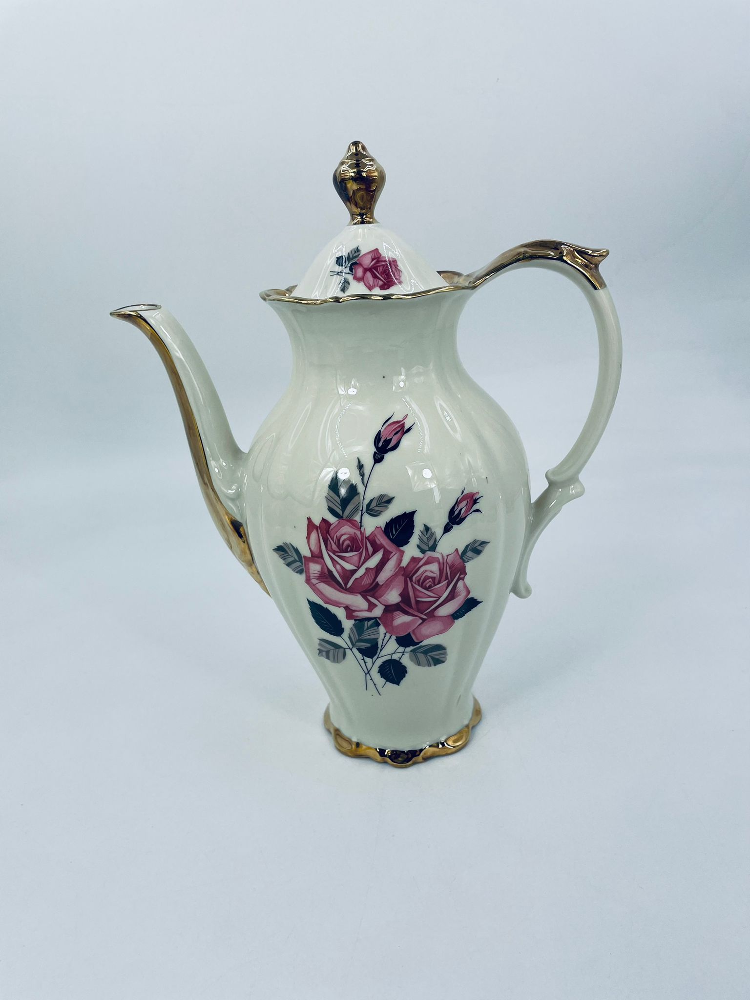 Dzbanek do herbaty wytwórni Bareuther Waldsassen Bavaria. Wysokiej jakości porcelana w kolorze ecru z delikatnym kwiatowym wzorem różowych róż na gałązkach w kolorze czerni i szarości. Dzbanuszek wykończony złoceniami na rantach. Delikatne przetarcia na złoceniach.