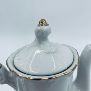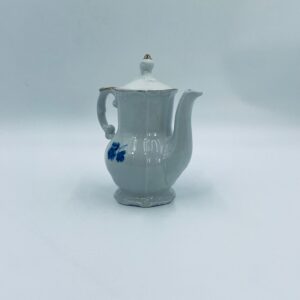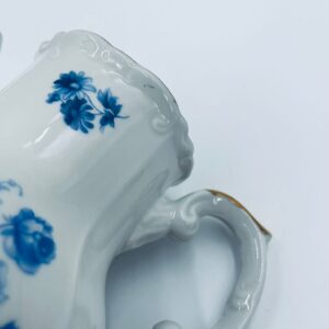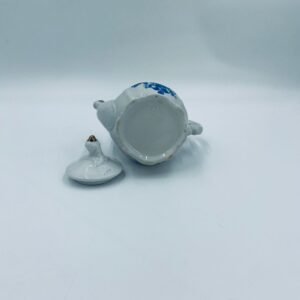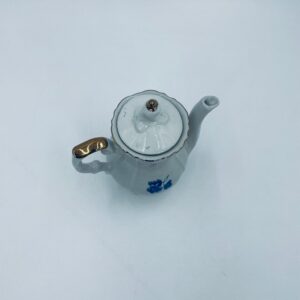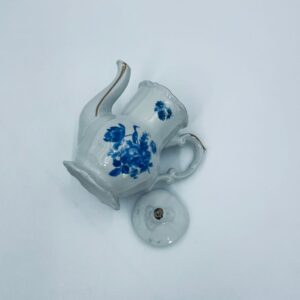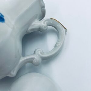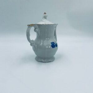 Dzbanuszek do herbaty w stylu Vintage, wykonany z wysokiej jakości Chińskiej białej porcelany. Dzbanek posiada dekoracyjny uchwyt, charakteryzuje się pięknym dekorem niebieskich kwiatów, ozdobnym reliefem oraz złoceniem na rantach.
