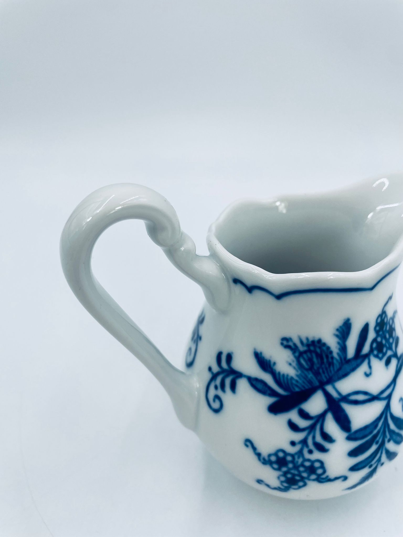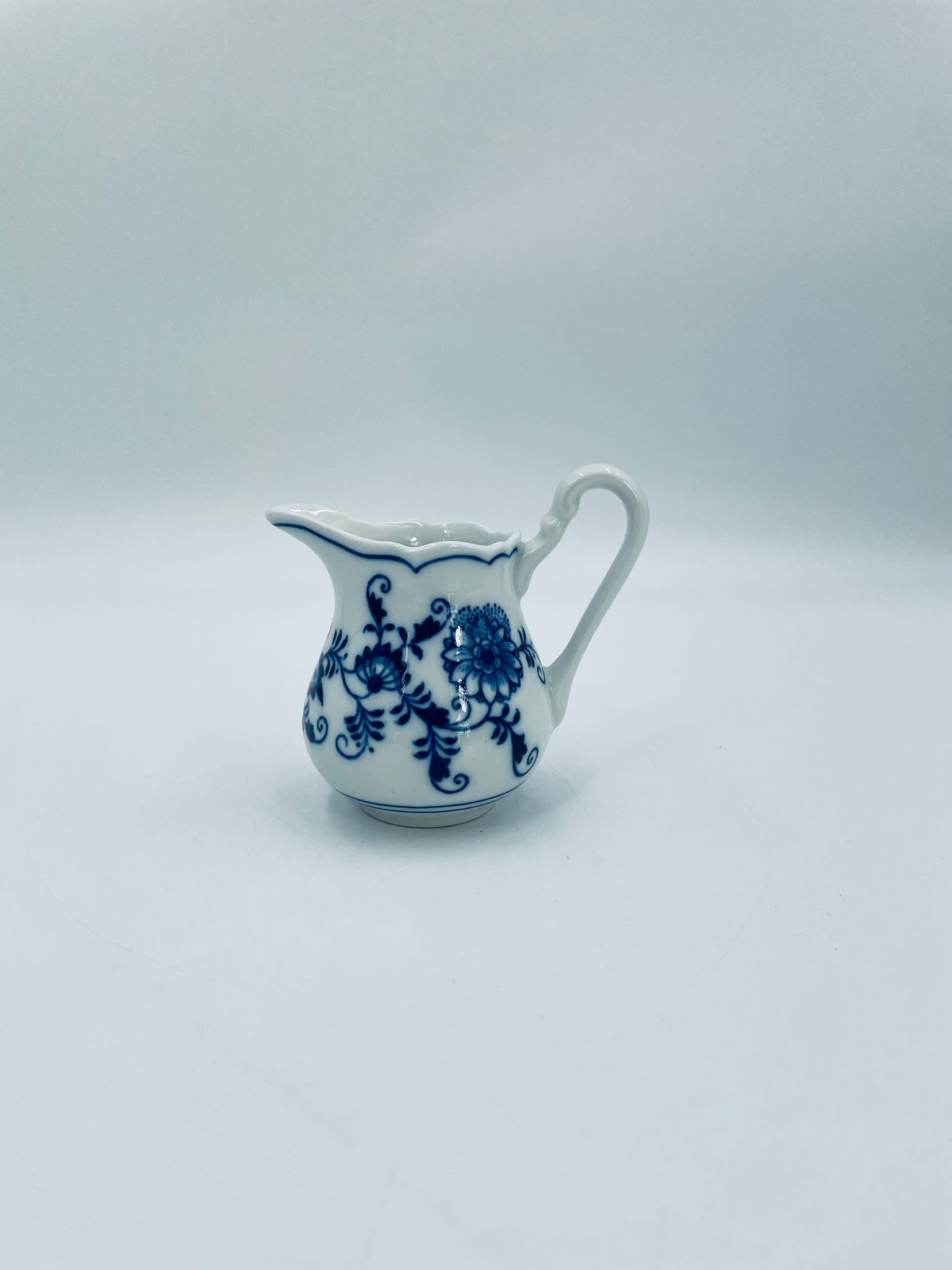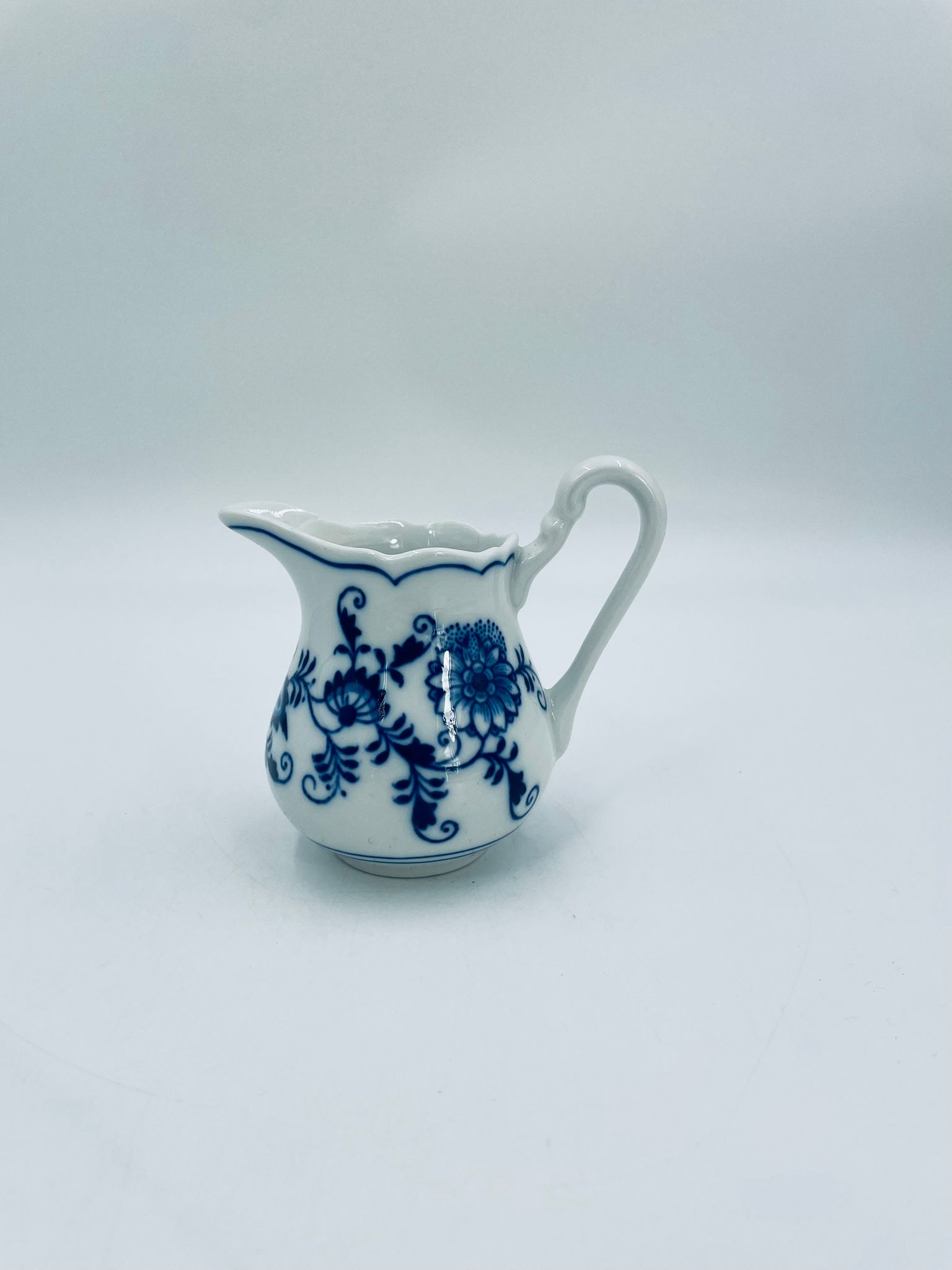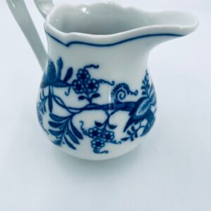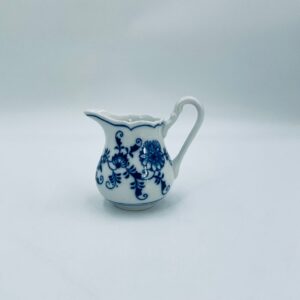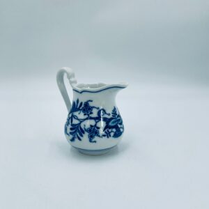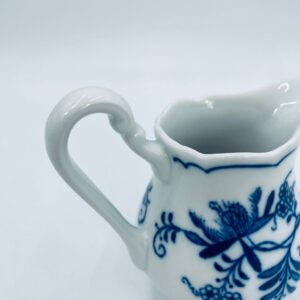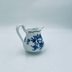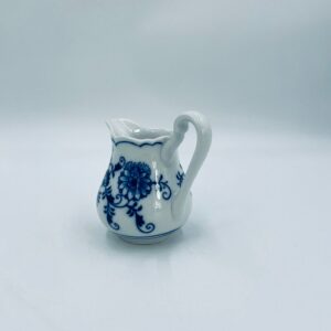 Dzbanuszek na mleko Czeskiej marki Cesky Porcelan w Dubi Bohemia, wykonany z wysokiej jakości białej porcelany. Dzbanek zdobiony tradycyjnym wzorem cebulowym z motywem roślinnym w kobaltowym kolorze, posiada dekoracyjny uchwyt.
