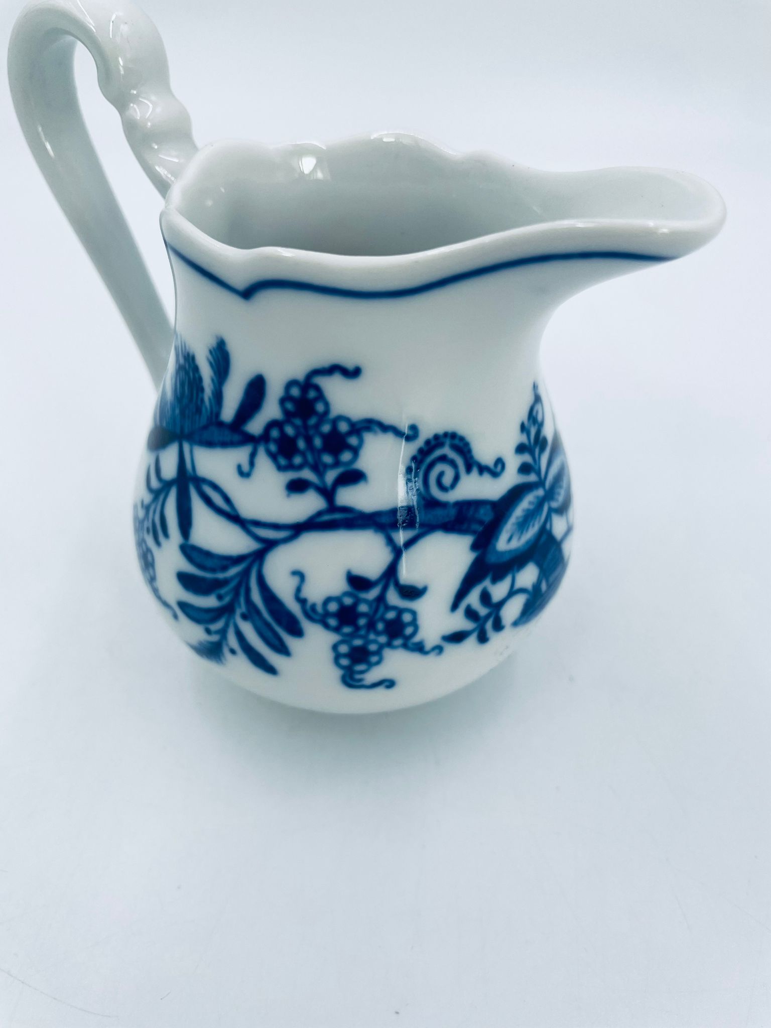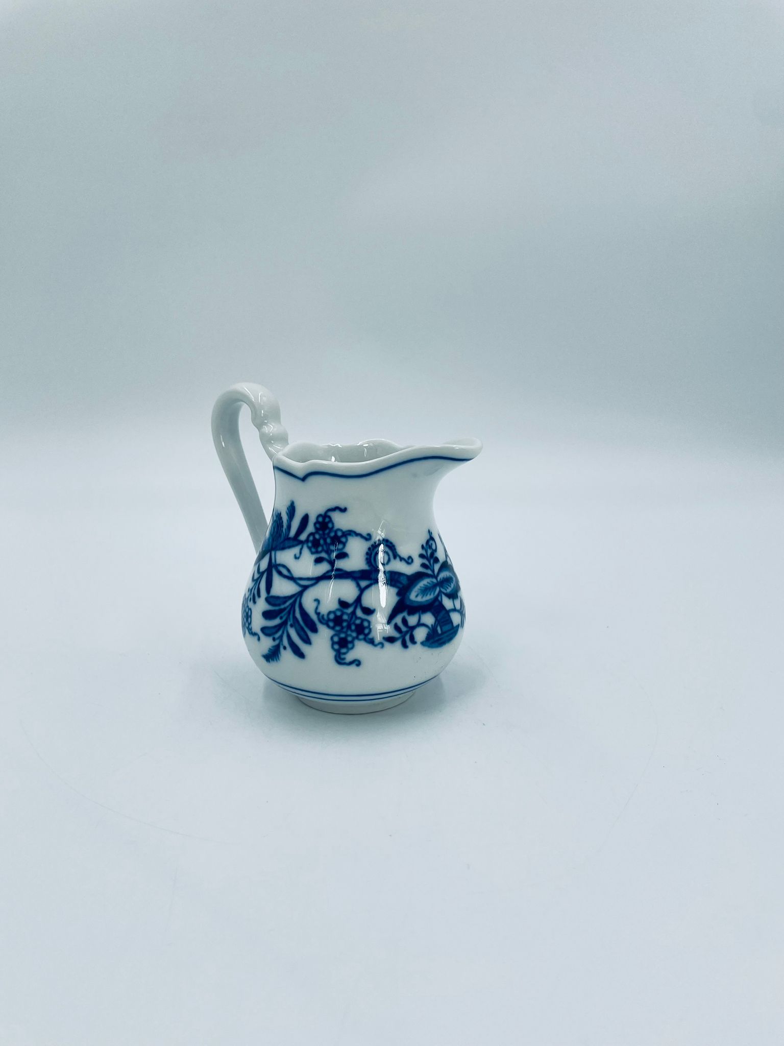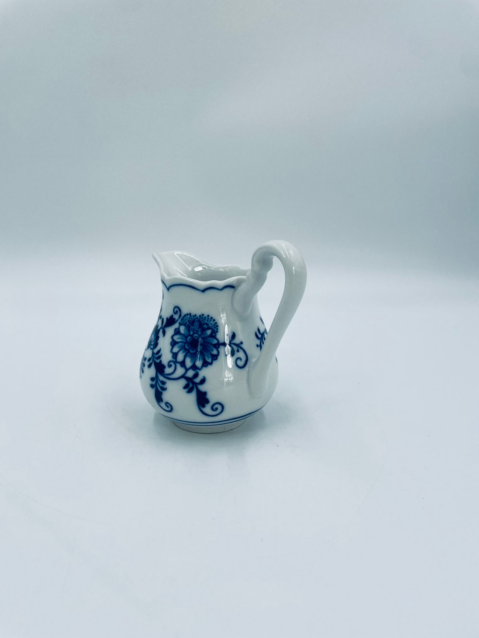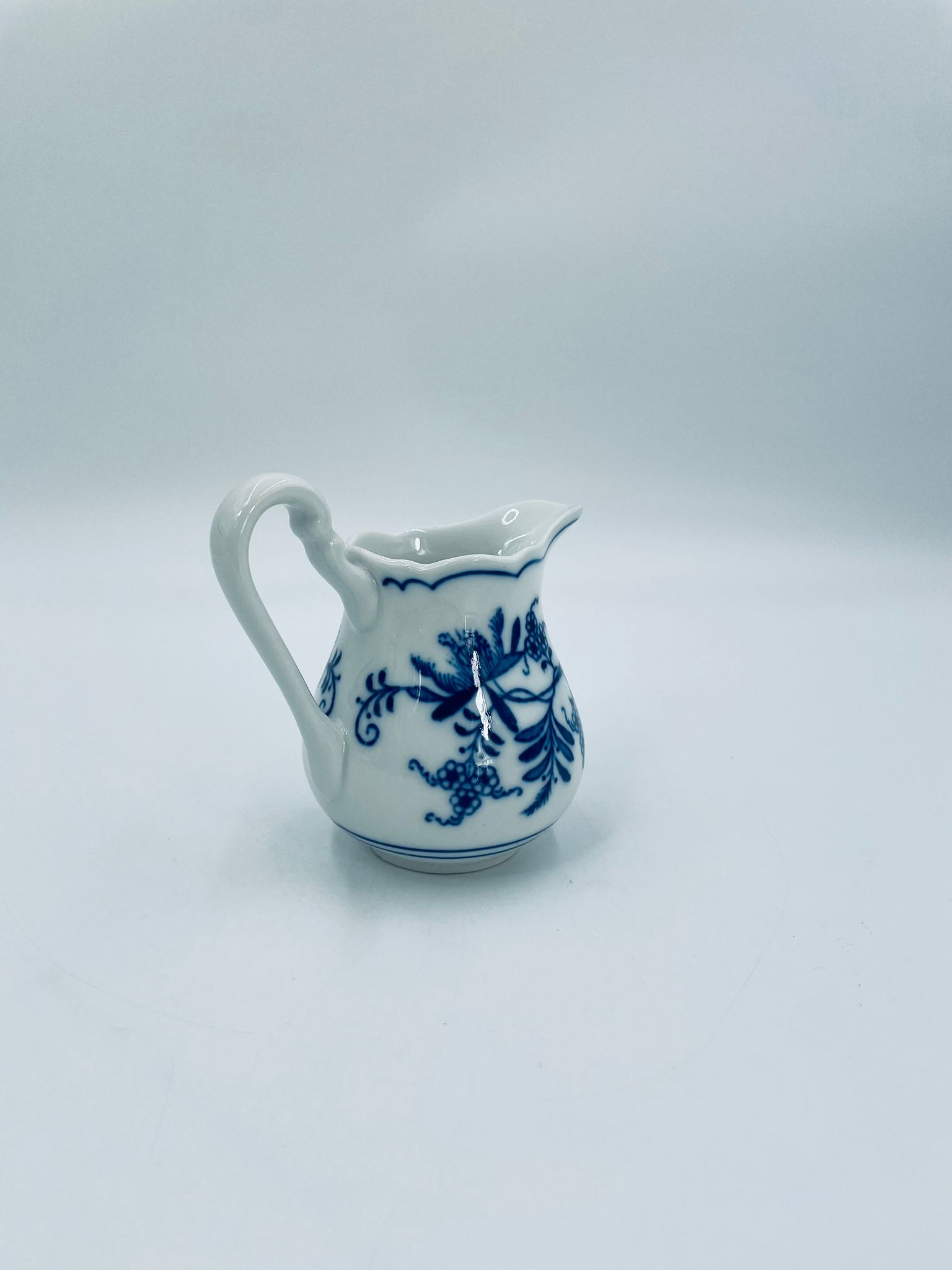 Dzbanuszek na mleko Czeskiej marki Cesky Porcelan w Dubi Bohemia, wykonany z wysokiej jakości białej porcelany. Dzbanek zdobiony tradycyjnym wzorem cebulowym z motywem roślinnym w kobaltowym kolorze, posiada dekoracyjny uchwyt.
