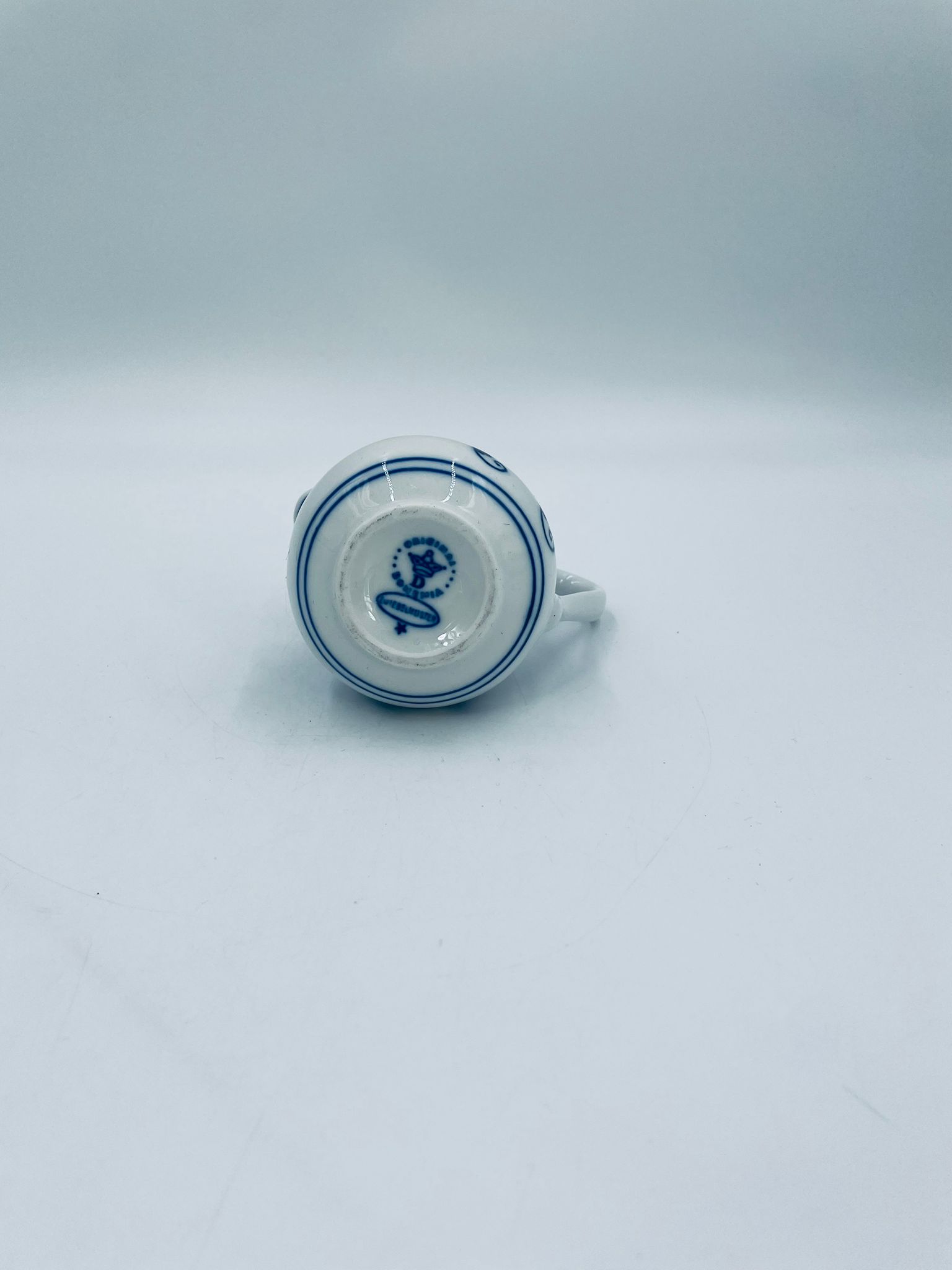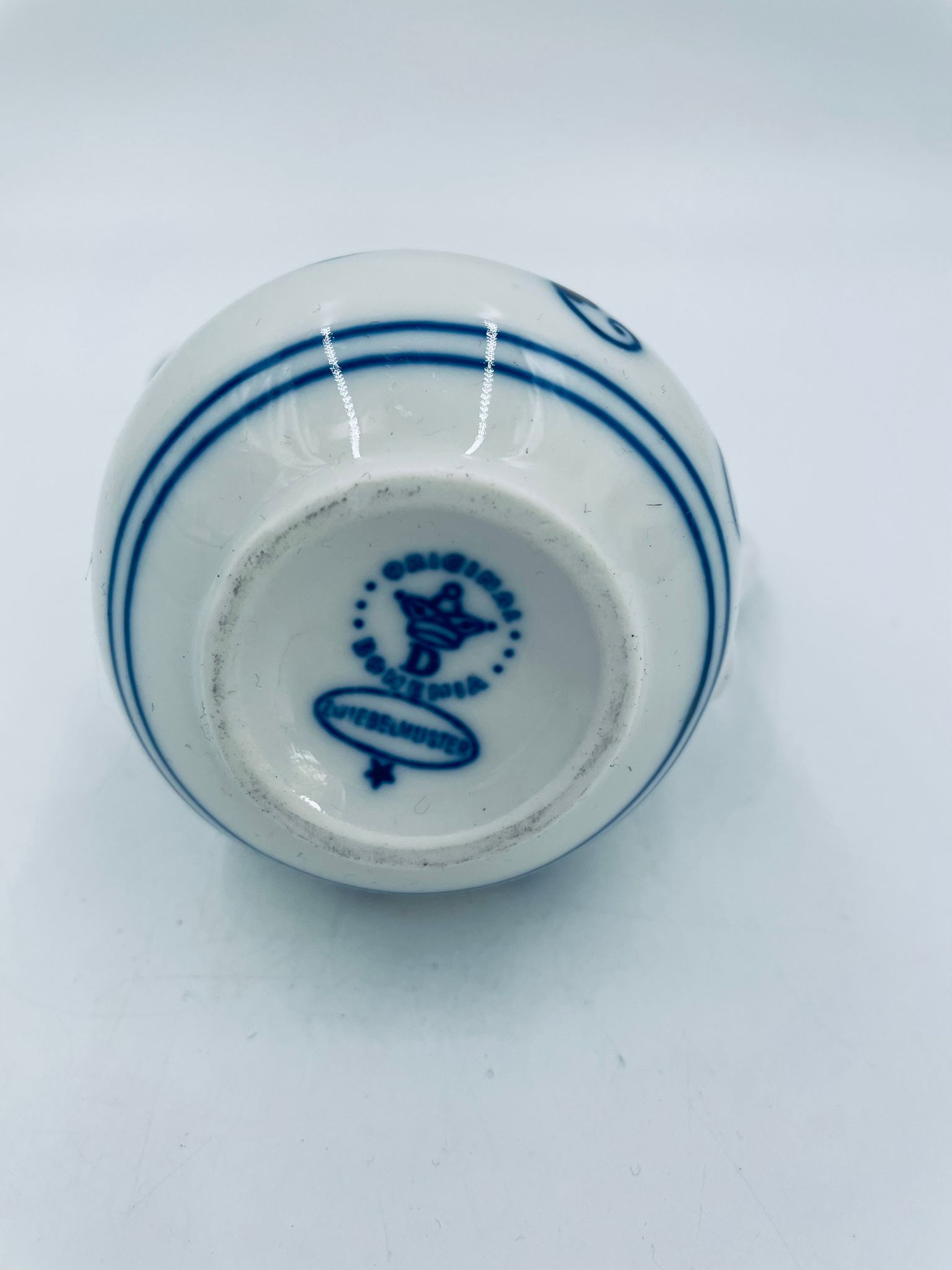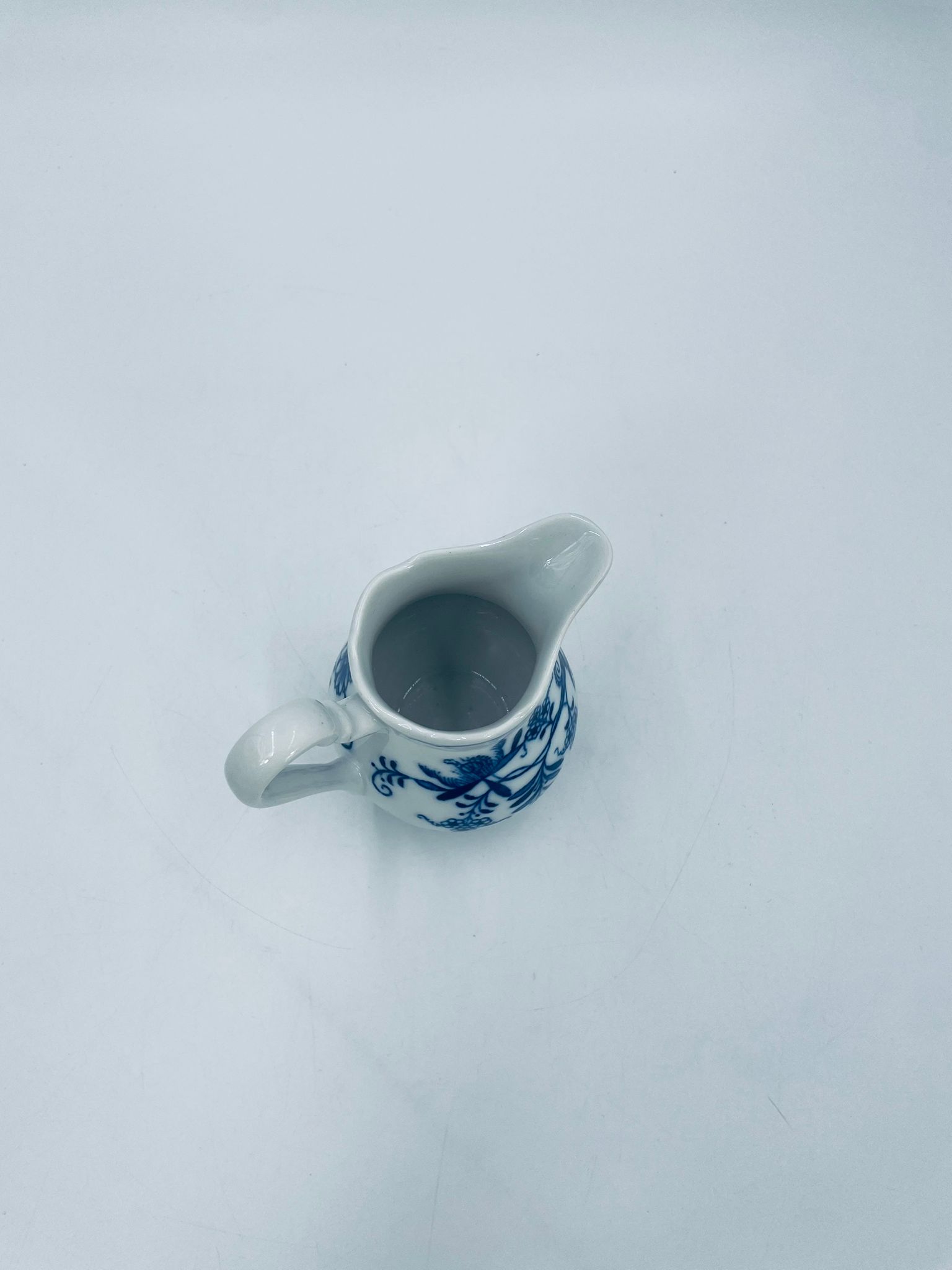 Dzbanuszek na mleko Czeskiej marki Cesky Porcelan w Dubi Bohemia, wykonany z wysokiej jakości białej porcelany. Dzbanek zdobiony tradycyjnym wzorem cebulowym z motywem roślinnym w kobaltowym kolorze, posiada dekoracyjny uchwyt.