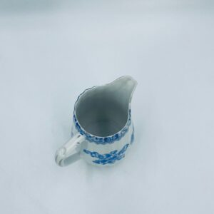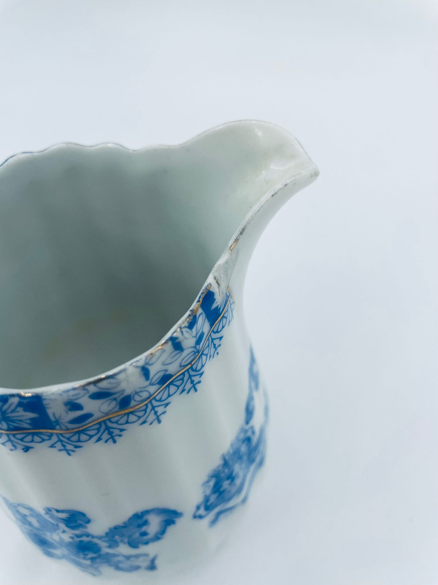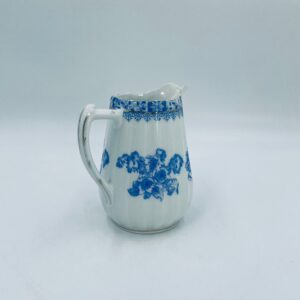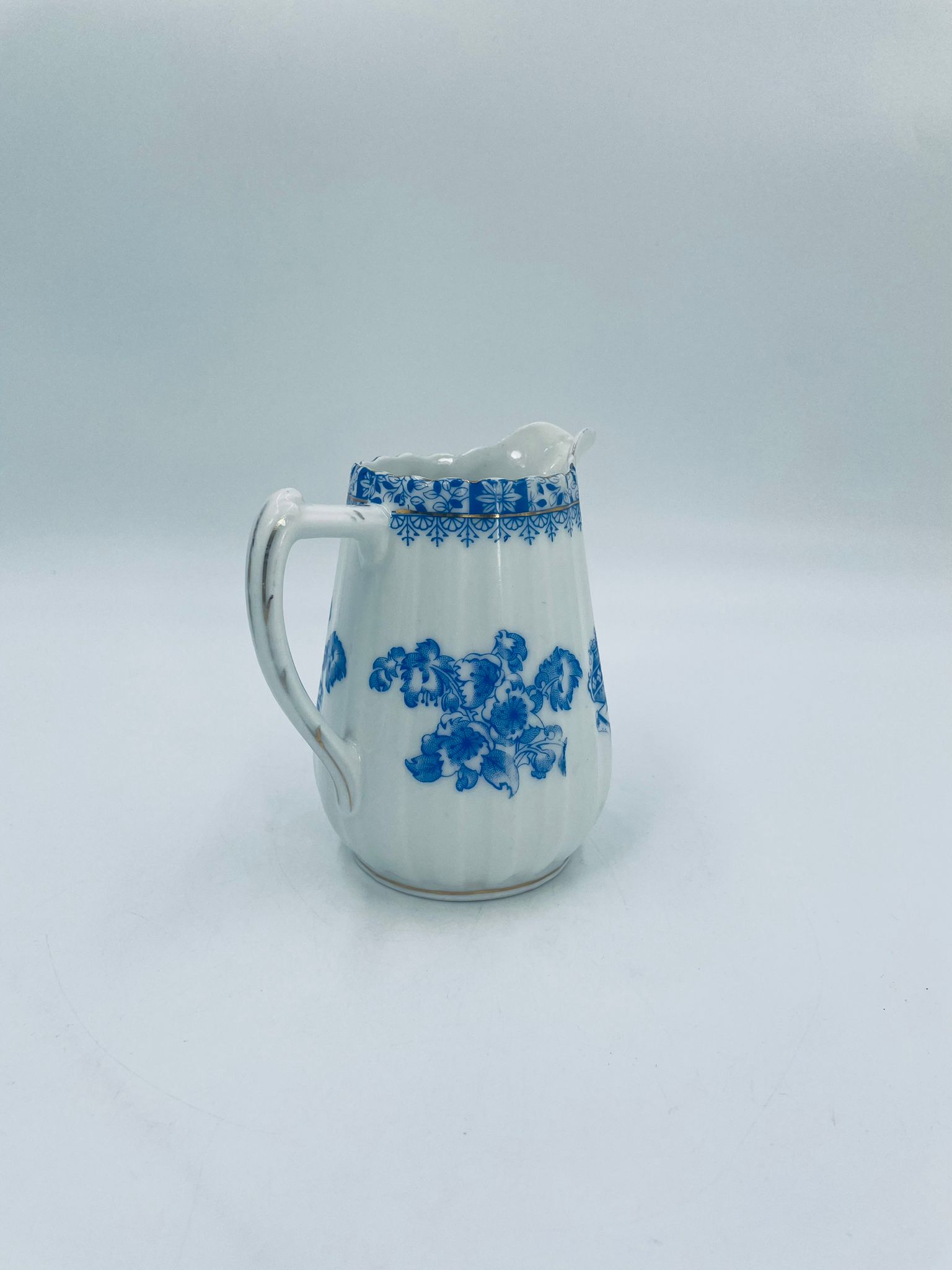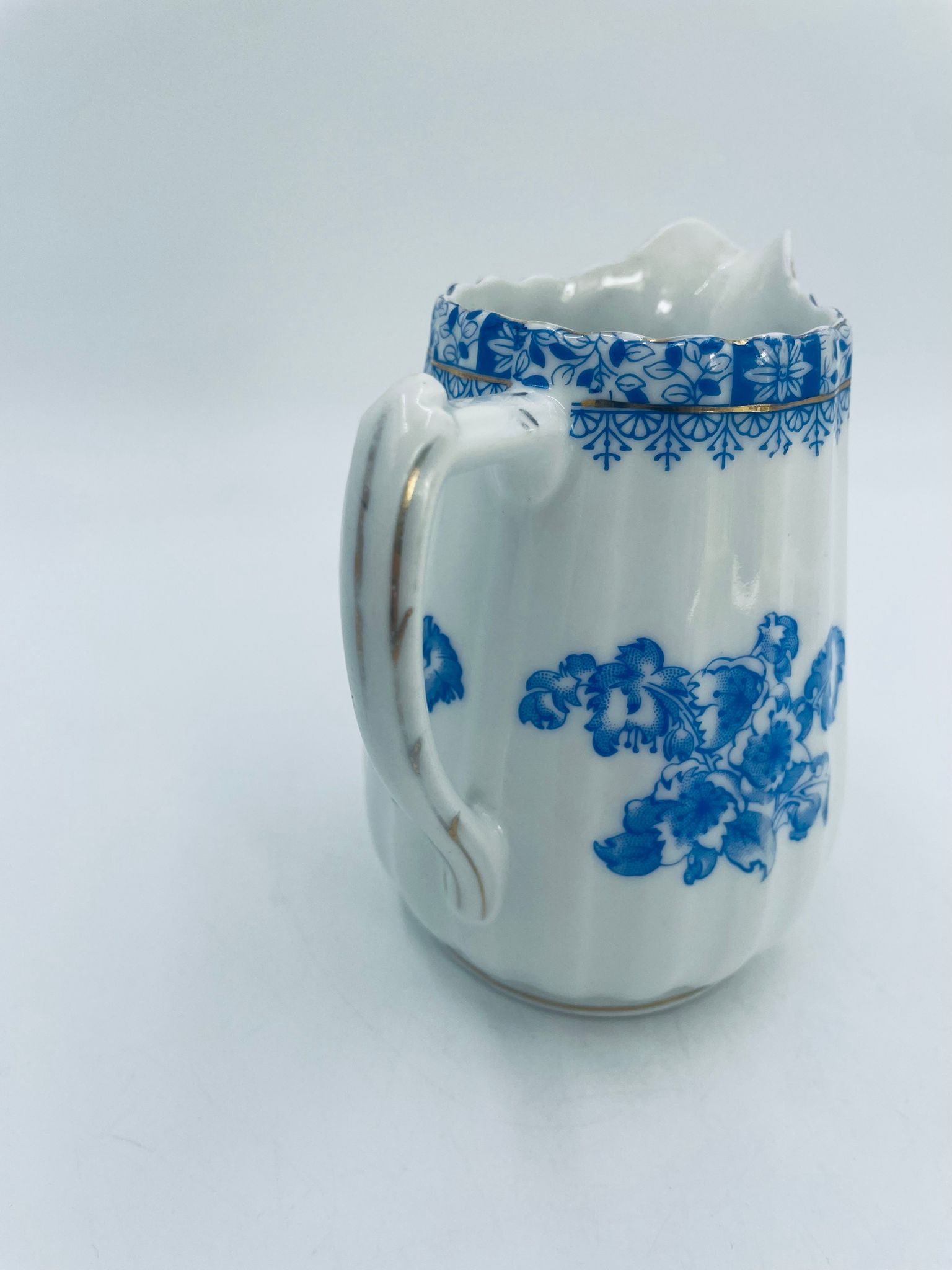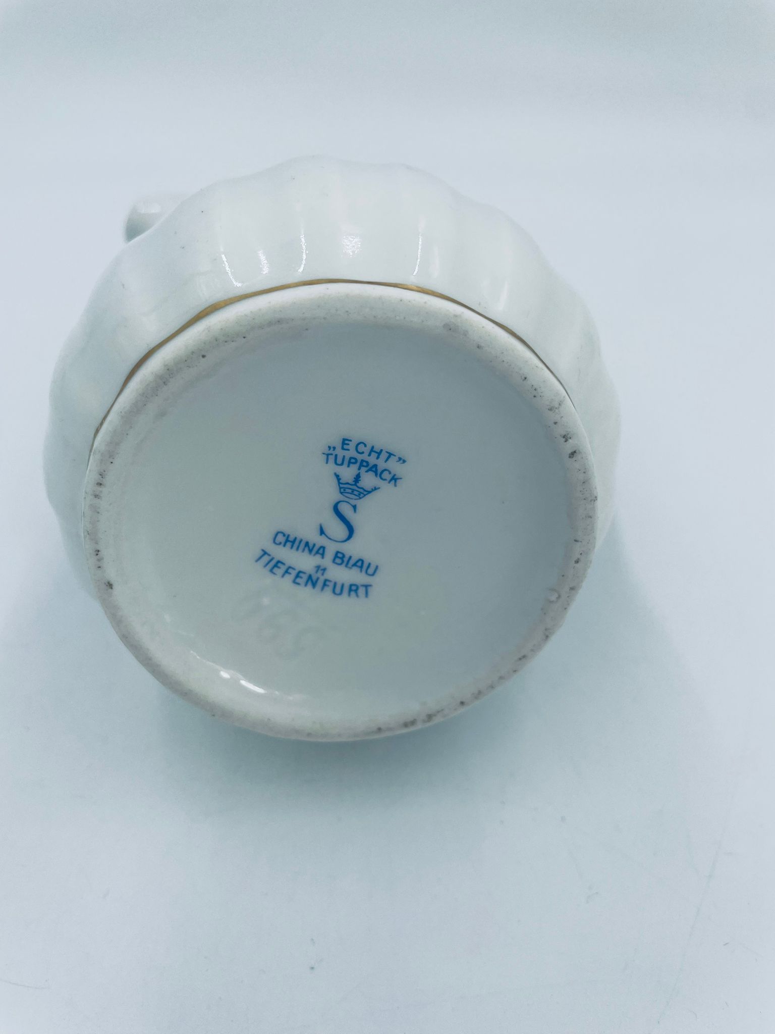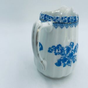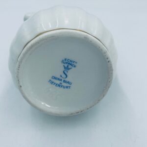 Dzbanuszek na mleko wytwórni Carl Hans Tuppack GmbH z Tiefenfurt w latach 1925-1945, wykonany z wysokiej jakości białej porcelany. Mlecznik z ozdobym uchwytem, charakteryzuje się motywem „China Blau” w kobaltowym kolorze, inspirowanym stylem orientalnym oraz karbowanym brzegiem wykończonym złoceniem. Posiada przetarcie na złoceniu oraz mały uszczerbek.