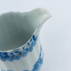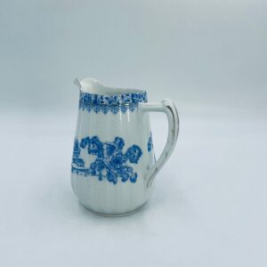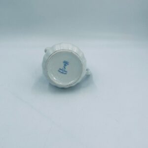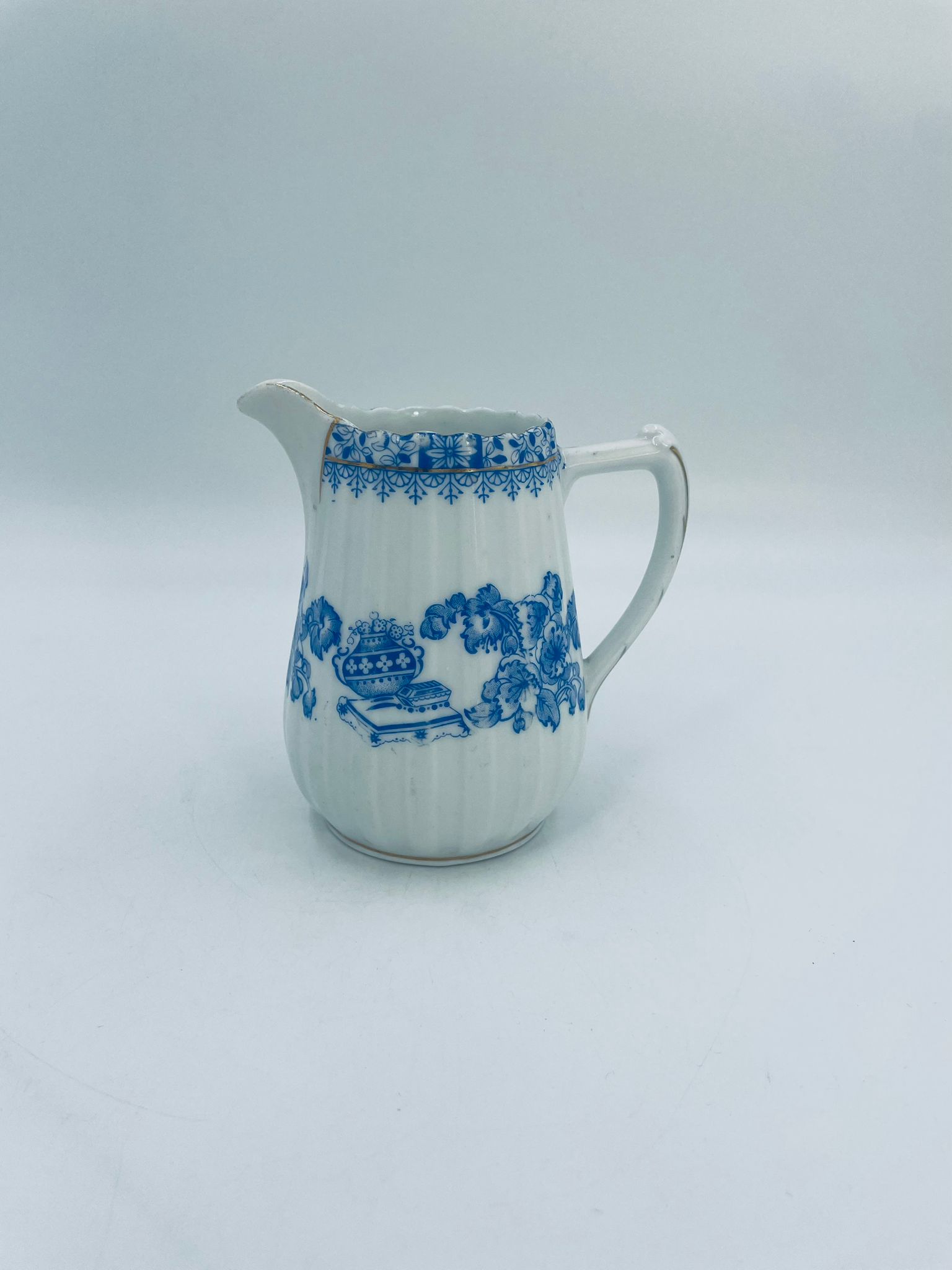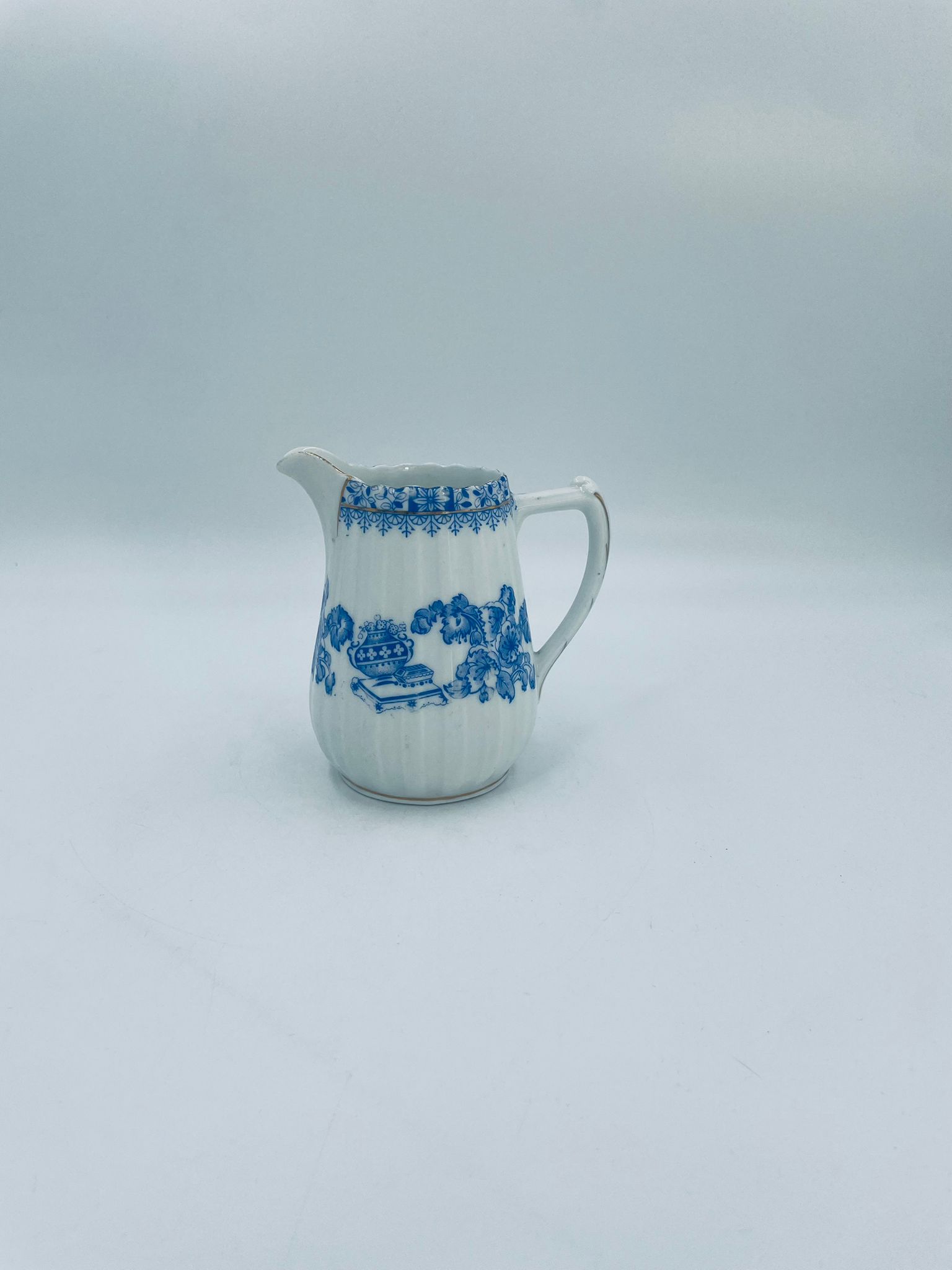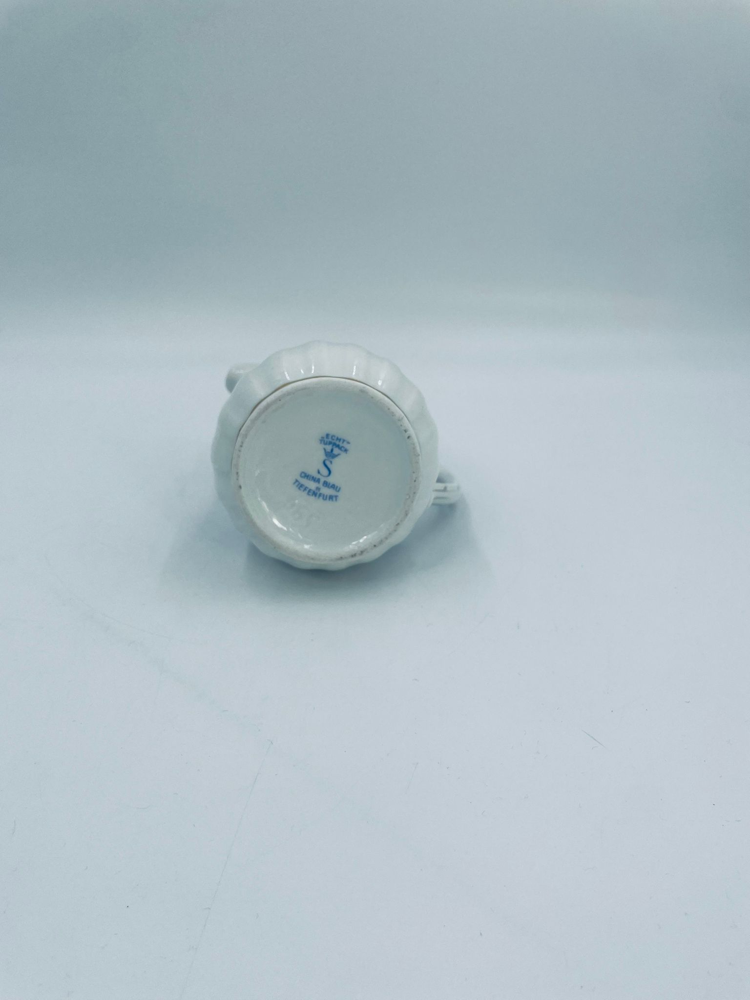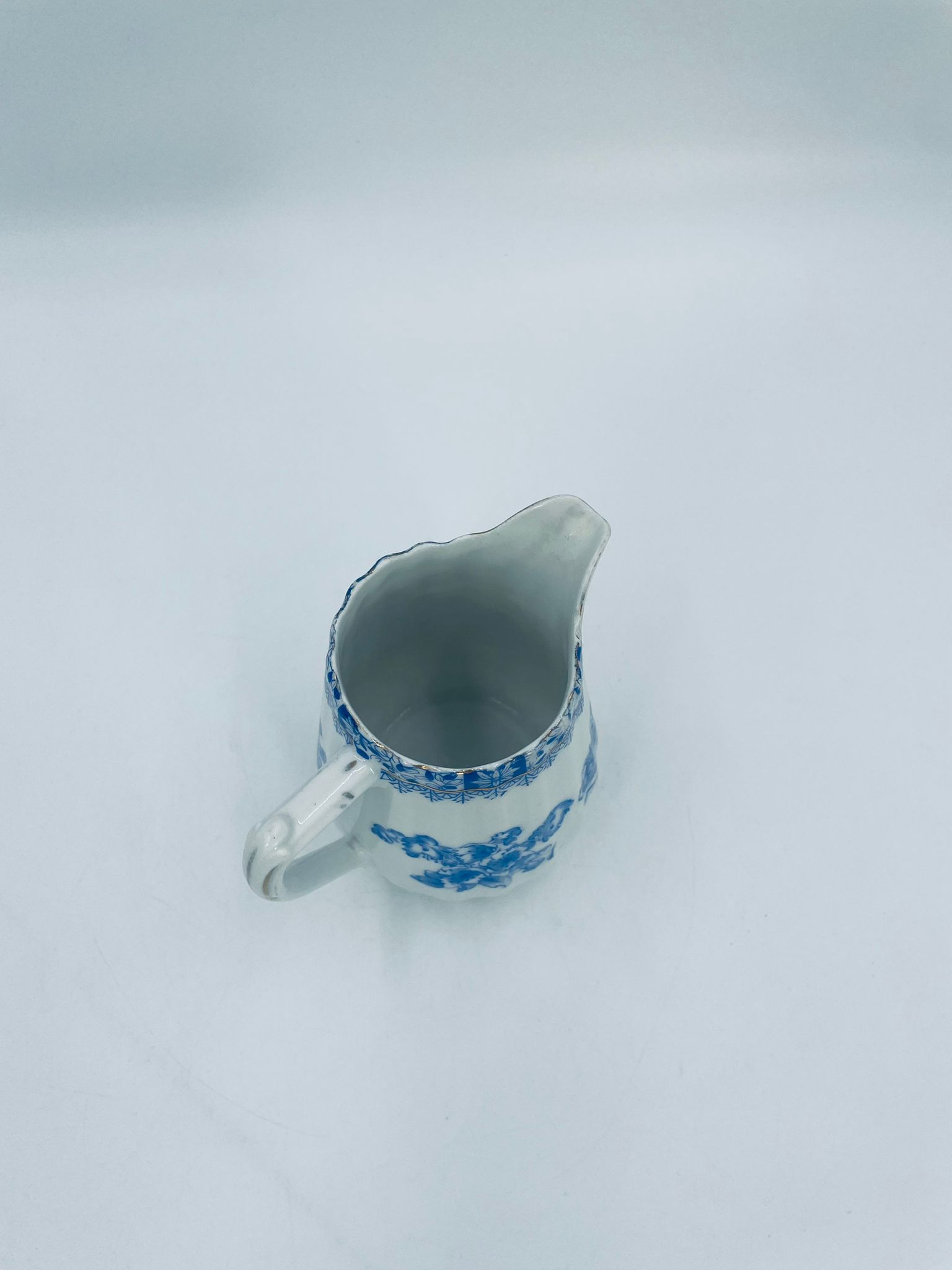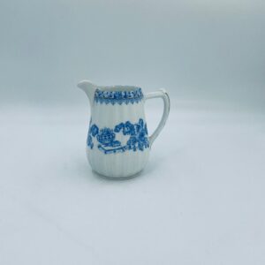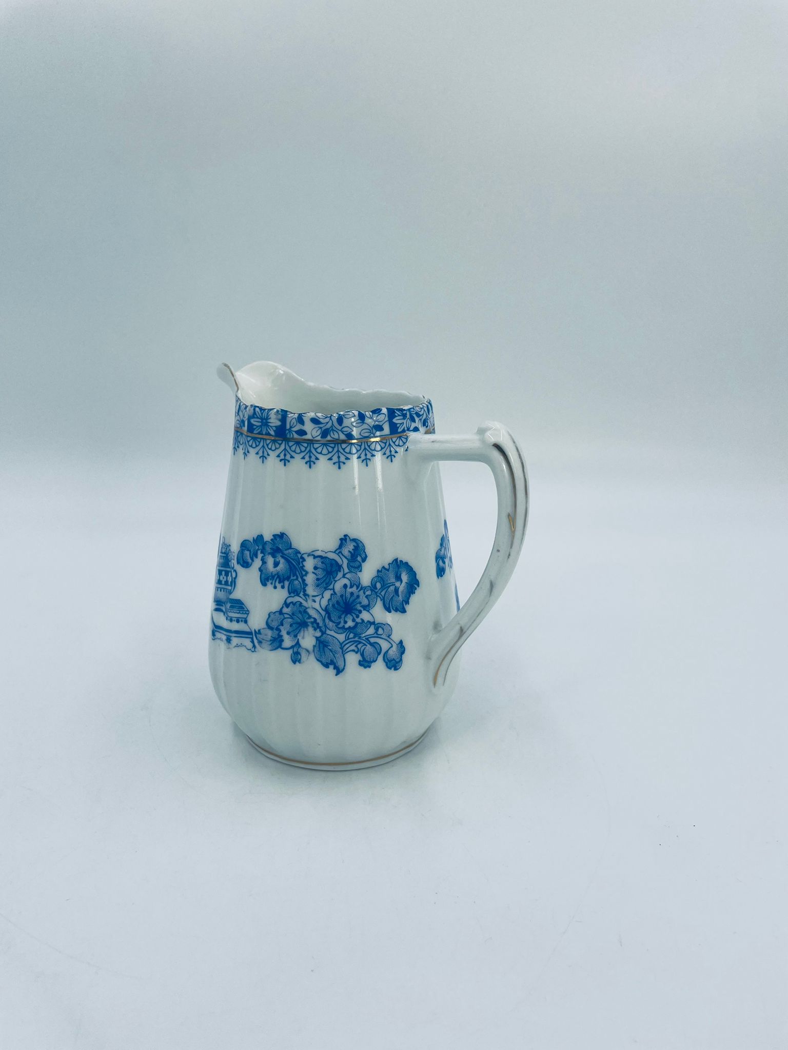 Dzbanuszek na mleko wytwórni Carl Hans Tuppack GmbH z Tiefenfurt w latach 1925-1945, wykonany z wysokiej jakości białej porcelany. Mlecznik z ozdobym uchwytem, charakteryzuje się motywem „China Blau” w kobaltowym kolorze, inspirowanym stylem orientalnym oraz karbowanym brzegiem wykończonym złoceniem. Posiada przetarcie na złoceniu oraz mały uszczerbek.