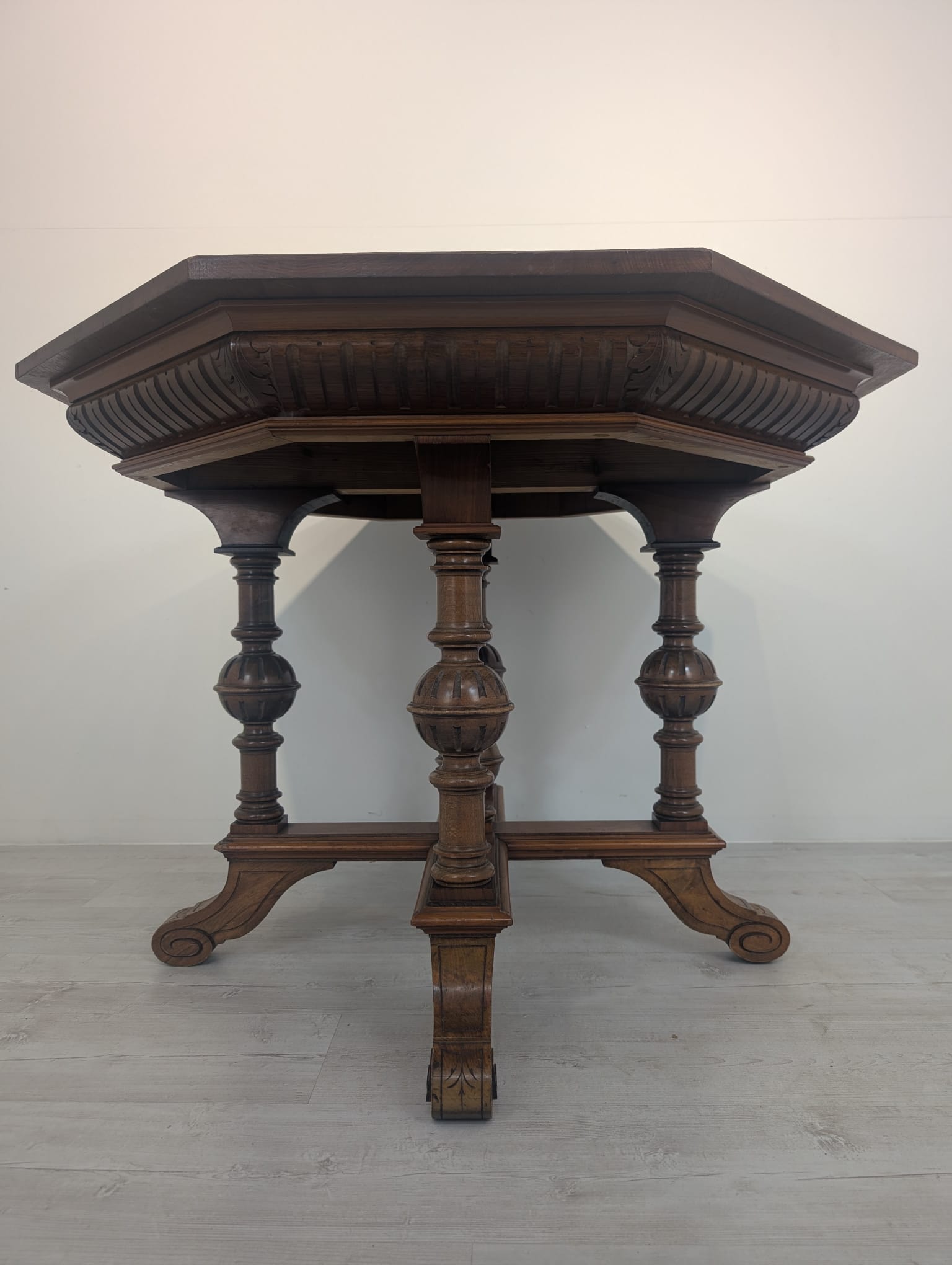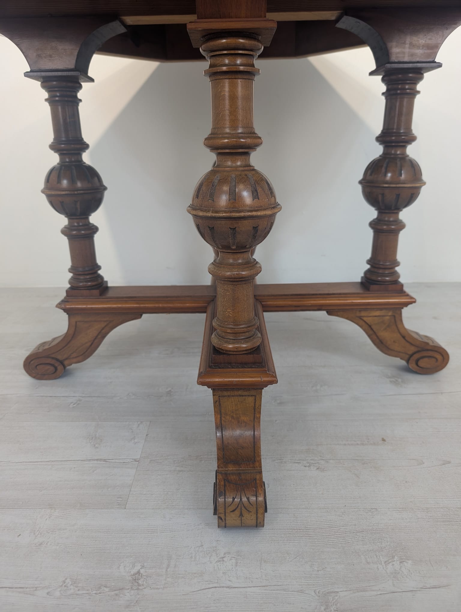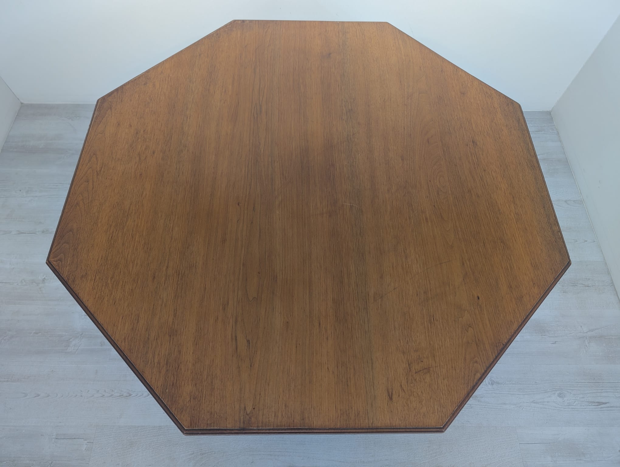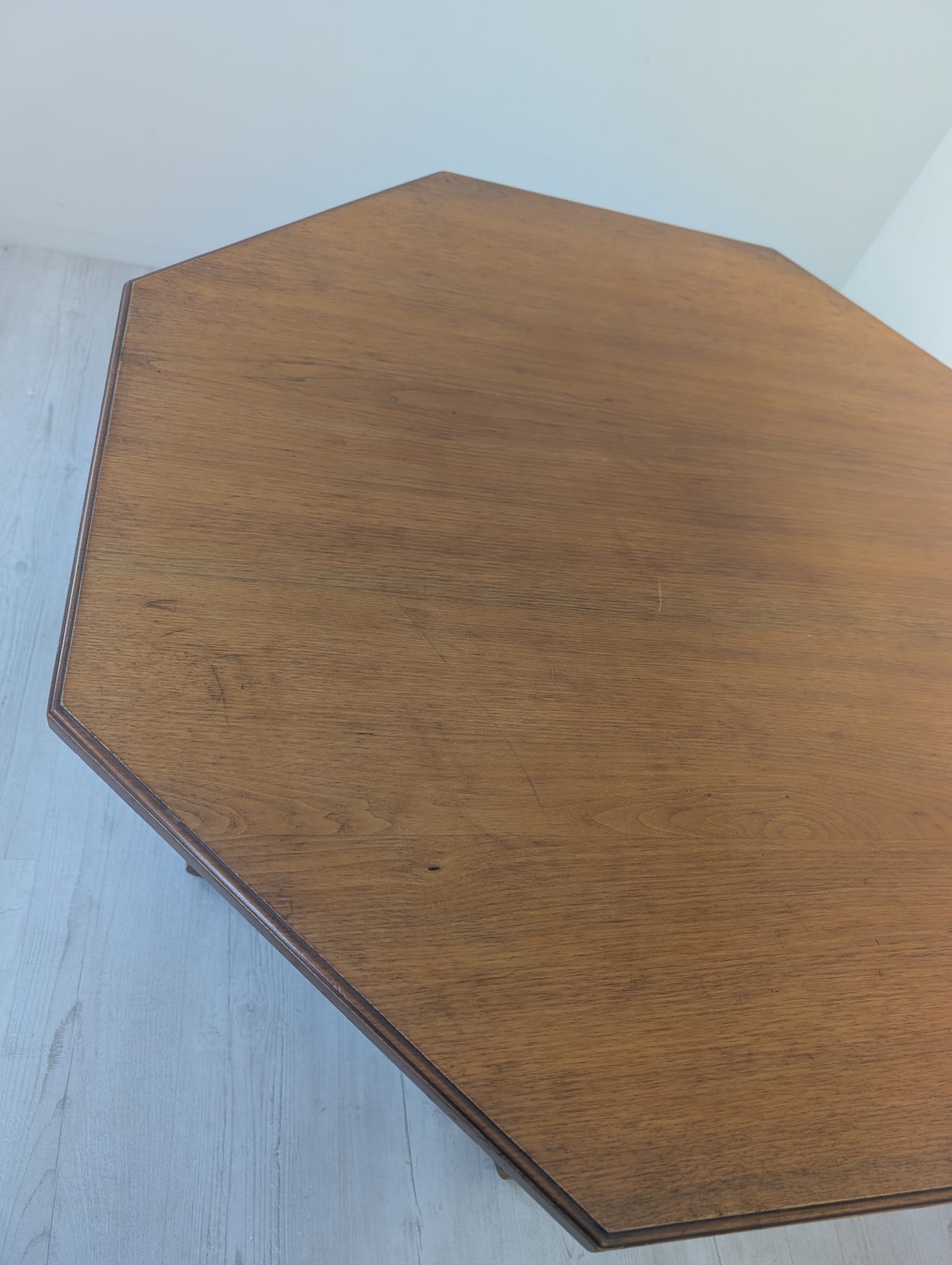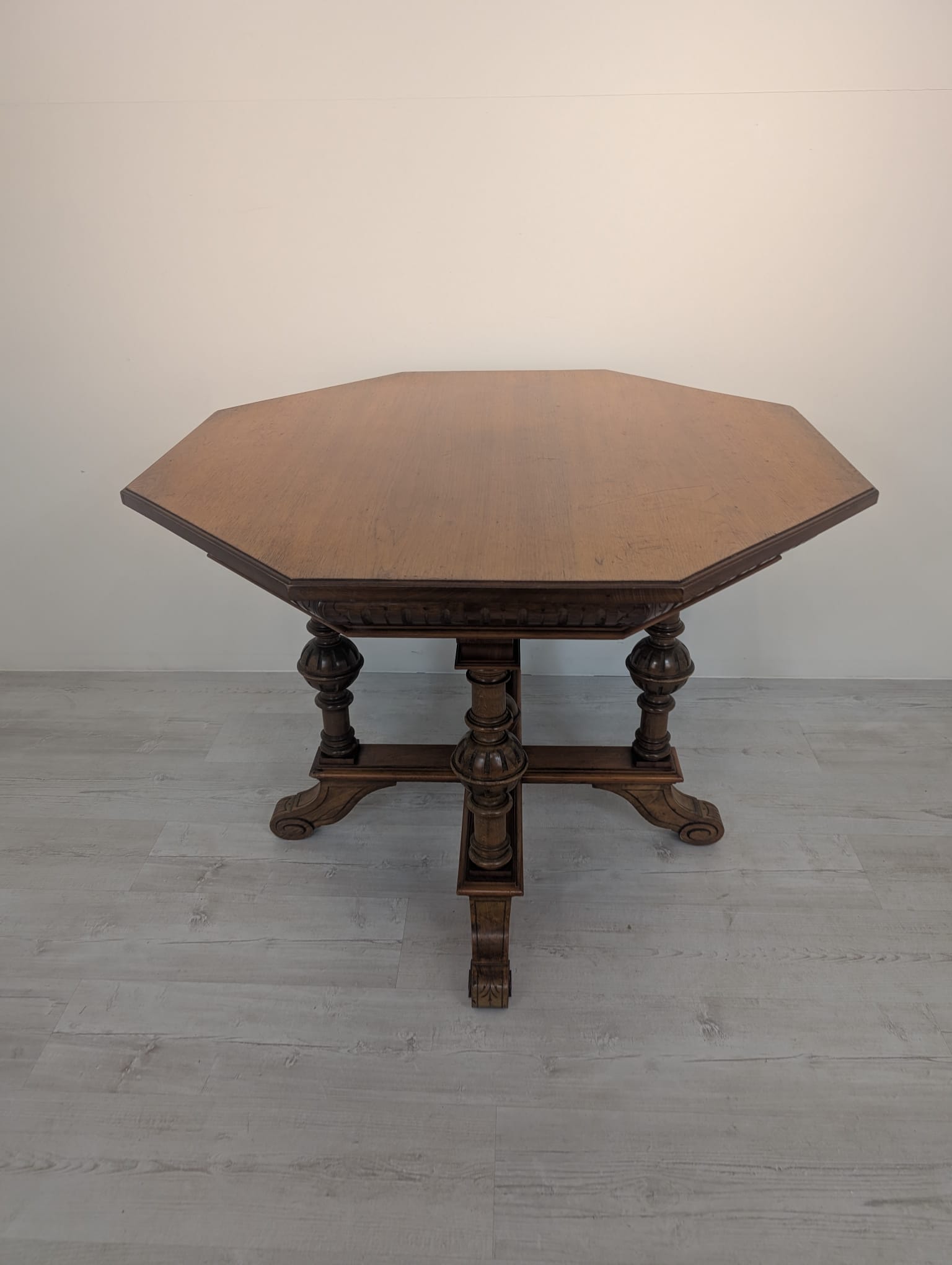 A stylish octagonal walnut wood table from the 19th century. It has a beautiful natural wood texture that gives it a unique character. This piece of furniture will be a perfect addition to a vintage or rustic interior design.