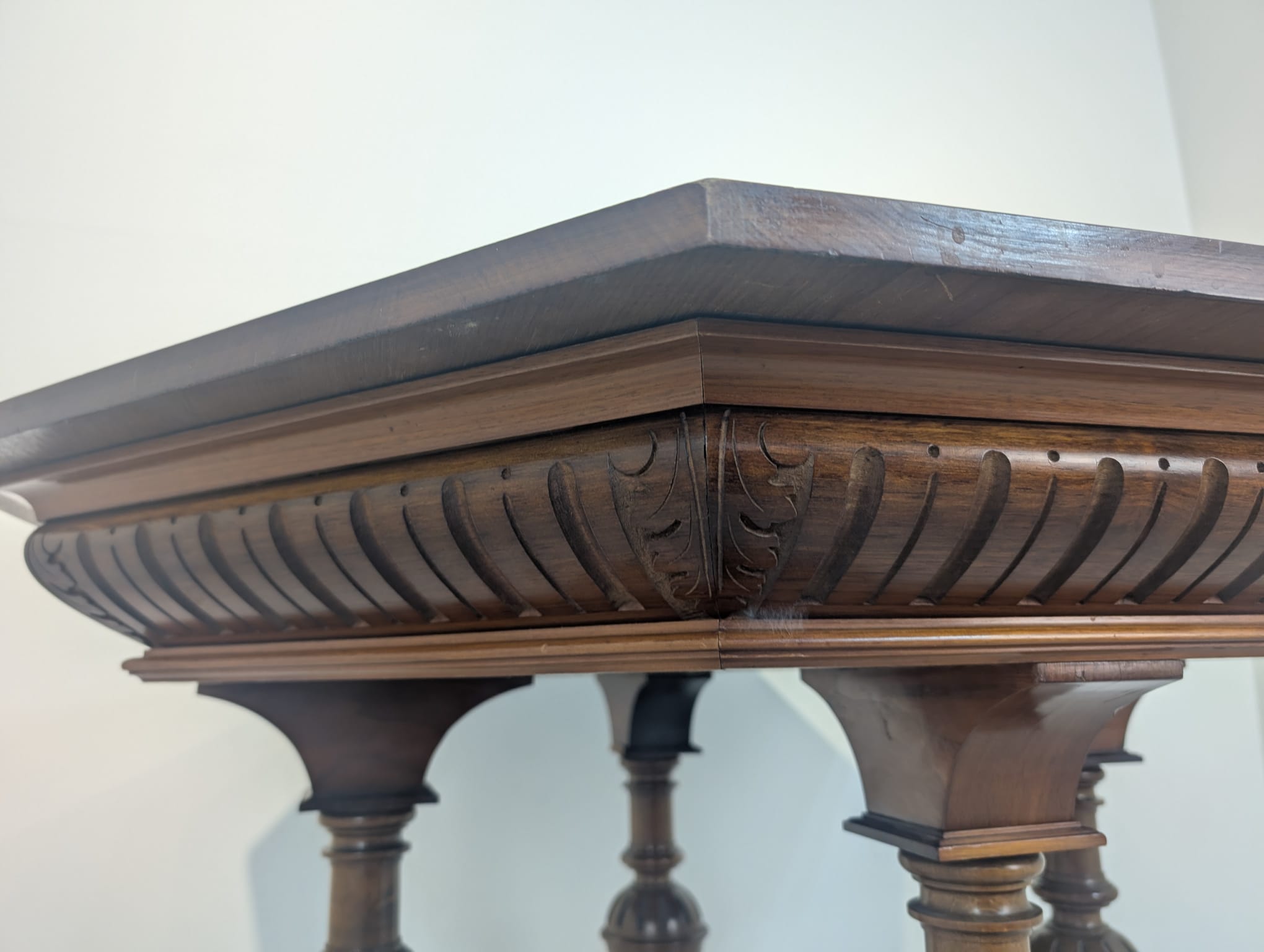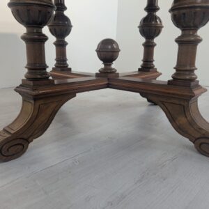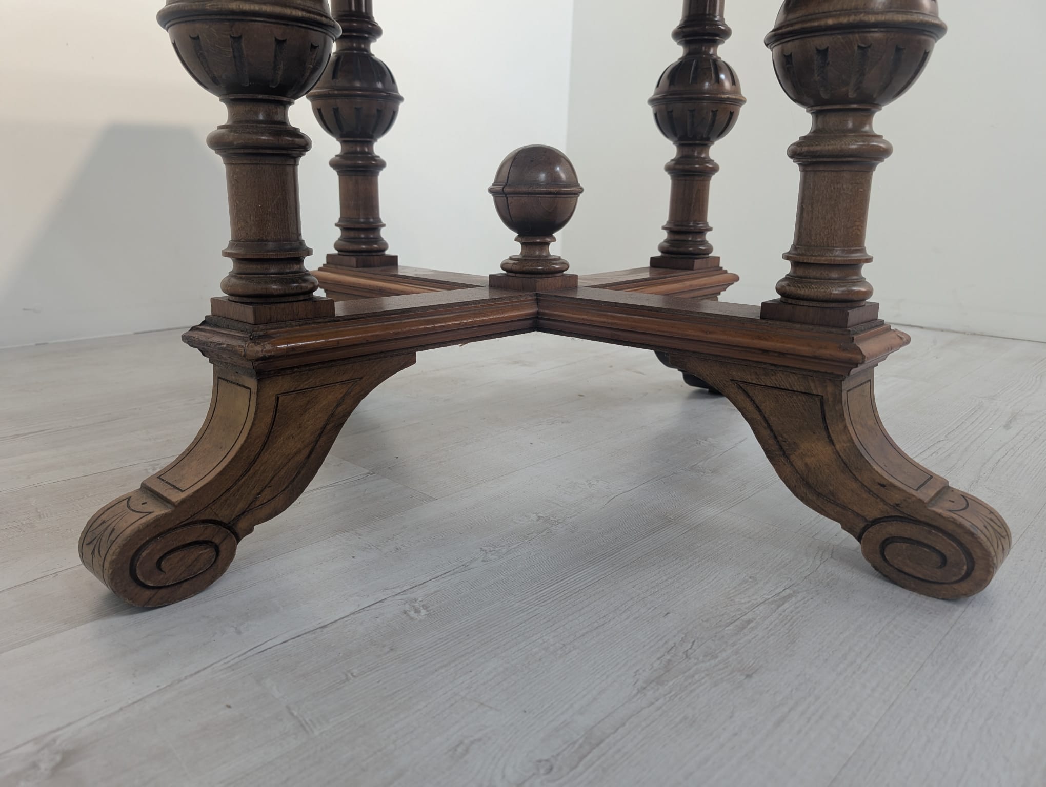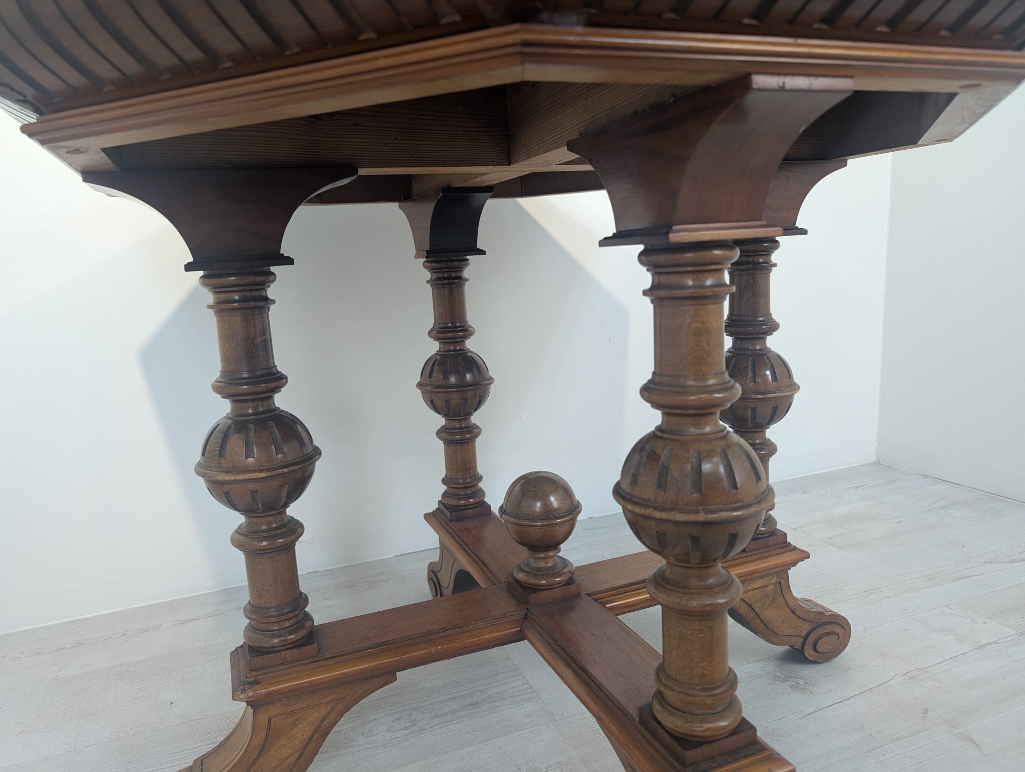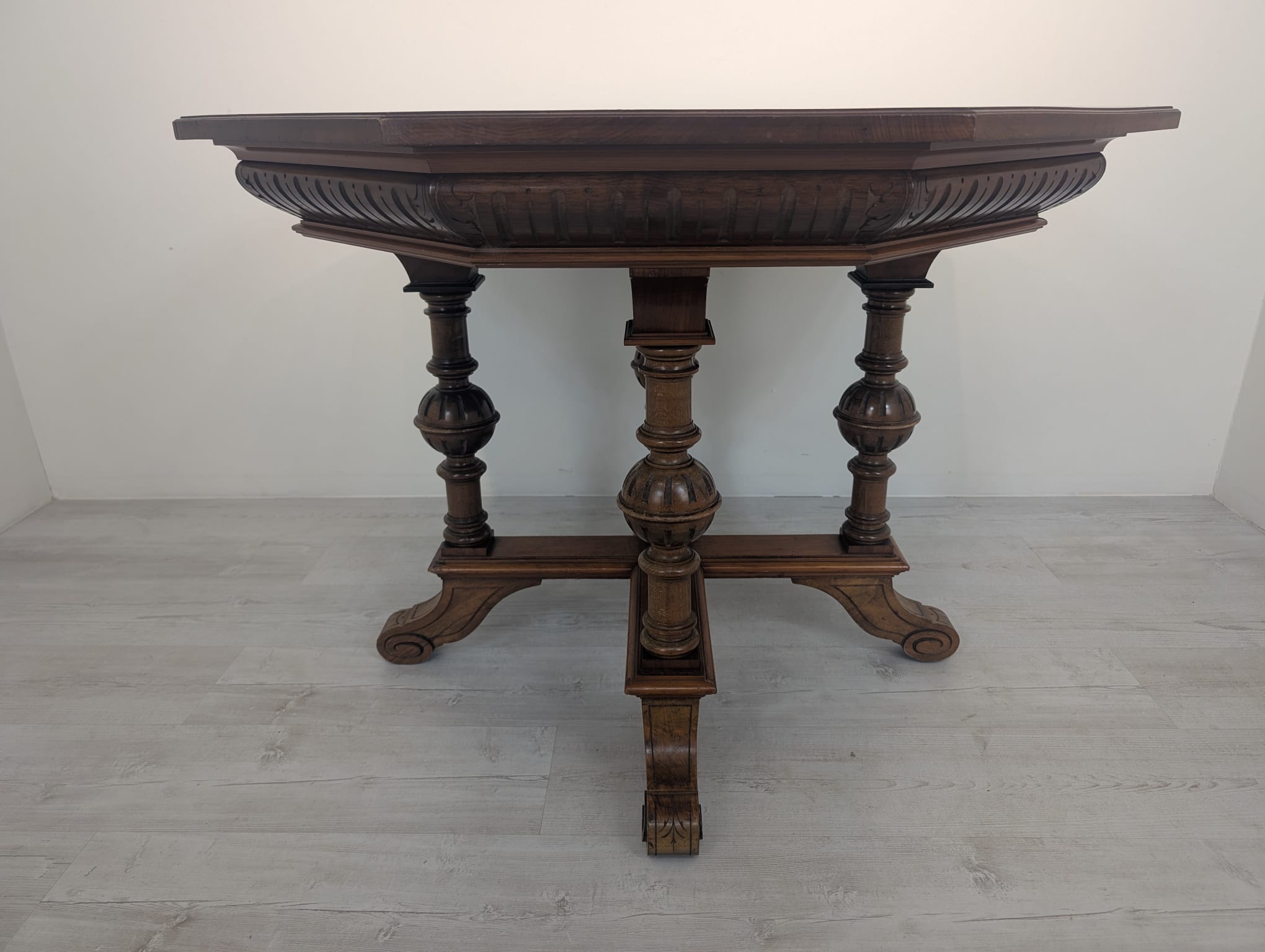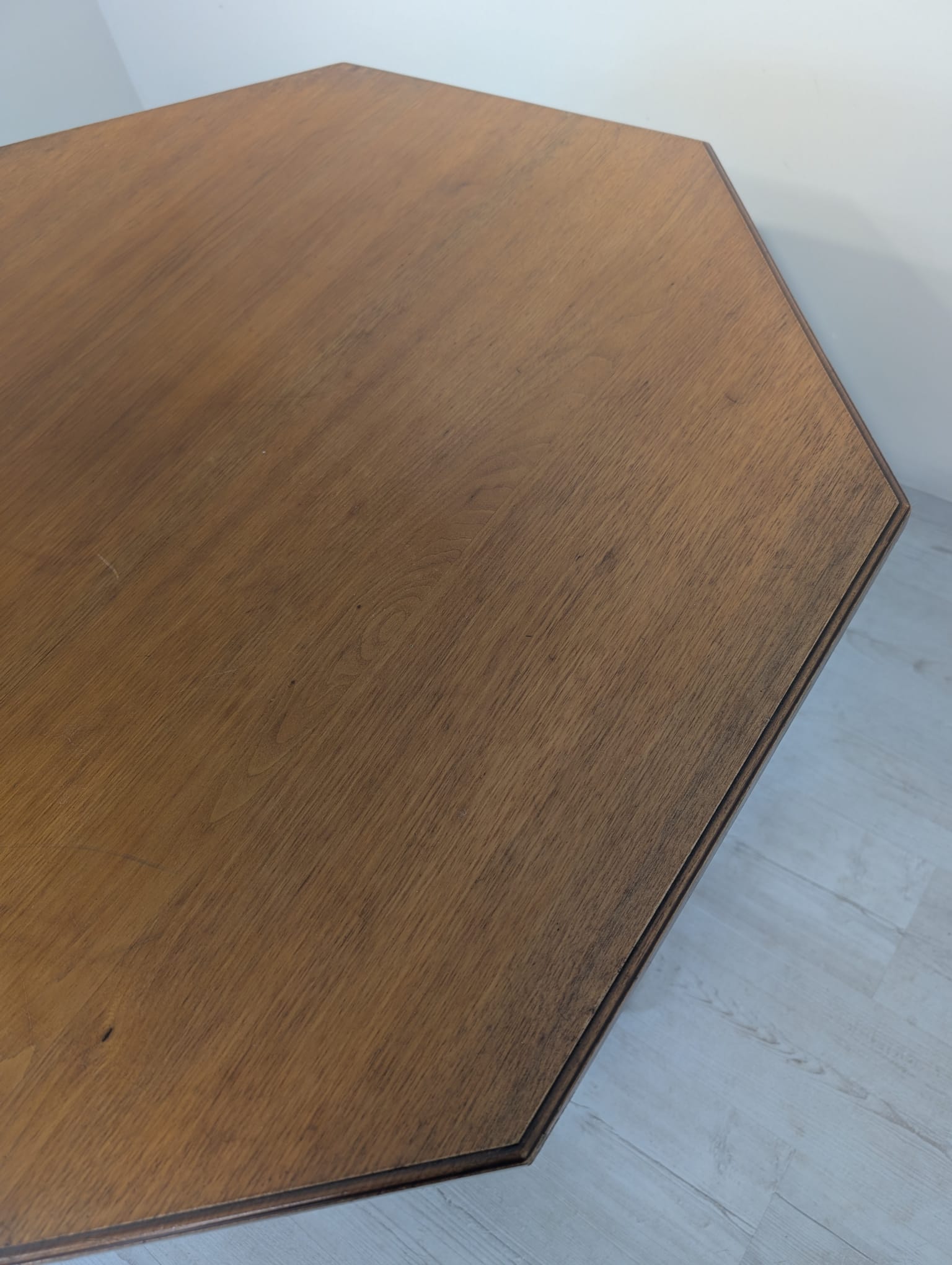 A stylish octagonal walnut wood table from the 19th century. It has a beautiful natural wood texture that gives it a unique character. This piece of furniture will be a perfect addition to a vintage or rustic interior design.