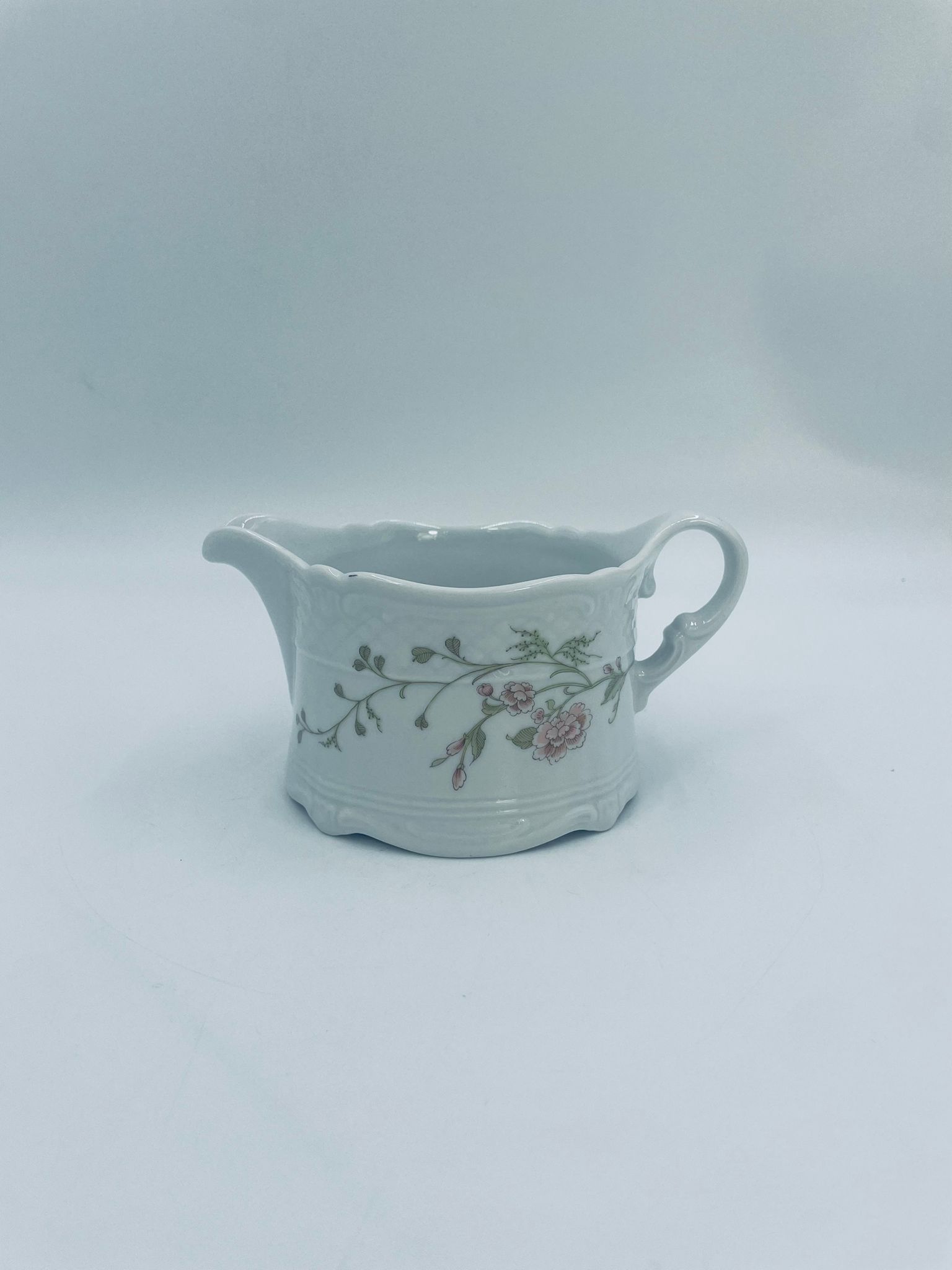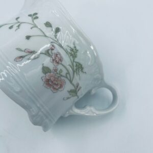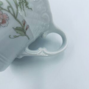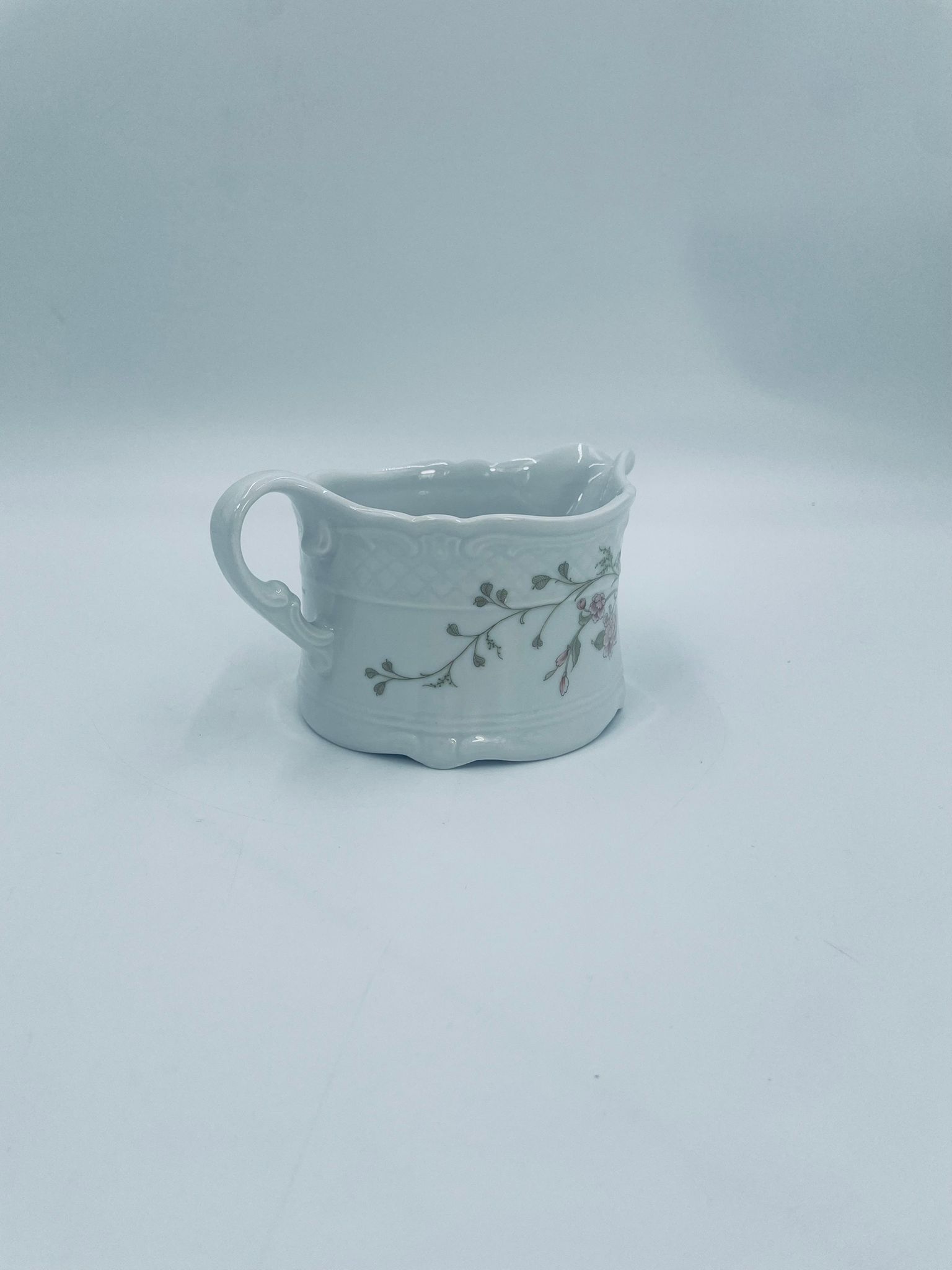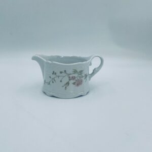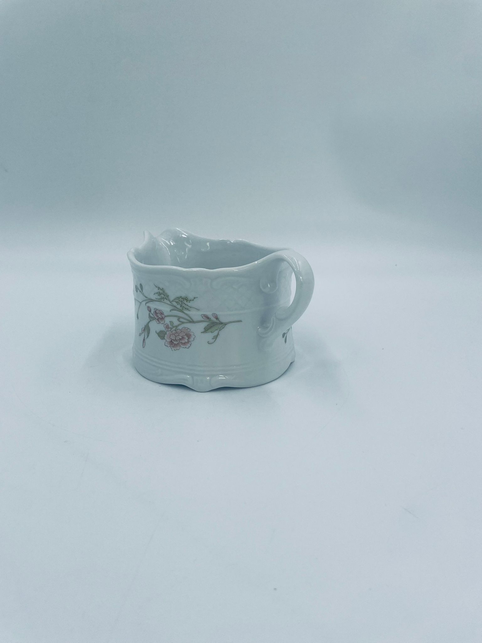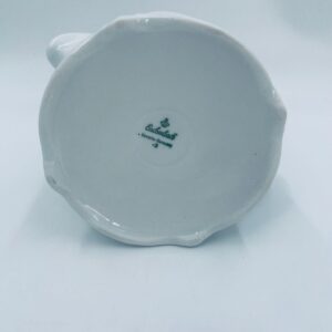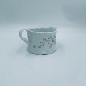 Saucepan by the Eschenbach Bavaria label, made of high-quality white porcelain. The saucepan with decorative handle, is characterised by a wavy top rim, a decorative relief pattern and a delicate pattern of pink flowers with green leaves.