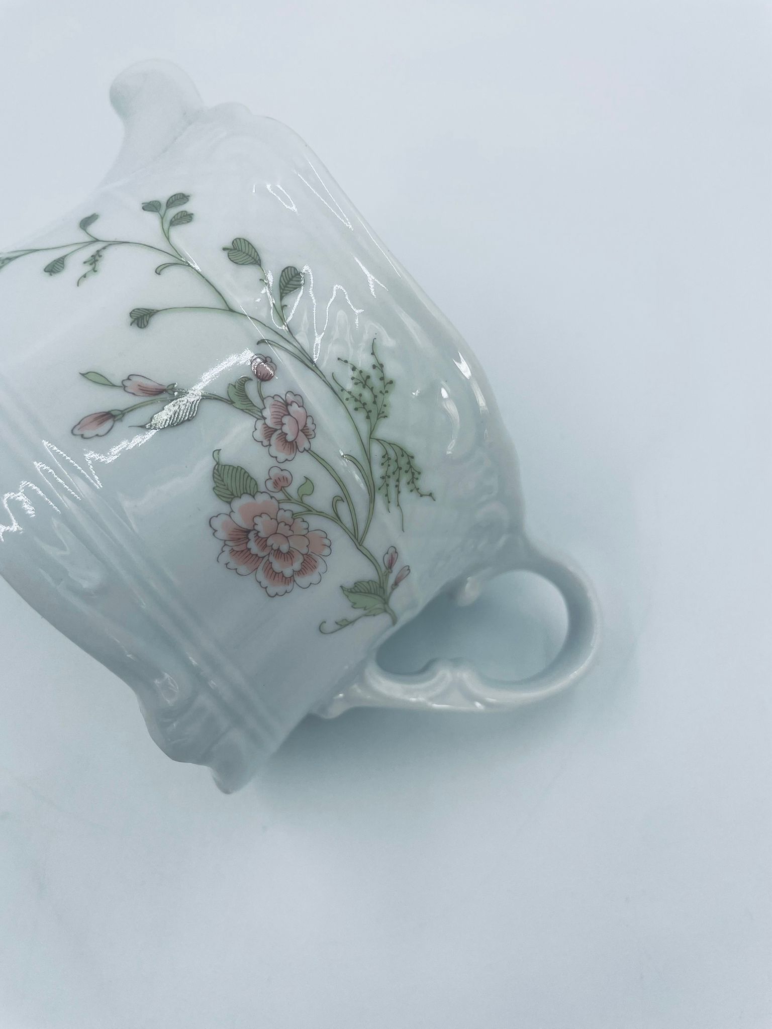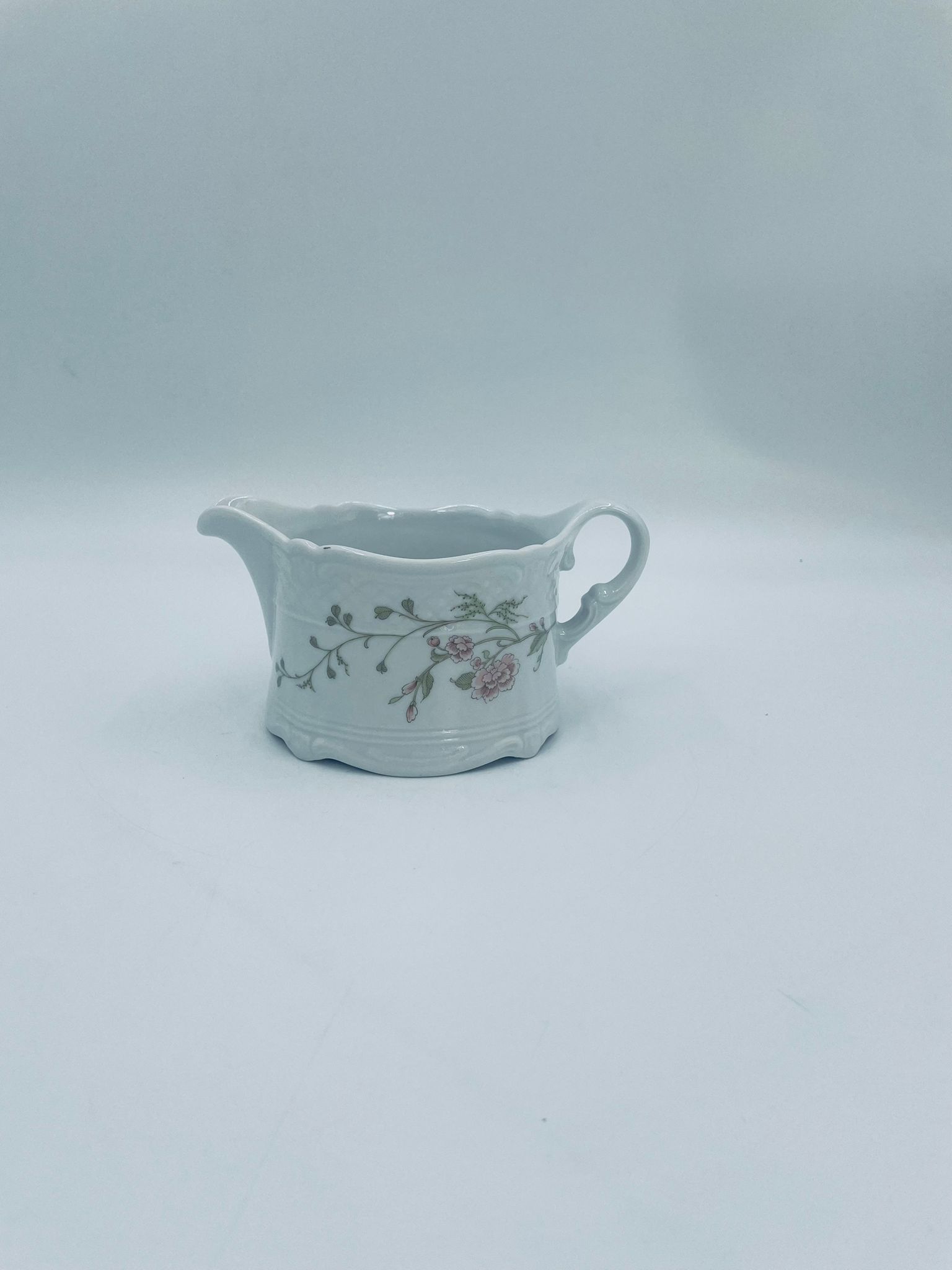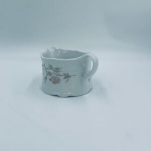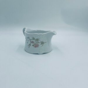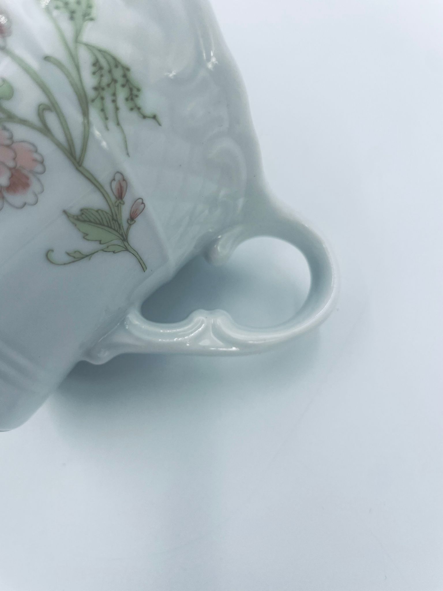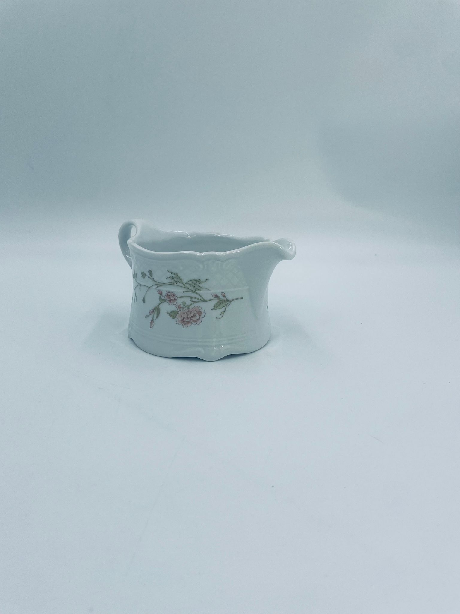Saucepan by the Eschenbach Bavaria label, made of high-quality white porcelain. The saucepan with decorative handle, is characterised by a wavy top rim, a decorative relief pattern and a delicate pattern of pink flowers with green leaves.