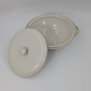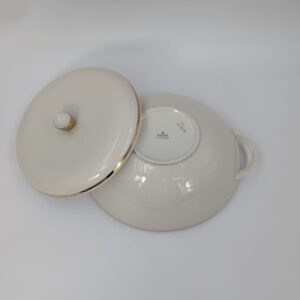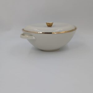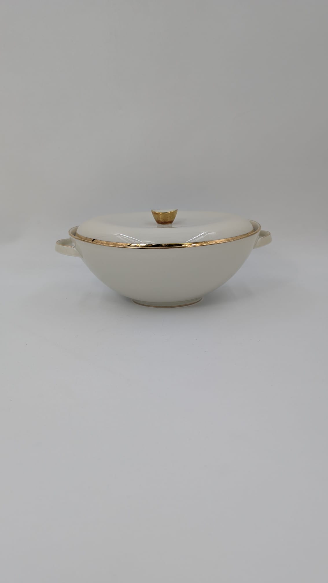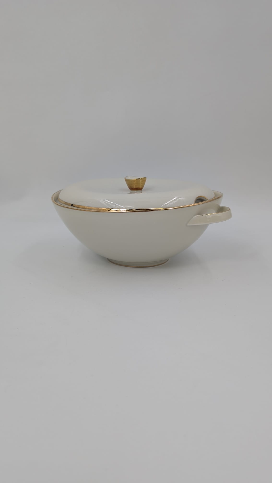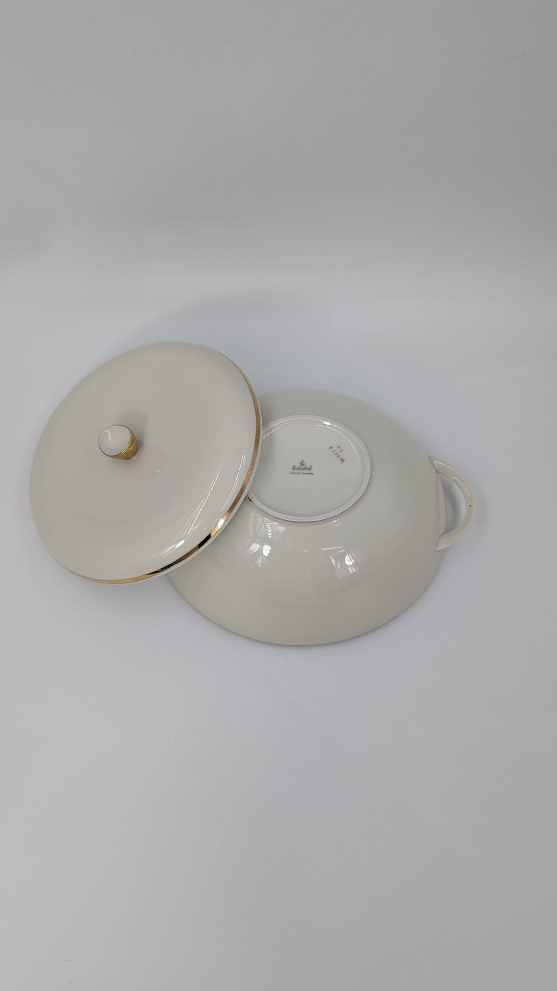 Soup tureen by Eschenbach, made of high-quality ecru porcelain. Tureen with lid and two handles, classic, elegant, finished with gilding on the rims. It has delicate abrasions on the gilding.