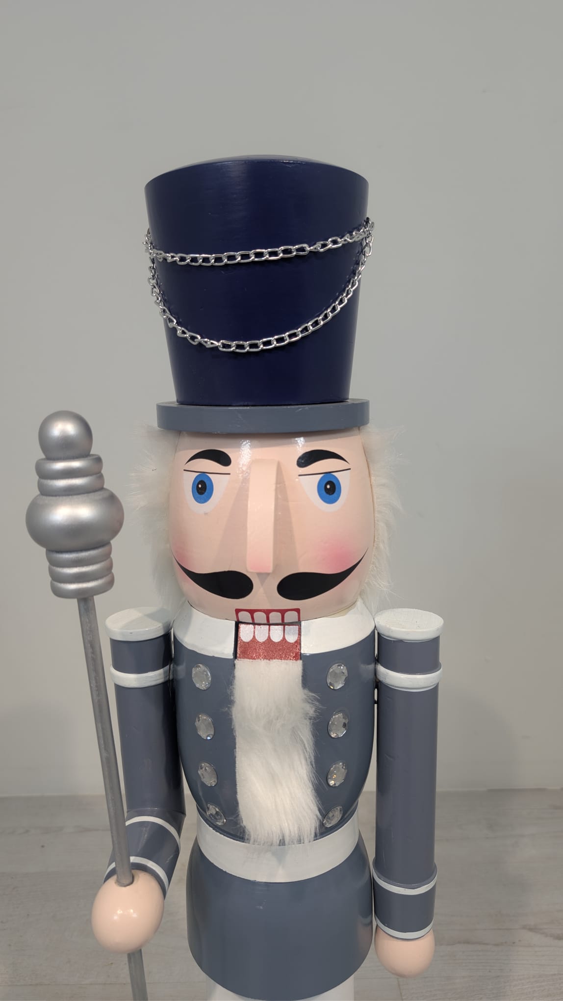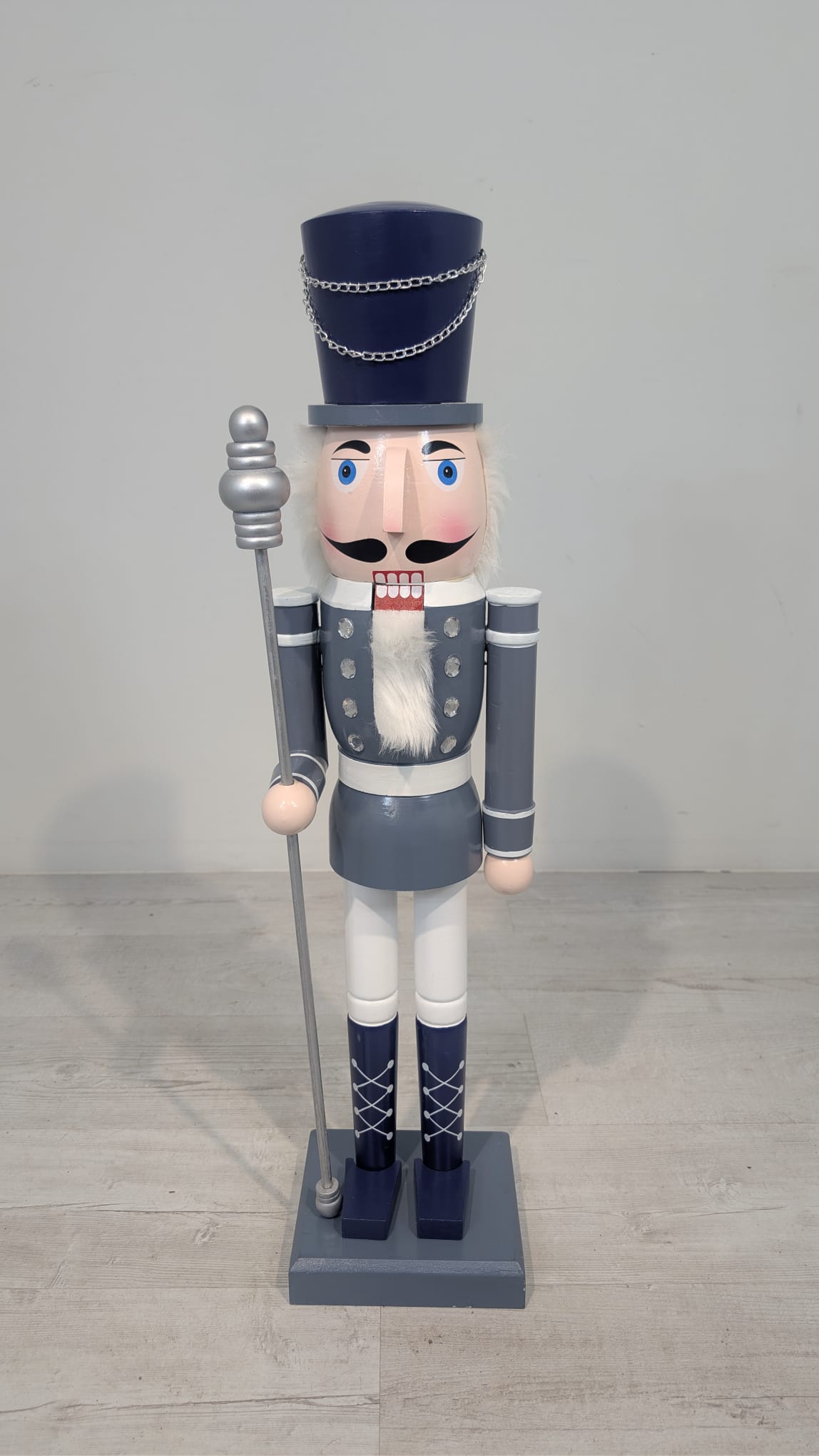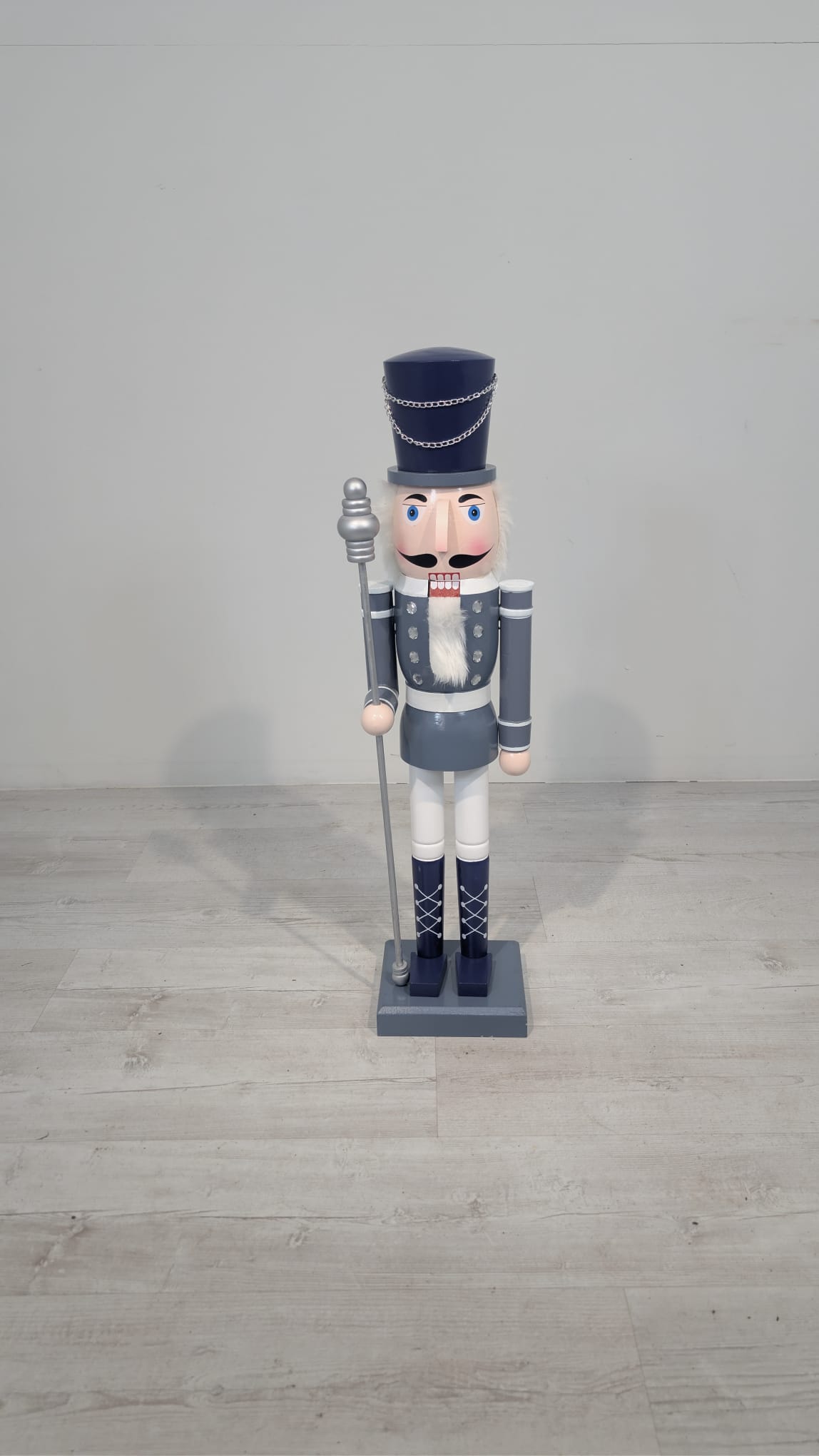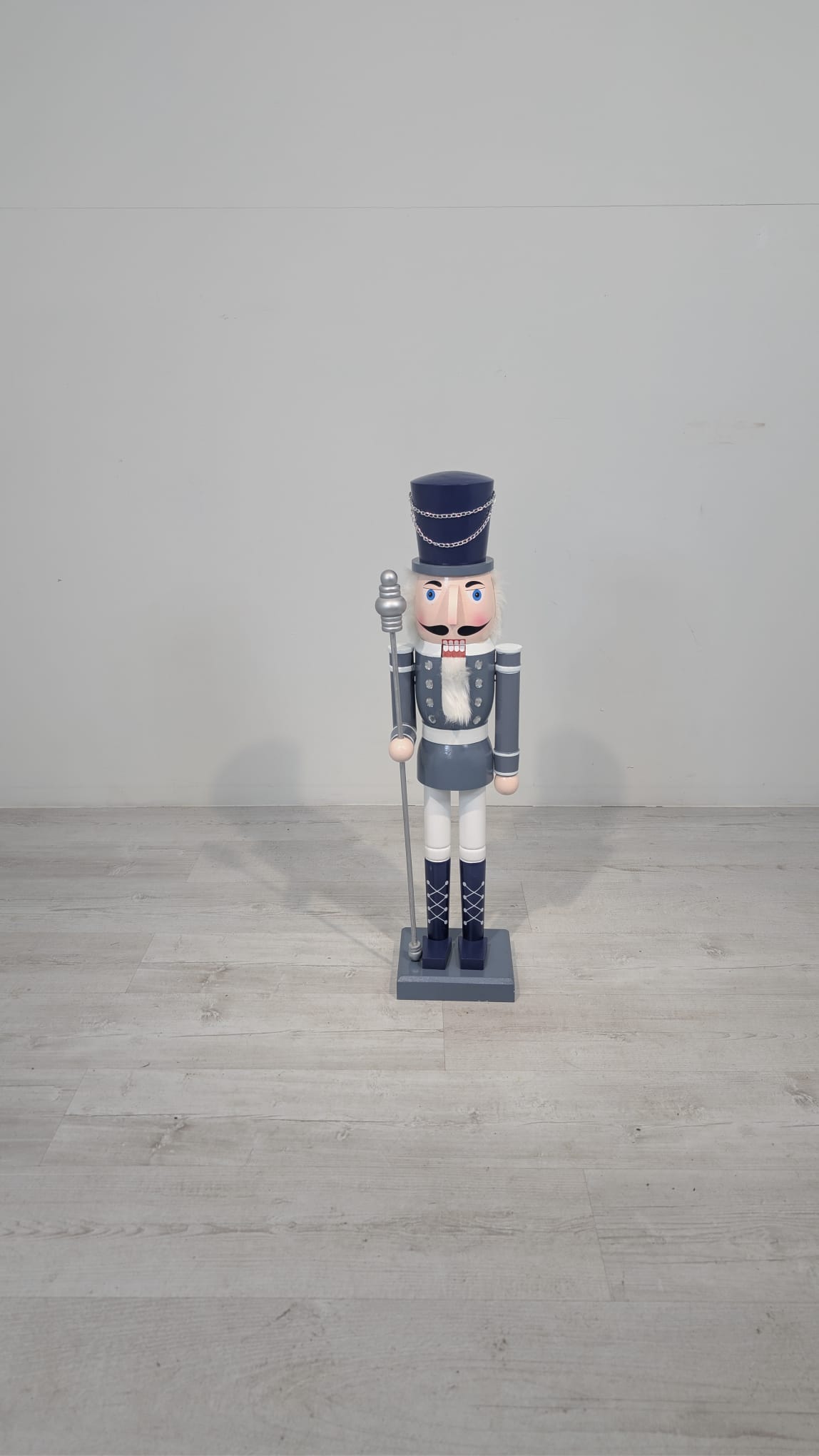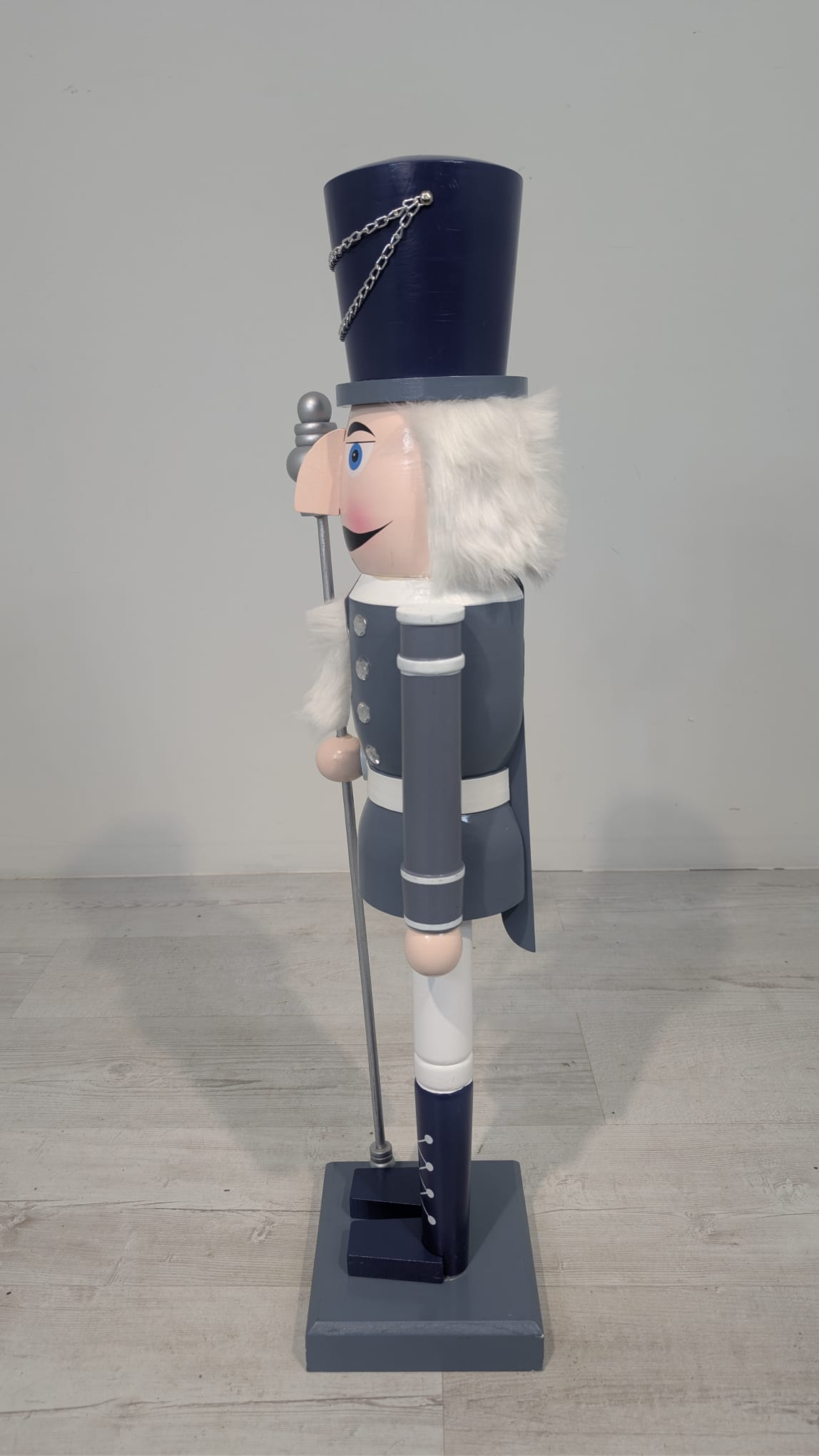 Figurka drewnianego dużego orzechołamacza w eleganckim granatowym mundurze. Zabawka świąteczna, idealna na prezent lub dekorację domu w okresie bożonarodzeniowym.