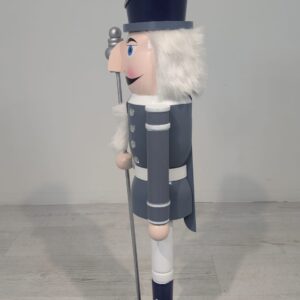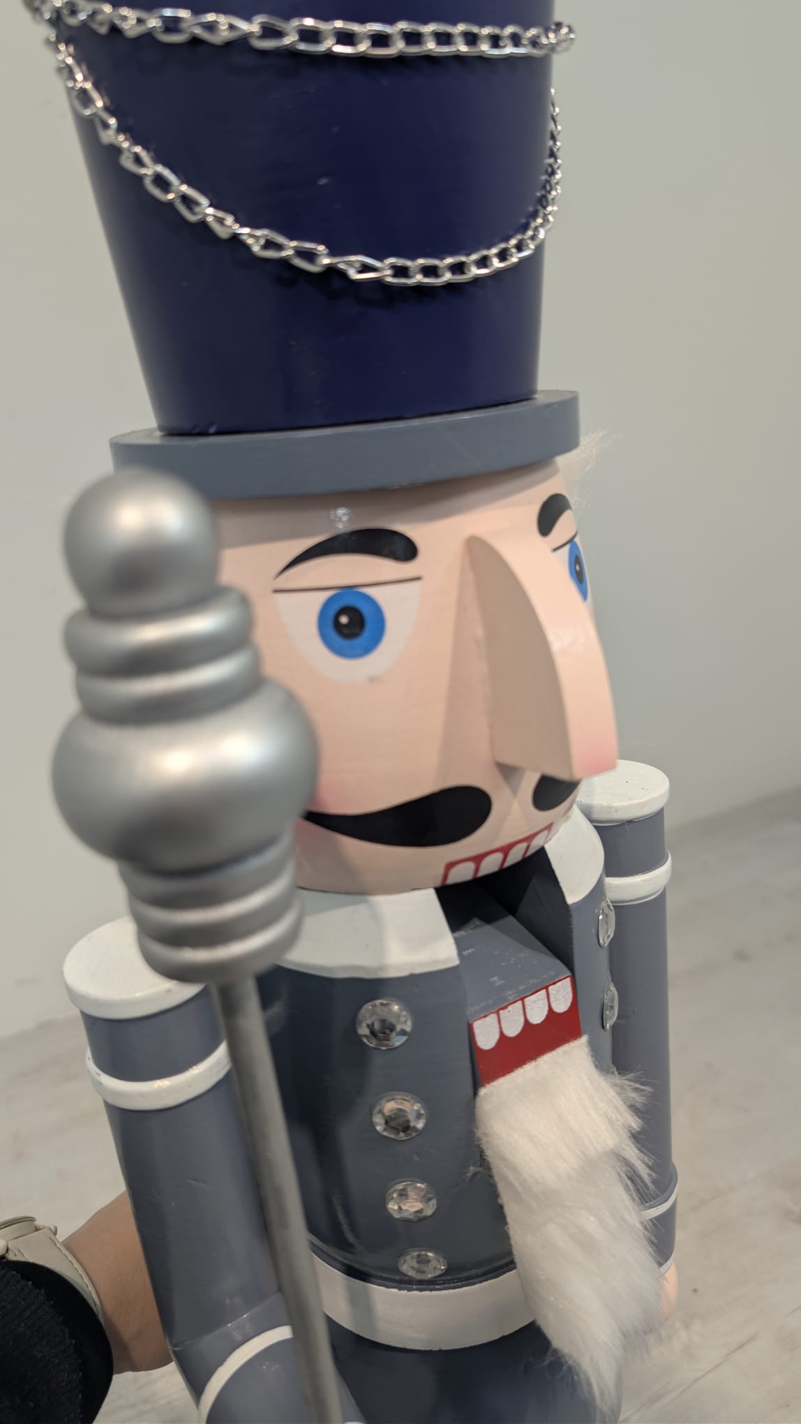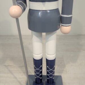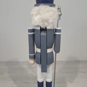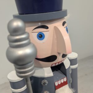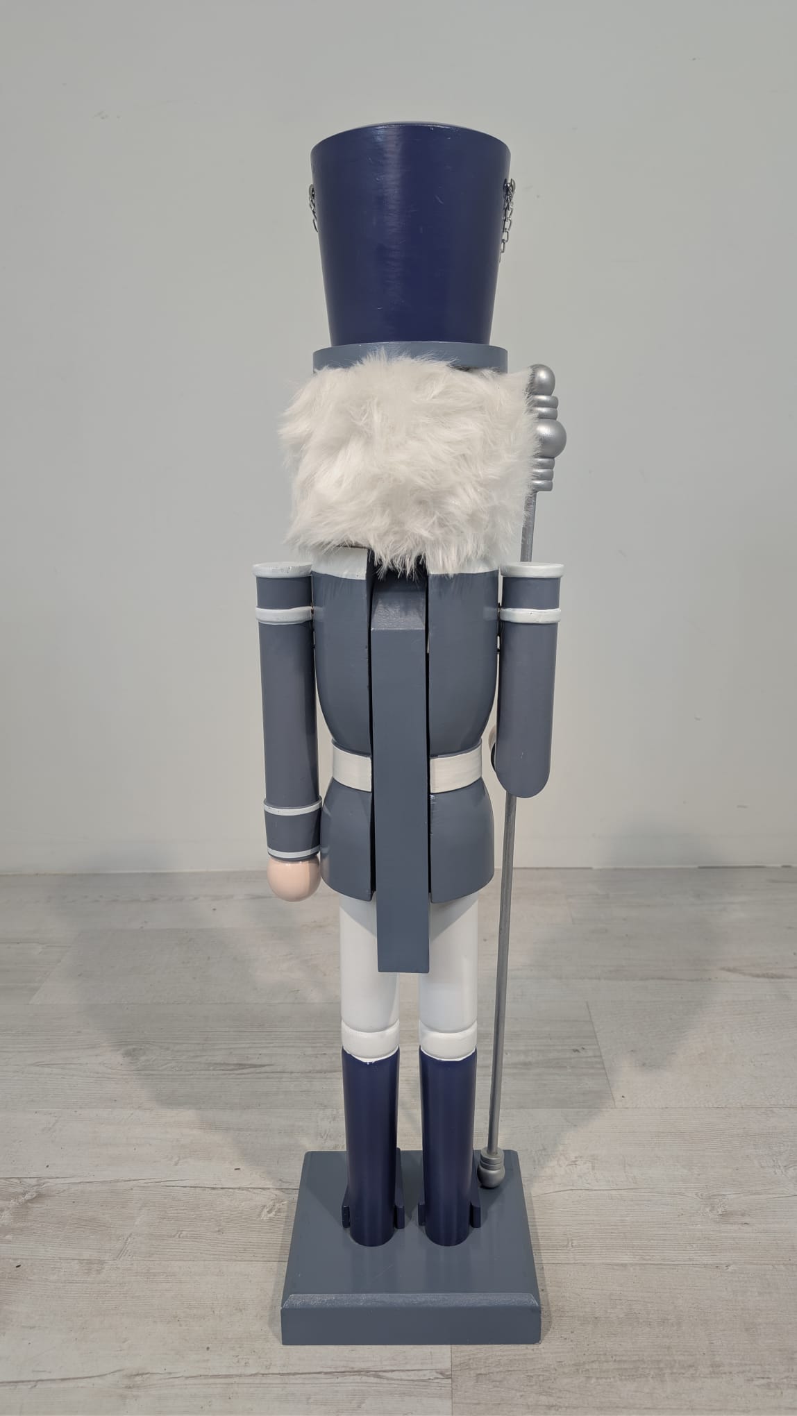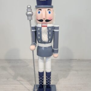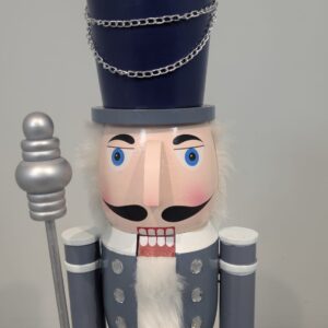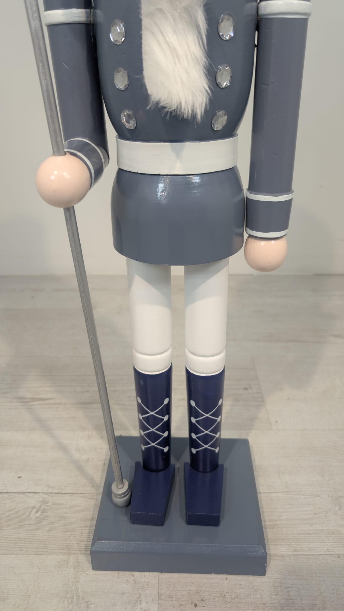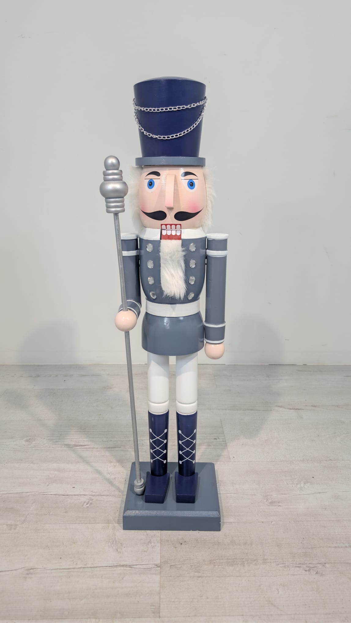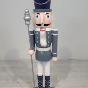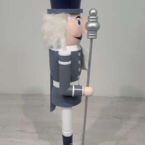 Figurka drewnianego dużego orzechołamacza w eleganckim granatowym mundurze. Zabawka świąteczna, idealna na prezent lub dekorację domu w okresie bożonarodzeniowym.
