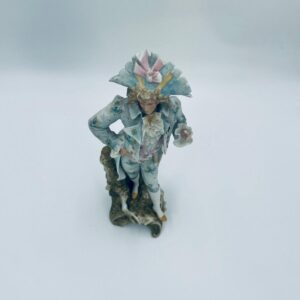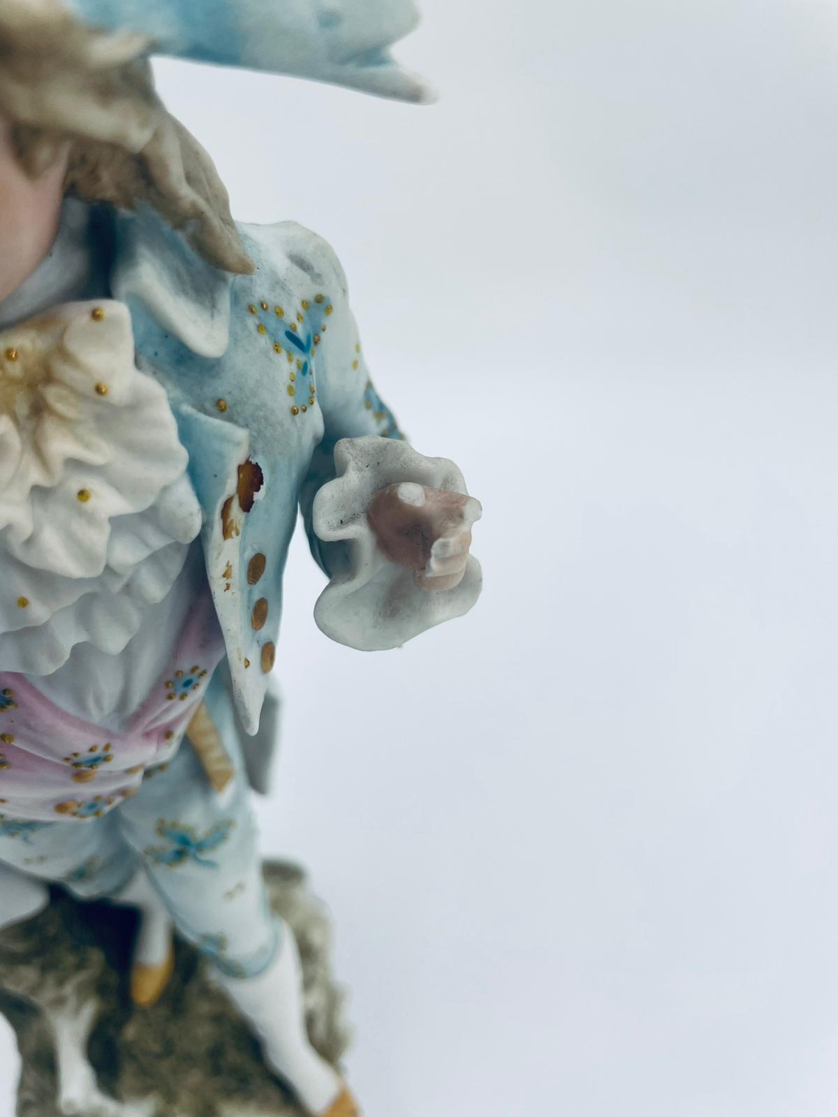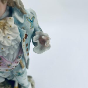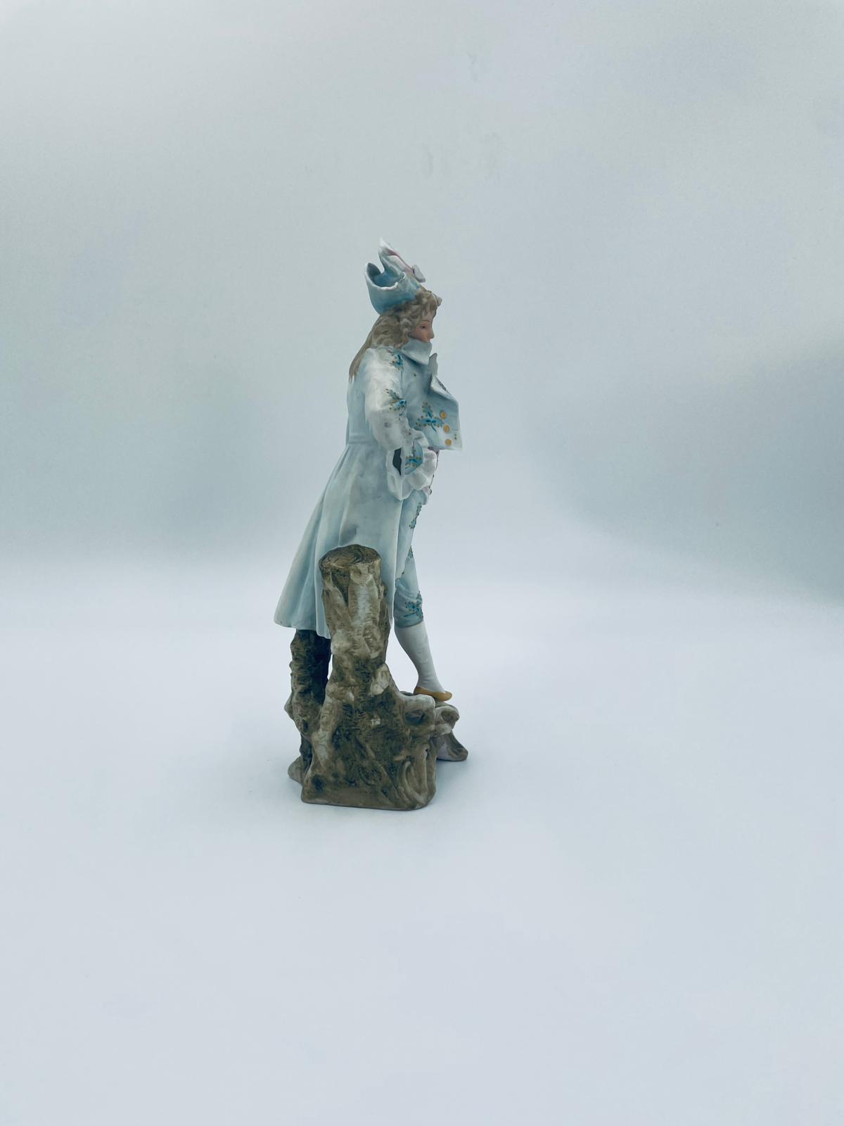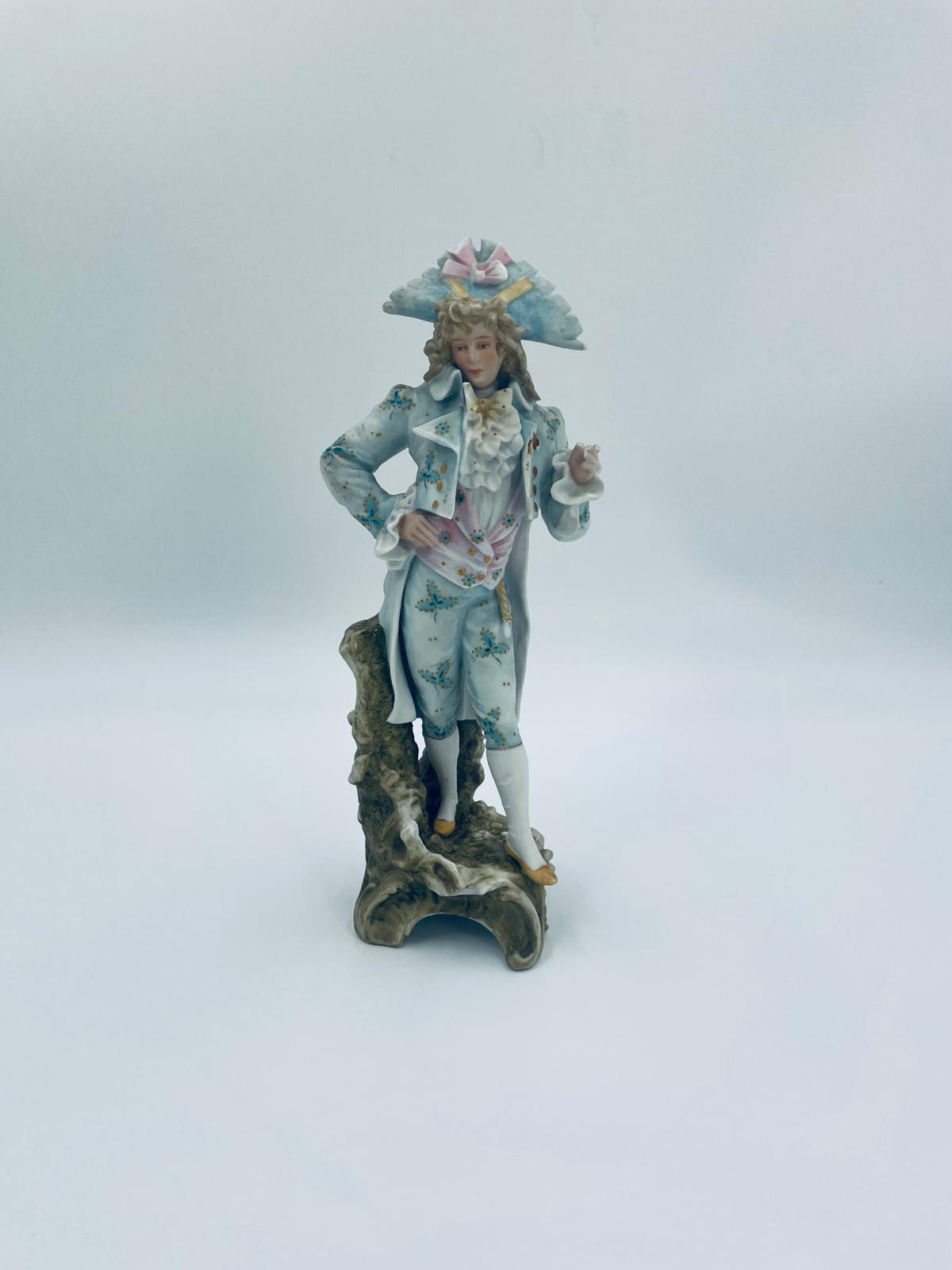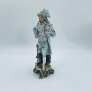 Figurka kolekcjonerska w stylu Vintage, wykonana z wysokiej jakości porcelany biskwitowej. Figurka przedstawia mężczyznę ubranego w jasnoniebieski strój w stylu rokoko, charakteryzujący się eleganckim liściastym wzorem ze złotymi akcentami i falbanami oraz trójkątny kapelusz. Figurka posiada uszczerbki.
