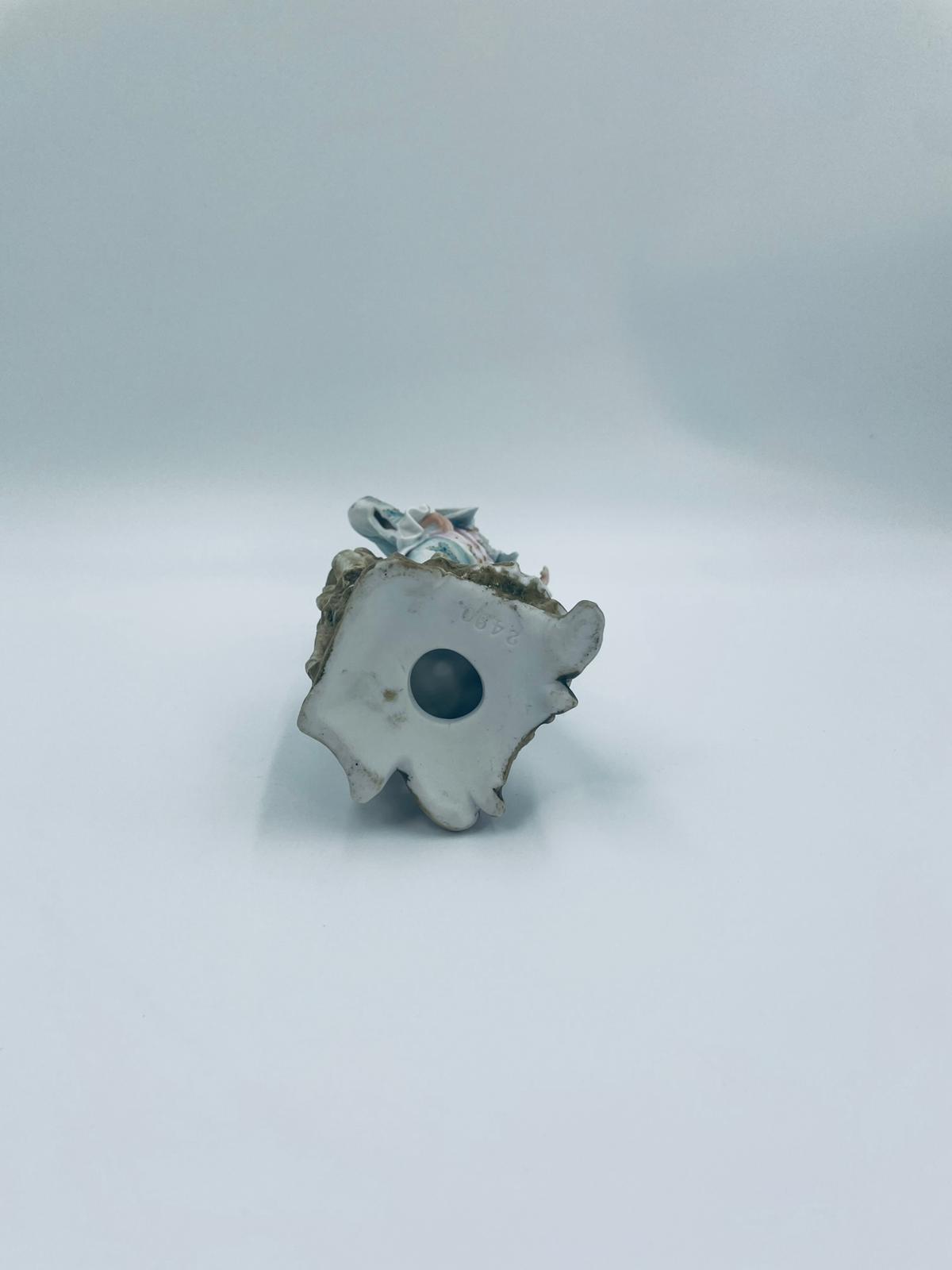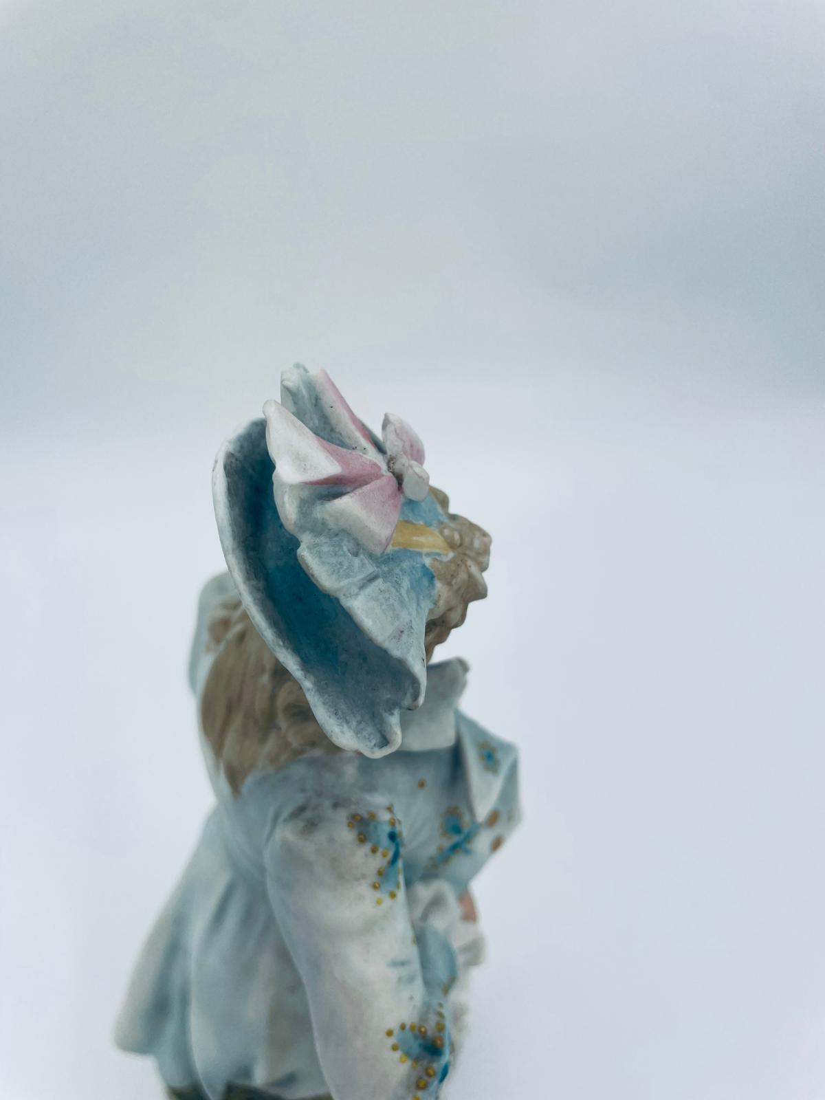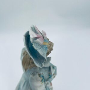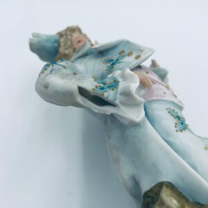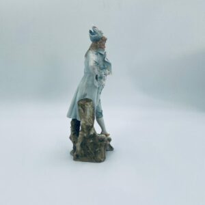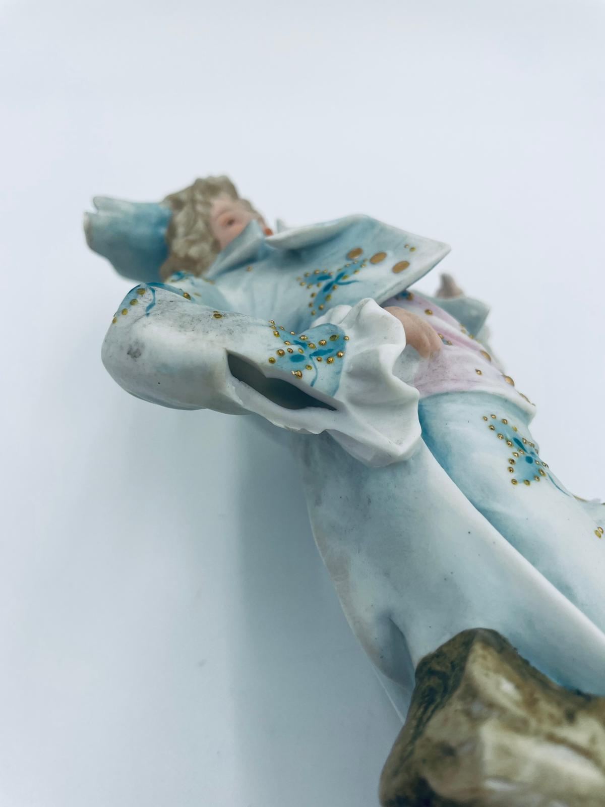 Figurka kolekcjonerska w stylu Vintage, wykonana z wysokiej jakości porcelany biskwitowej. Figurka przedstawia mężczyznę ubranego w jasnoniebieski strój w stylu rokoko, charakteryzujący się eleganckim liściastym wzorem ze złotymi akcentami i falbanami oraz trójkątny kapelusz. Figurka posiada uszczerbki.